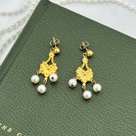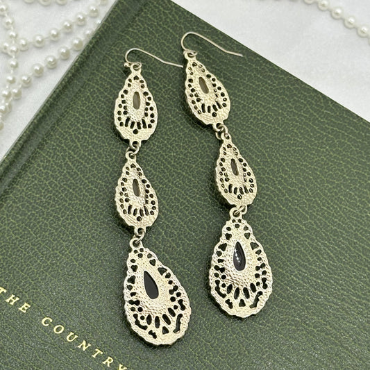 Silver Vintage Dangle Earrings with Black and Tan Stones