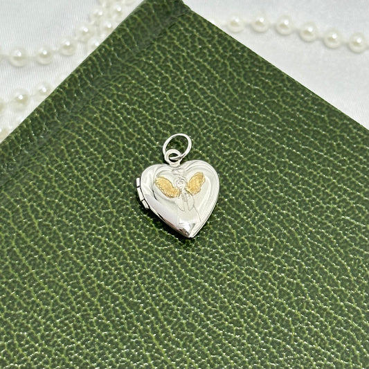 Dainty Vintage Two-Tone Sterling Silver Heart Locket with Engraved Little Angel