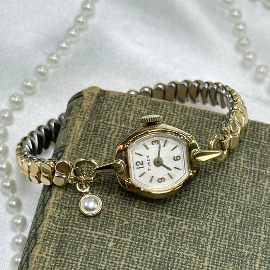 Dainty Vintage Gold Timex Wind-Up Watch with Pearl Charm