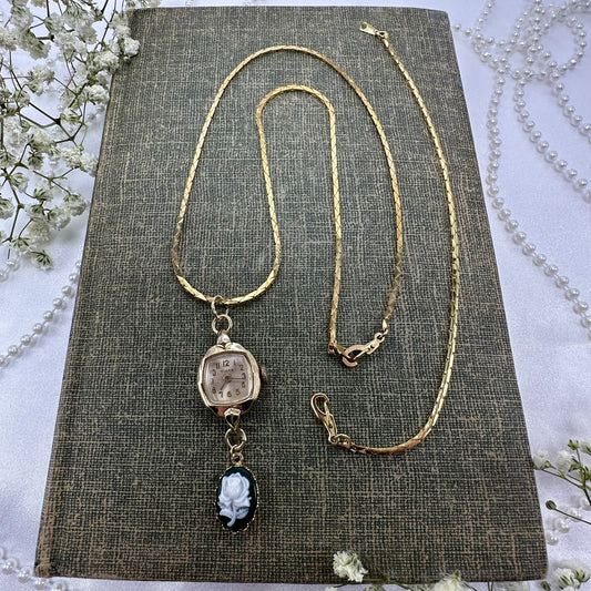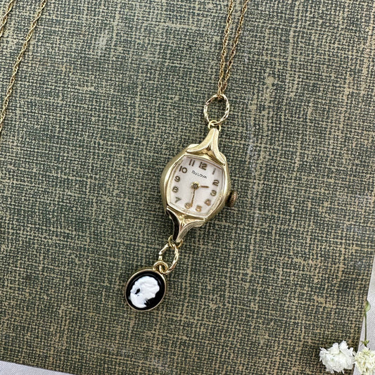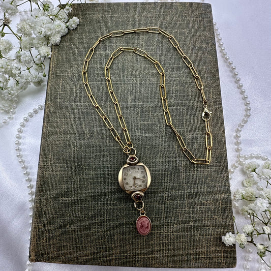 Vintage Ruby Accented Watch Necklace with Cameo Charm