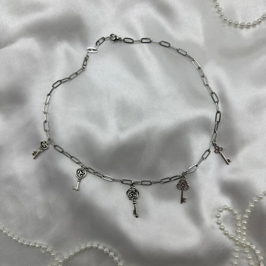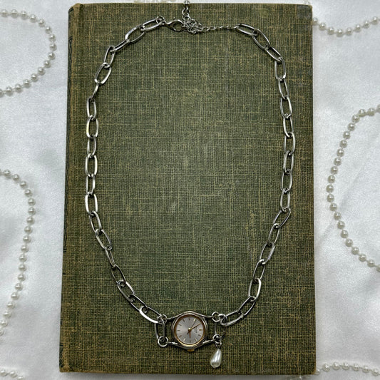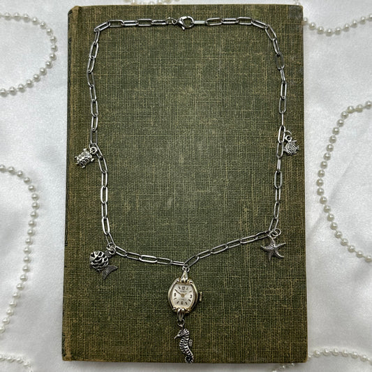 Silver Lariat Necklace with Vintage Watch and Ocean Charms