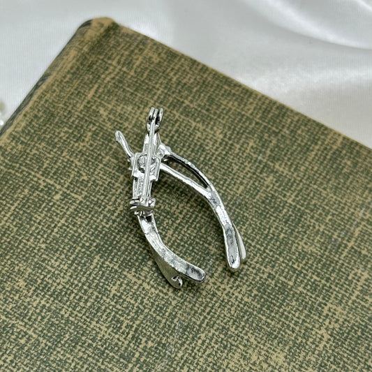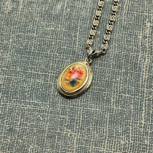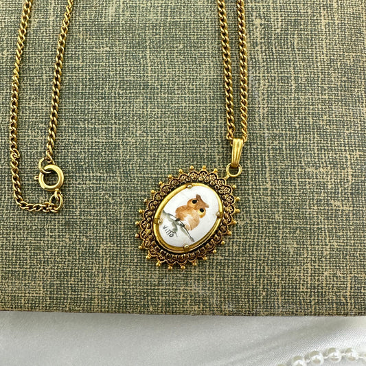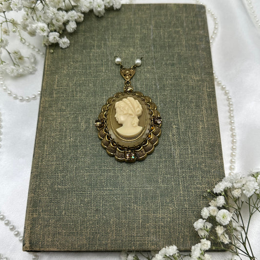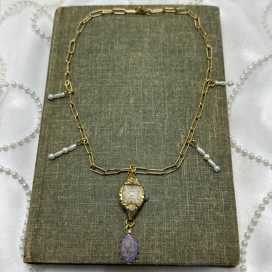 Vintage Watch Necklace with Purple Rose Cameo Charm & Pearls