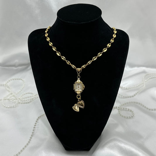 Gold Choker with Vintage Watch Pendant and Removeable Heart Locket
