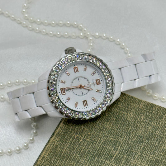 White Diamanté Dial Watch with Rose Gold Roman Numeral Markers