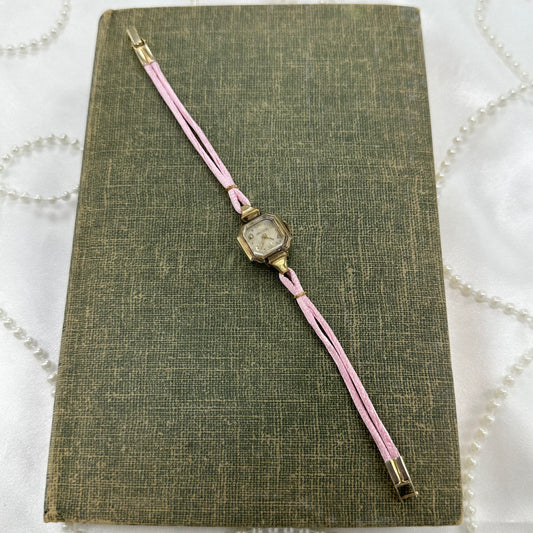 Vintage Gold Wind-Up Cocktail Watch with Satin Pink Band