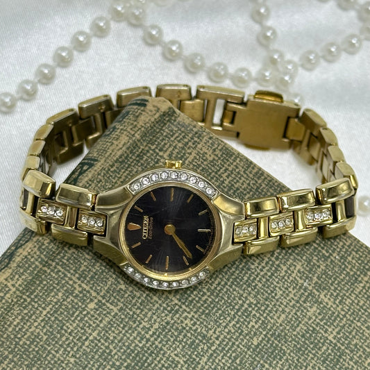 Gold Vintage Diamanté Citizen Black Dial Watch