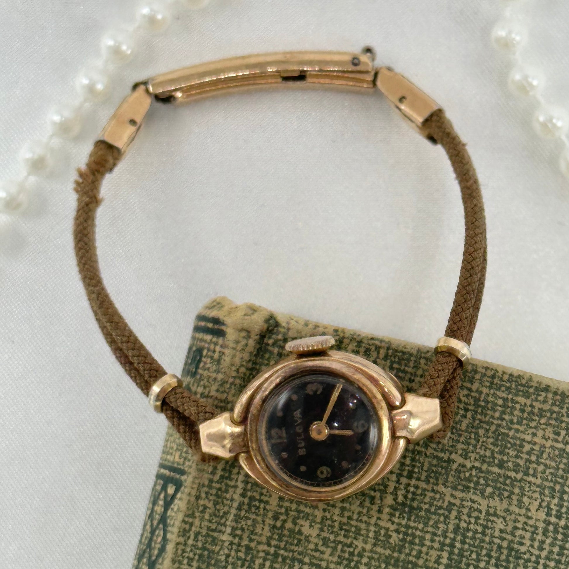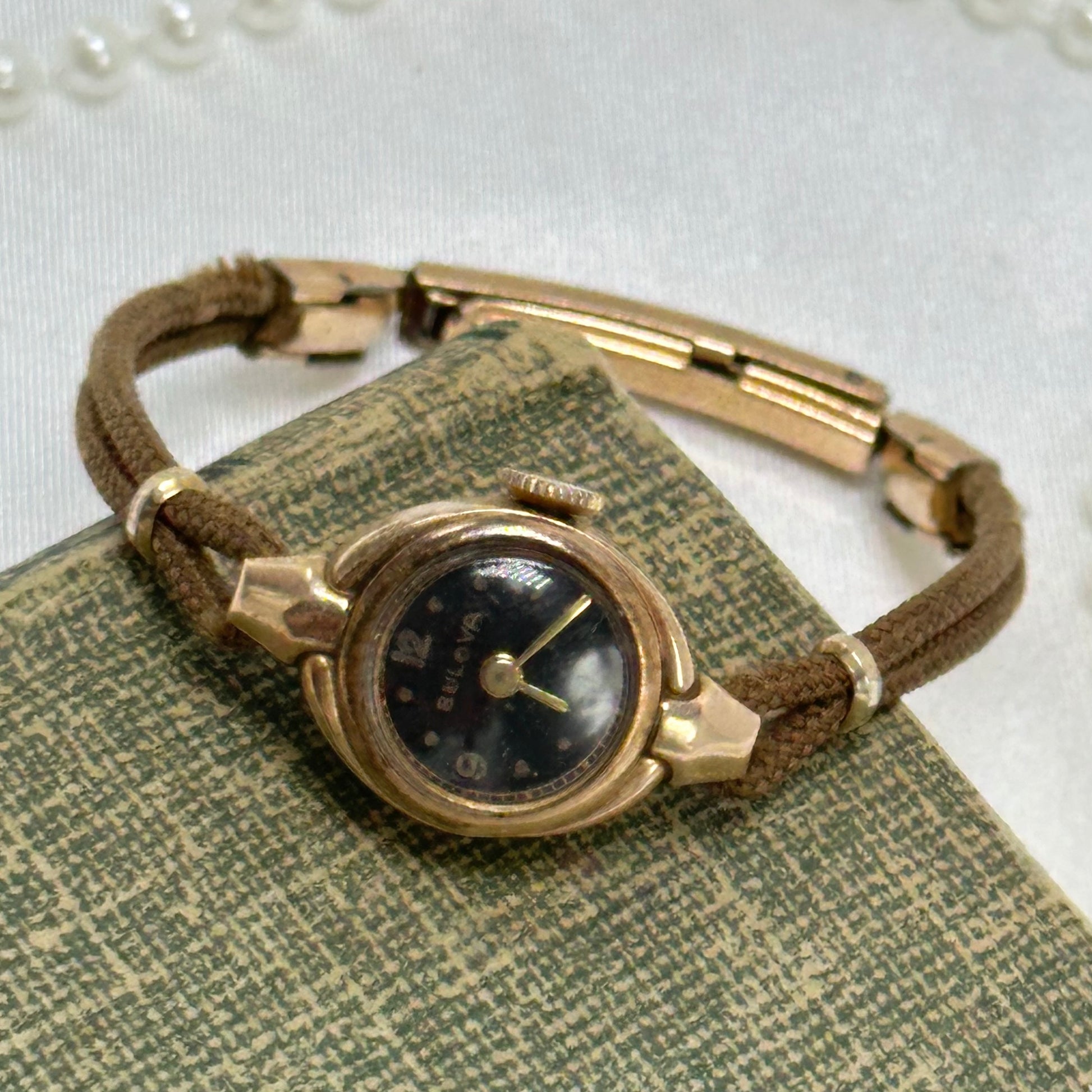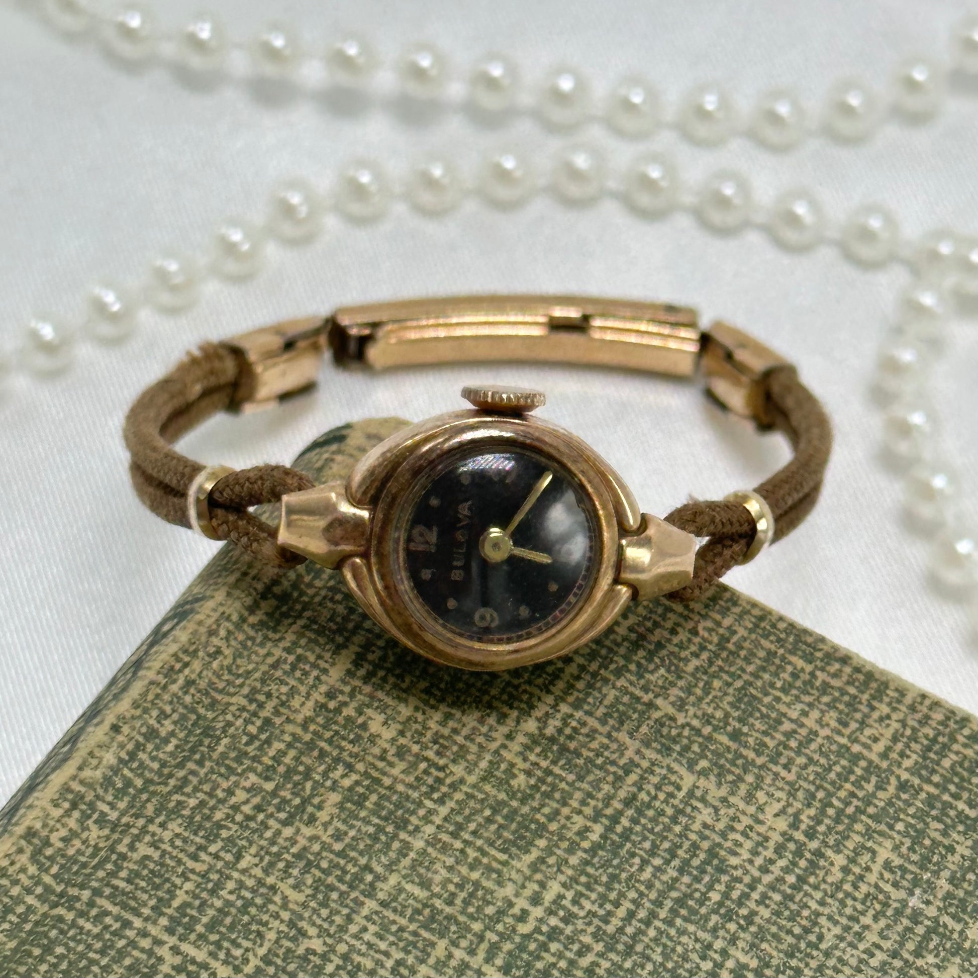 Vintage 14k gold bezel Bulova manual winding watch with dainty black dial and soft brown band. Clasp is 12k gold filled.