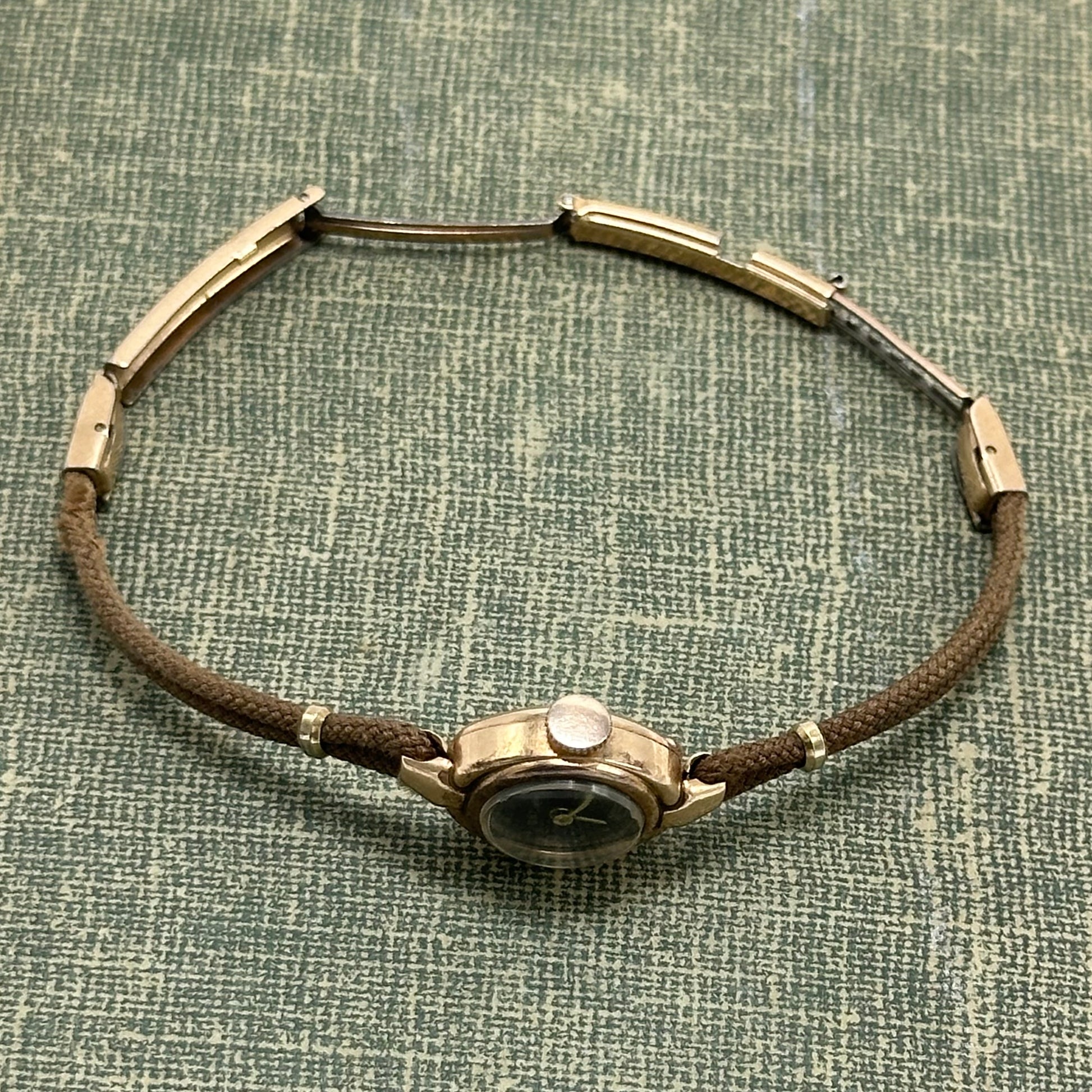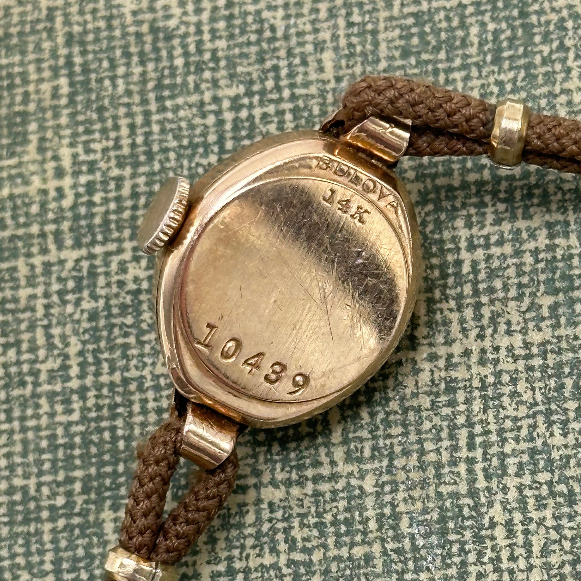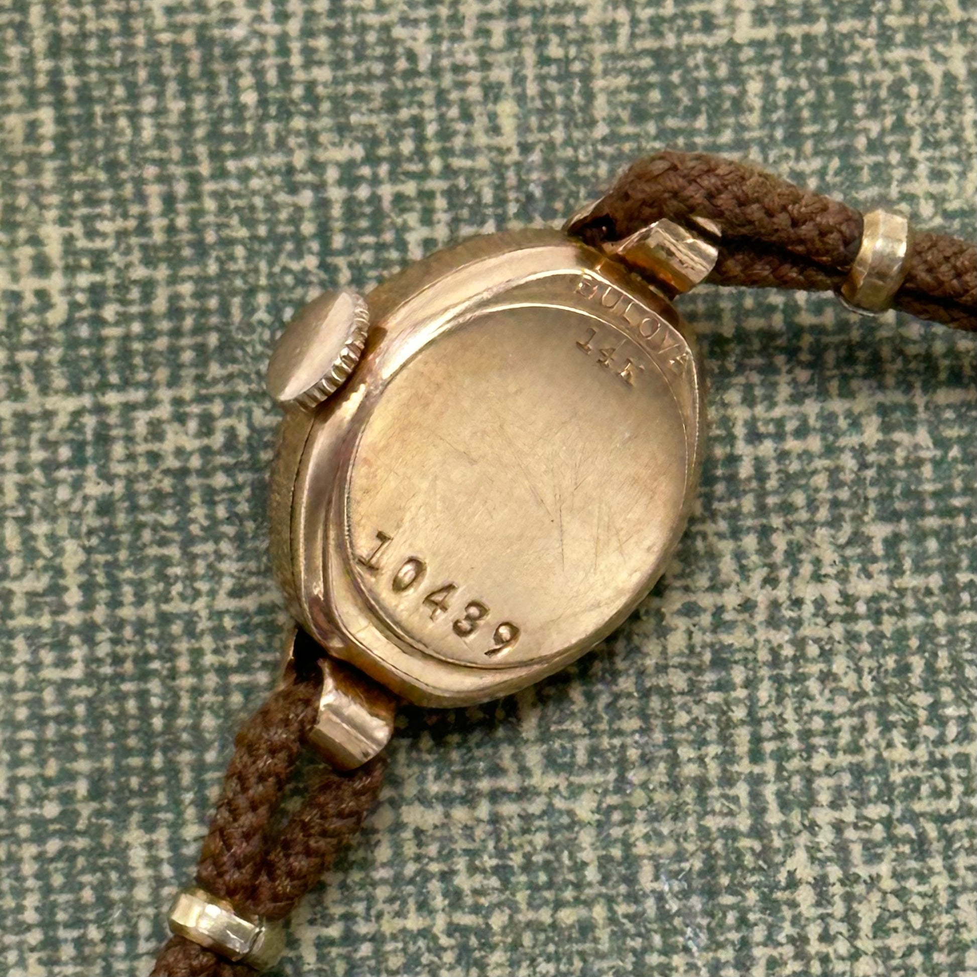 Vintage 14k gold bezel Bulova manual winding watch with dainty black dial and soft brown band. Clasp is 12k gold filled.