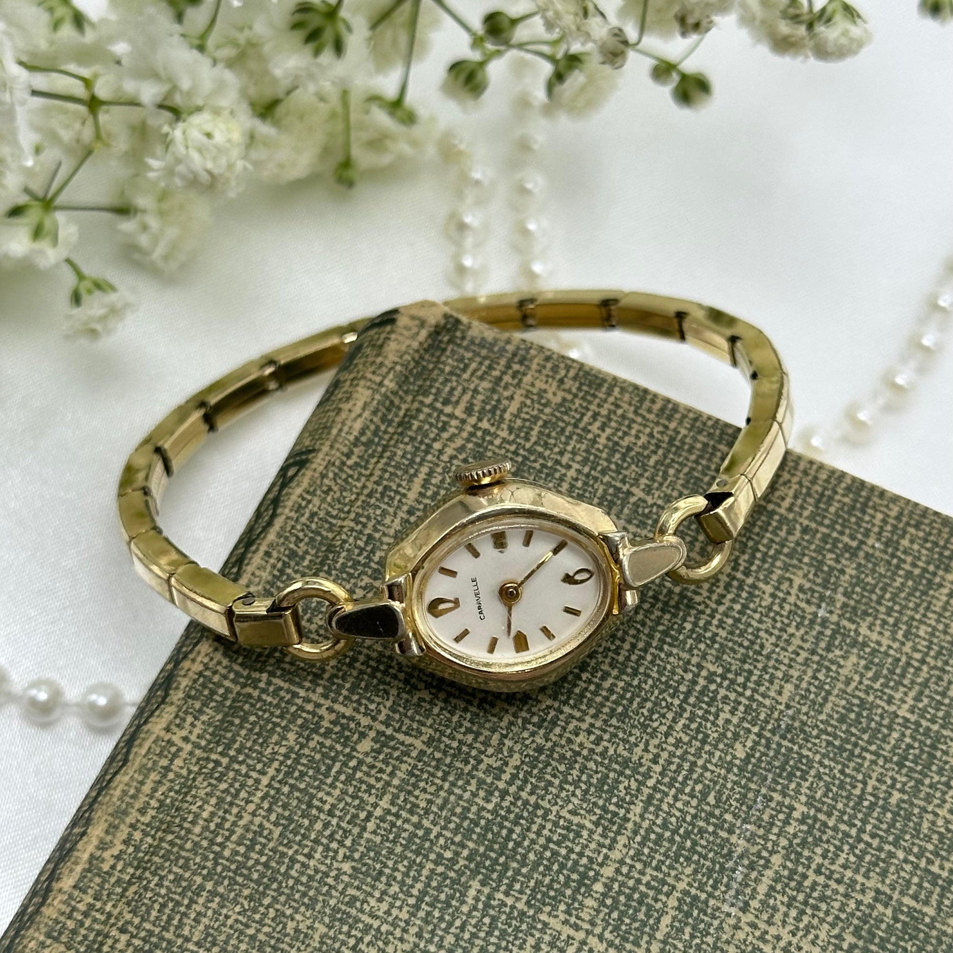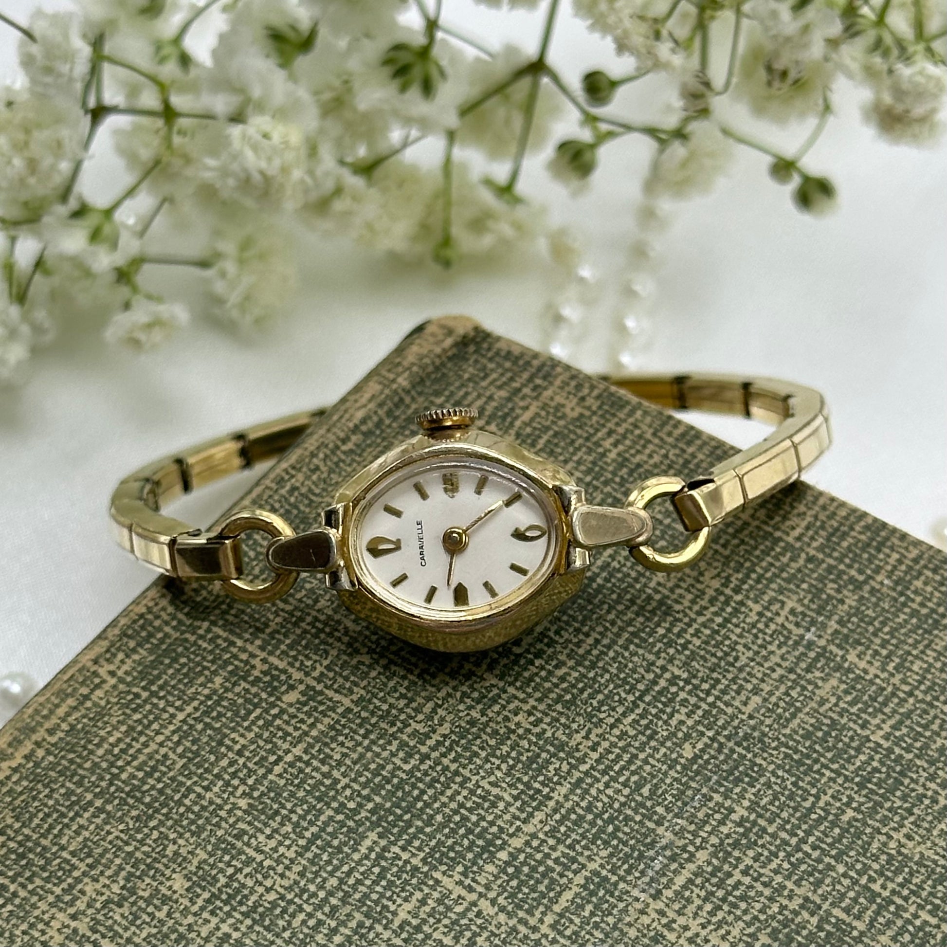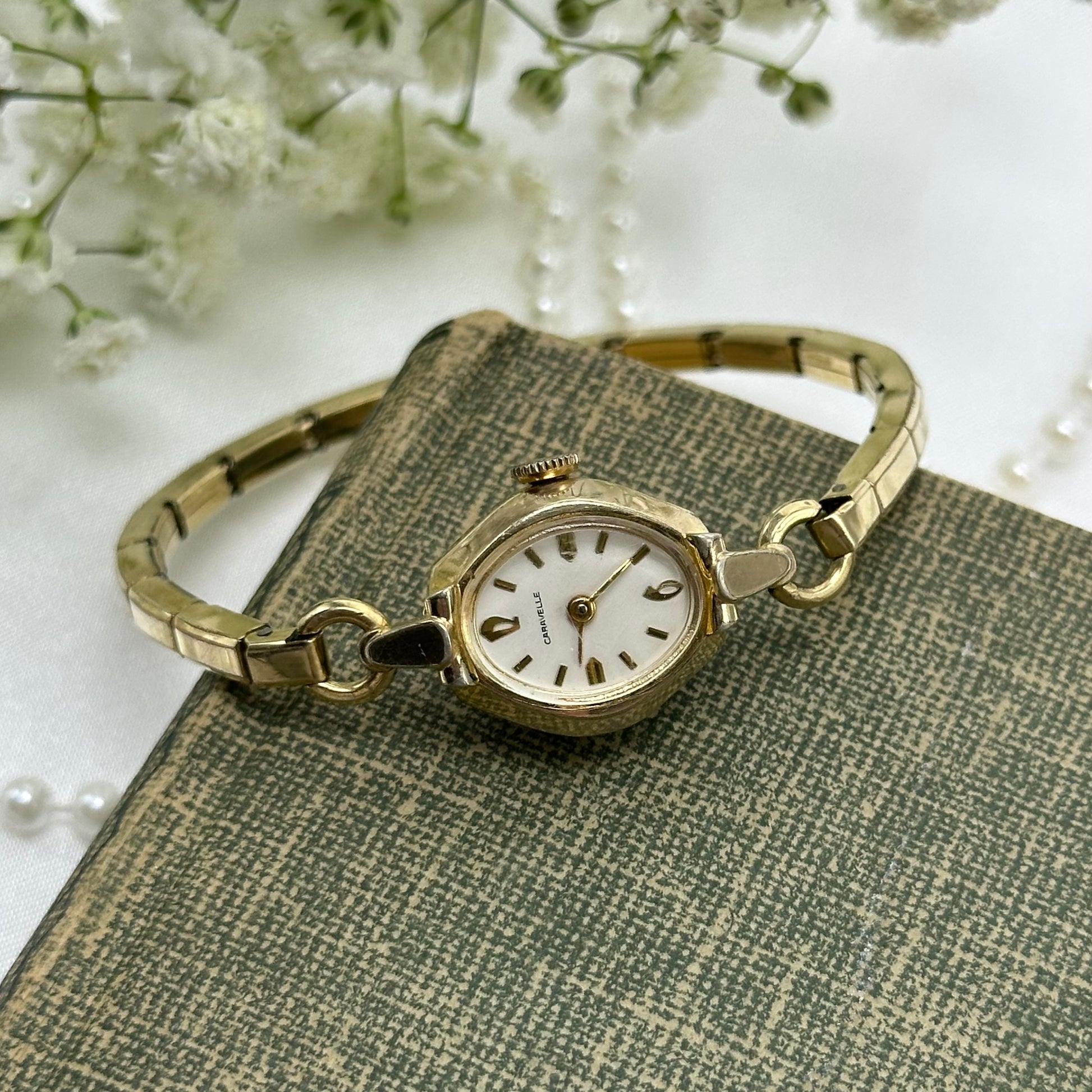Vintage gold tone Caravelle by Bulova manual winding watch with stretchable band from the 1960's. Watch comes with original C crown.