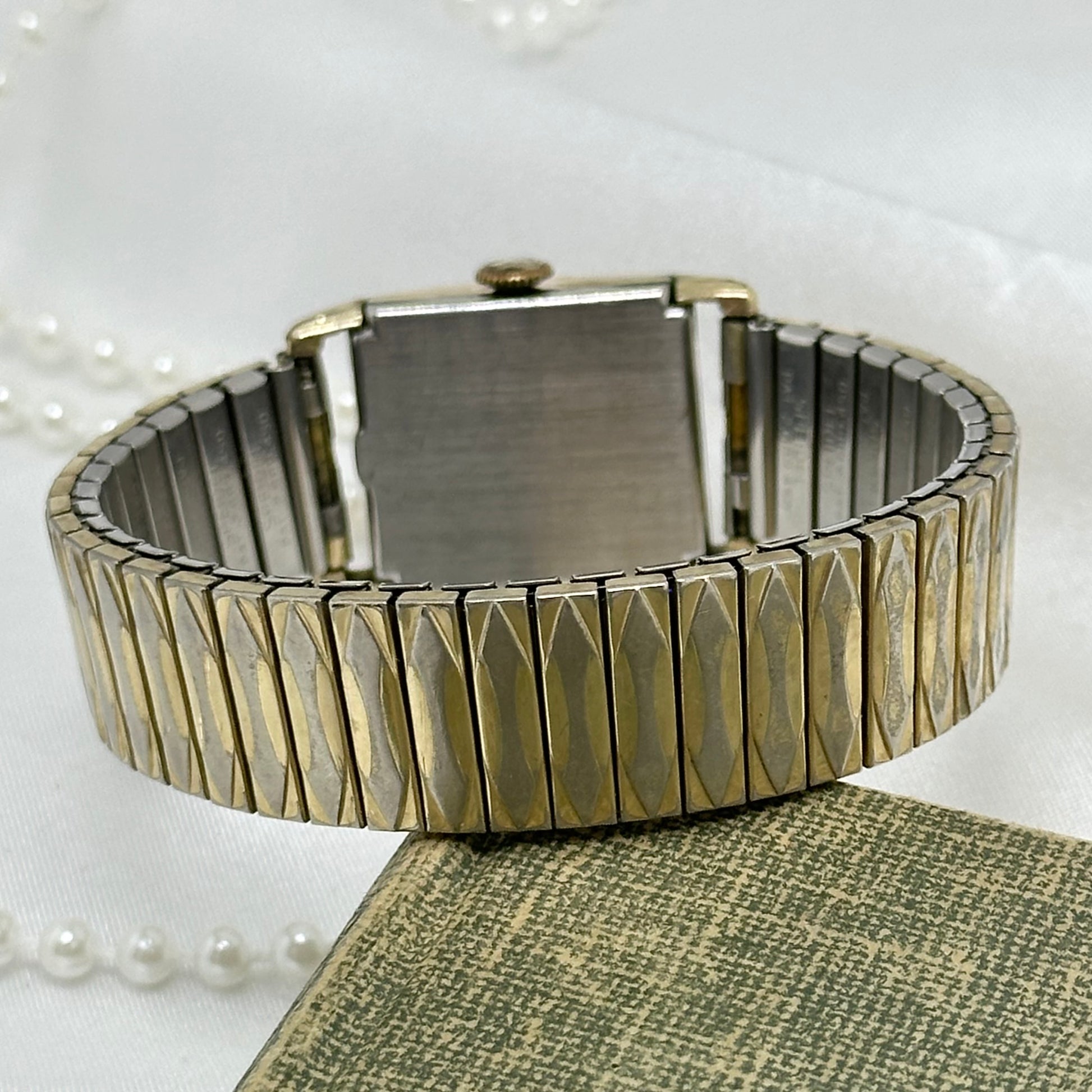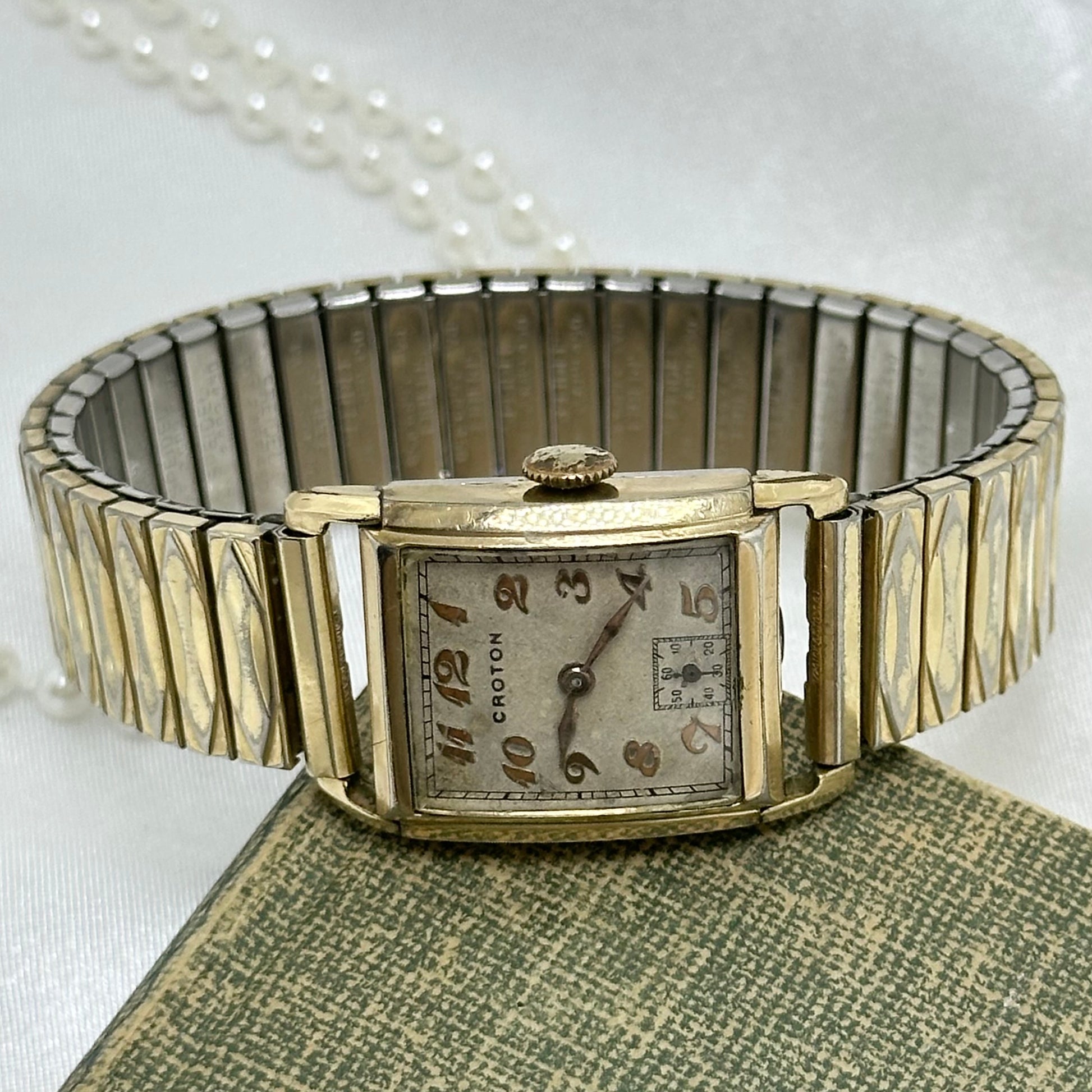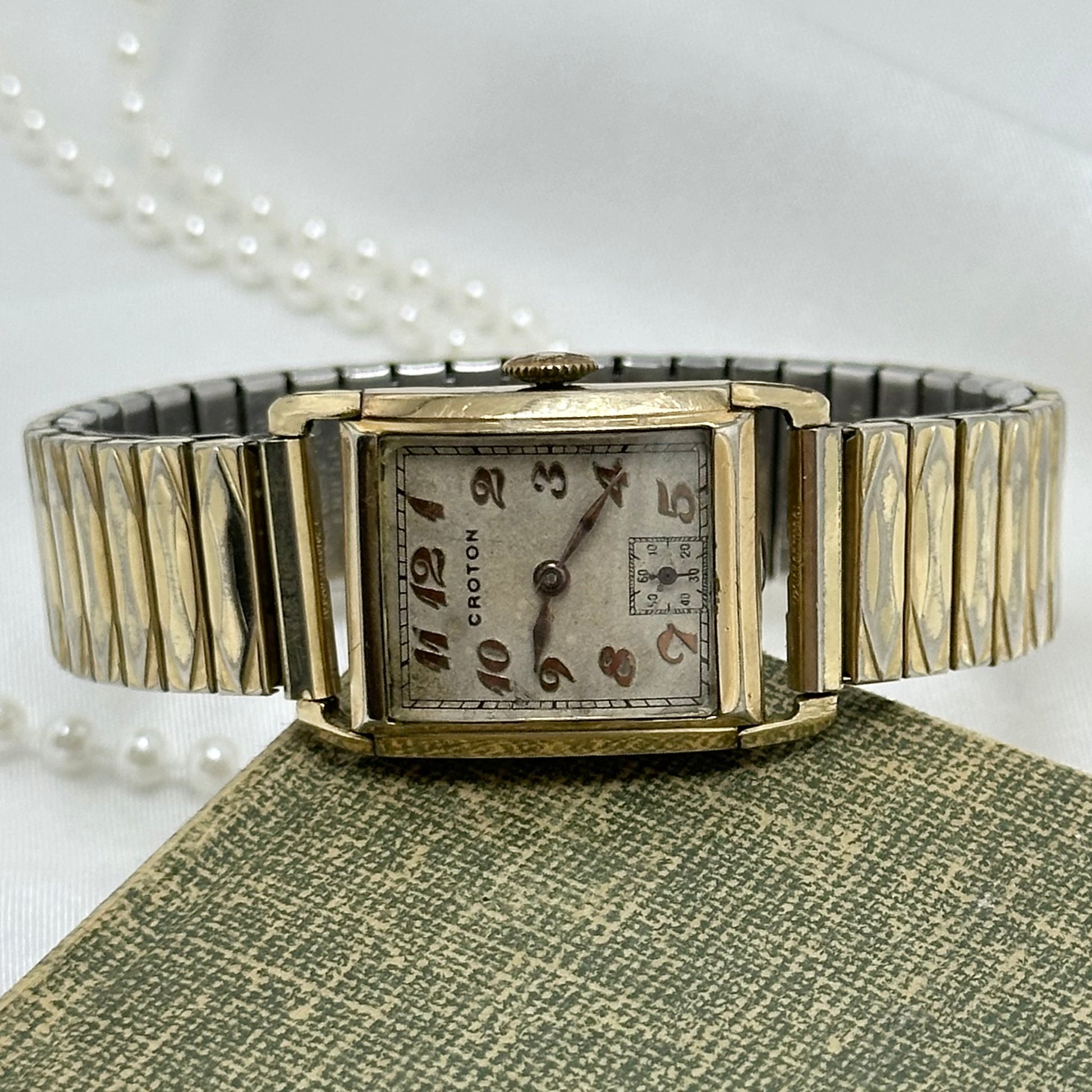 Vintage Croton 442905 manual winding Swiss made 7 jewels watch with sub second hand and rectangular dial from the 1950's. Gold tone Speidel band.