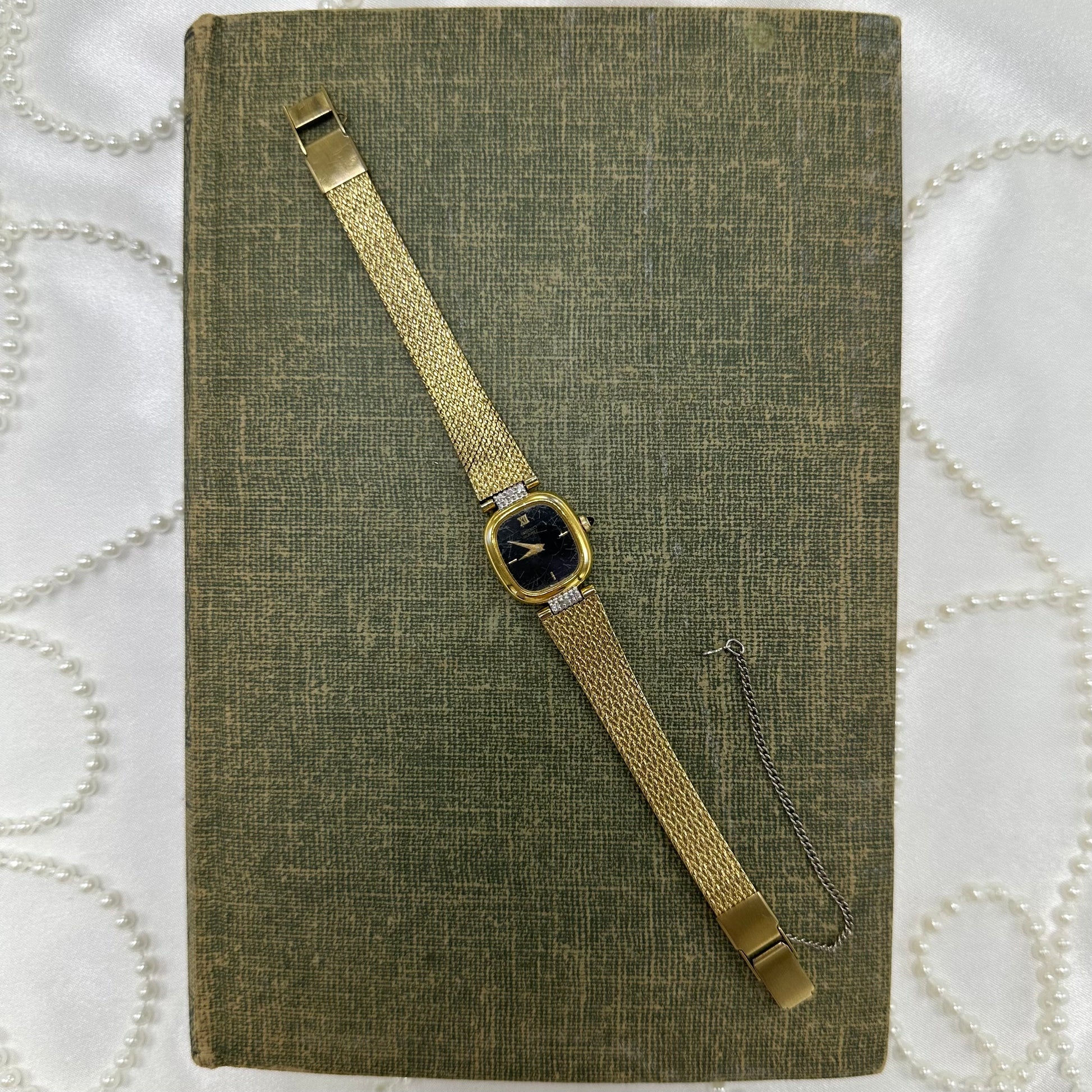 Vintage gold tone black dial Seiko watch with diamanté clasp band and blue jewel crown.