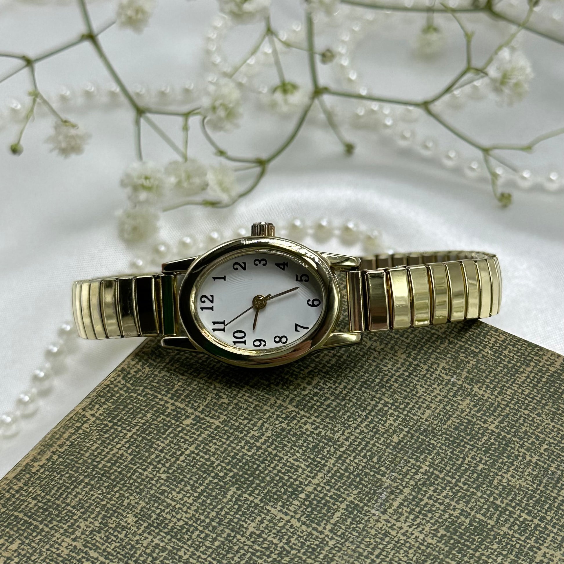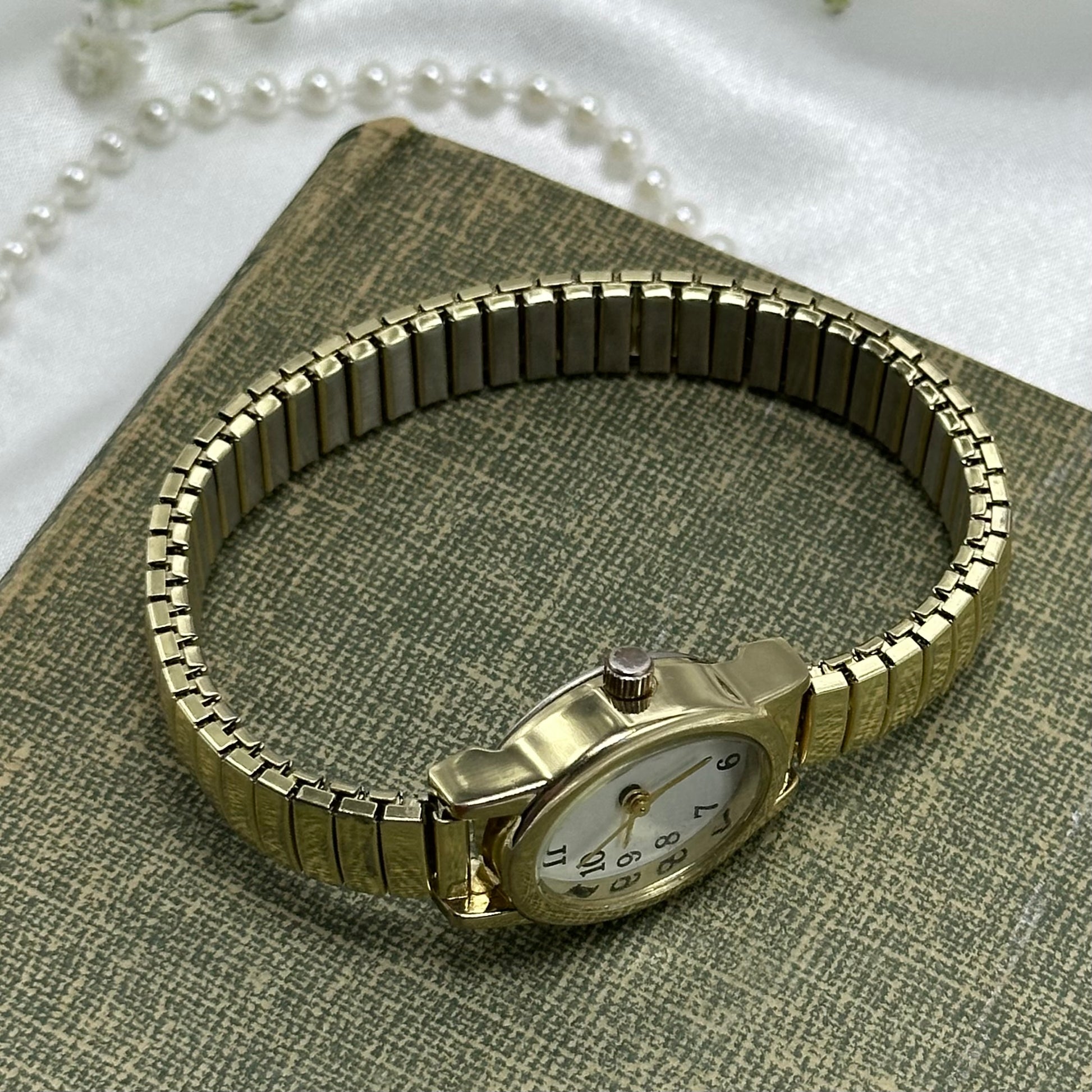 Classic oval dial gold tone watch with stretchable band.