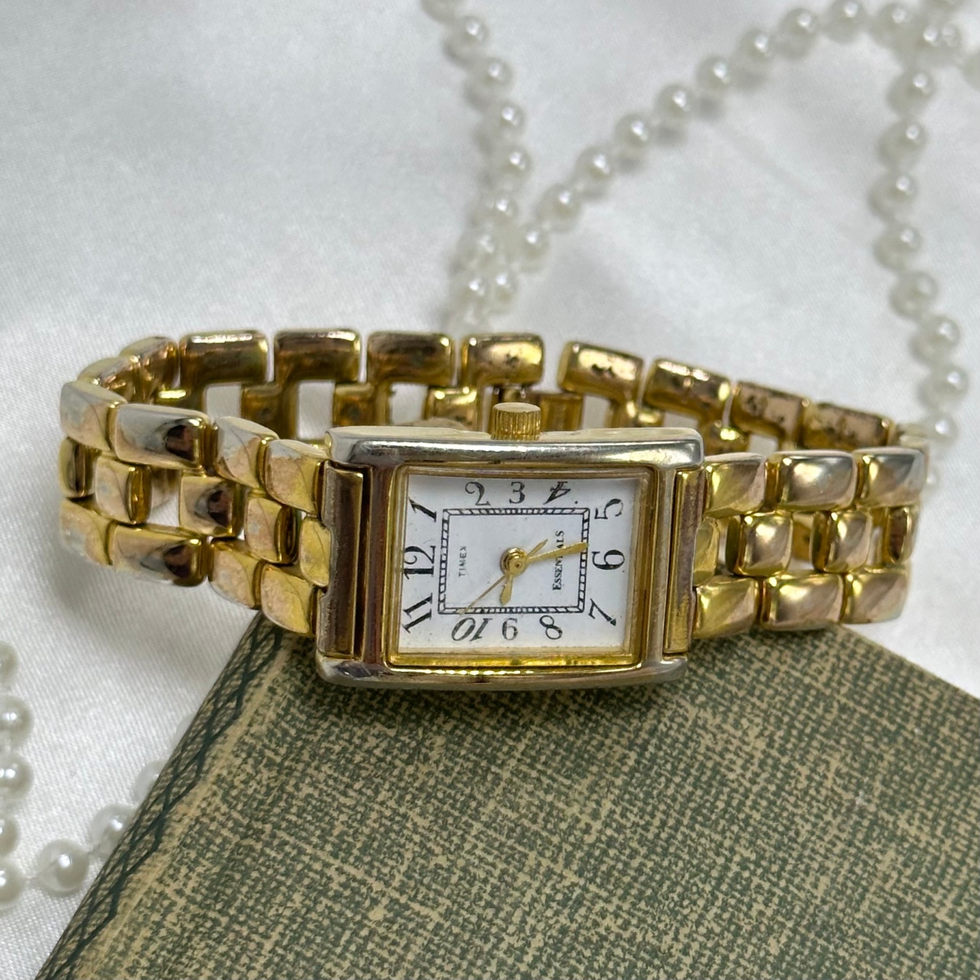 Gold tone Timex watch with rectangle dial and quartz movement.