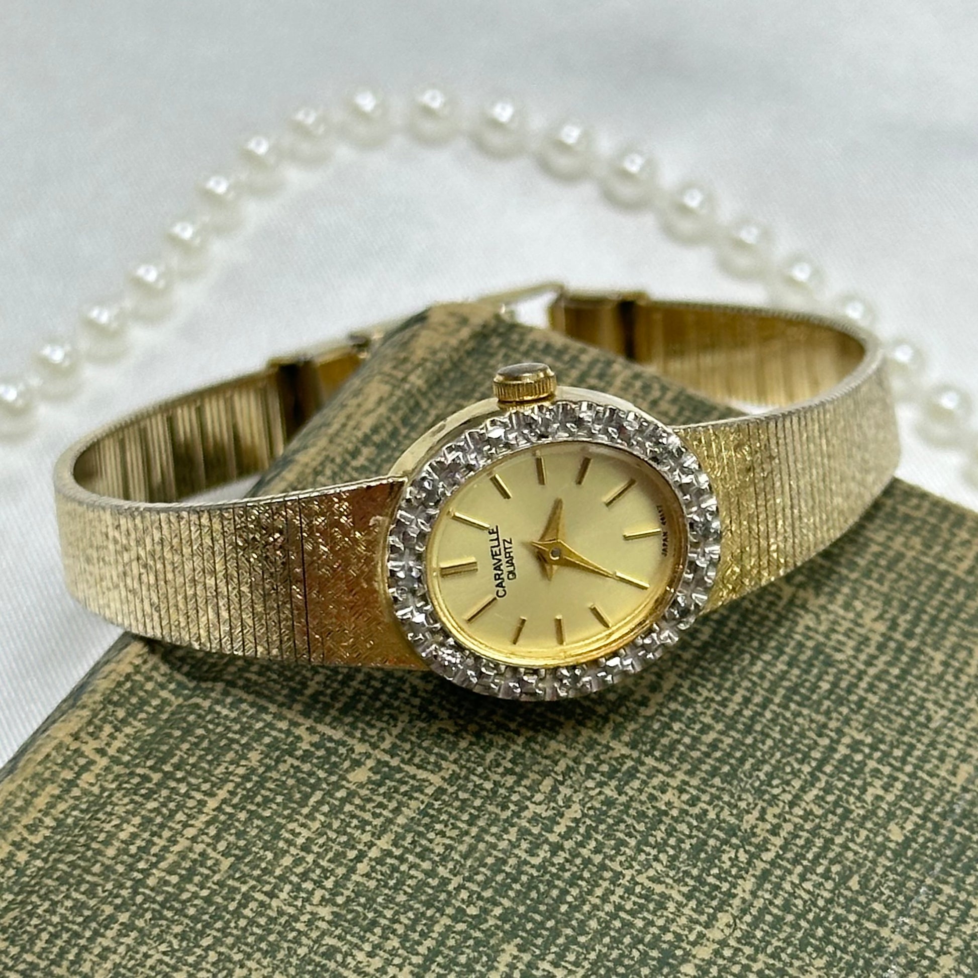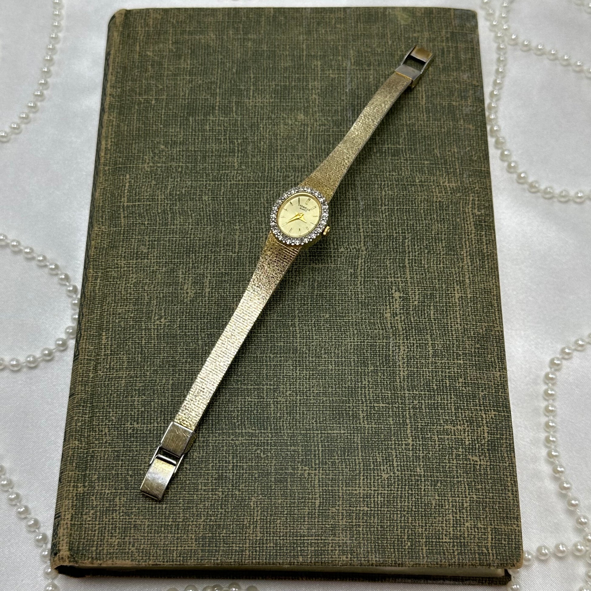 Vintage gold tone diamanté Caravelle by Bulova watch with metal clasp band and quartz movement.