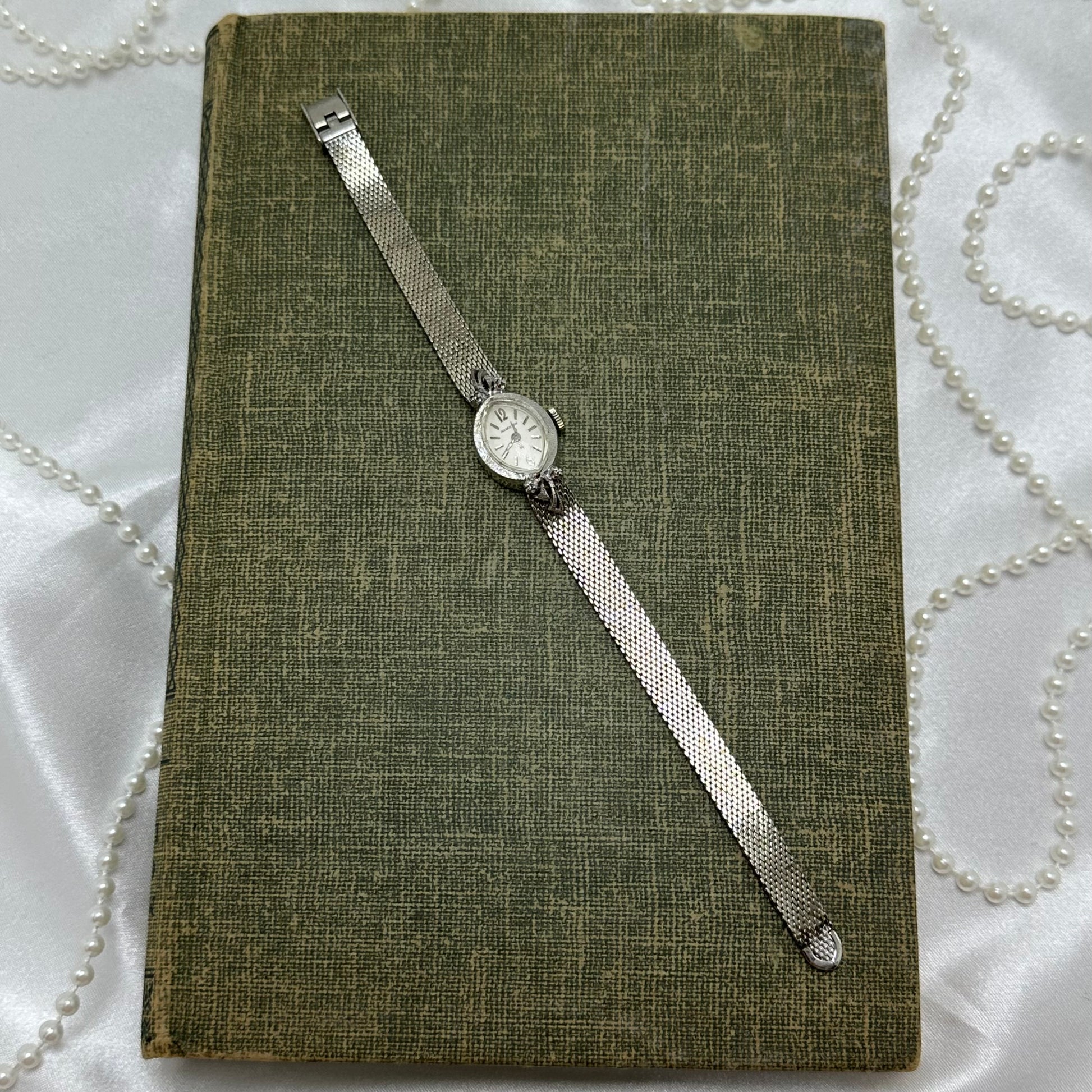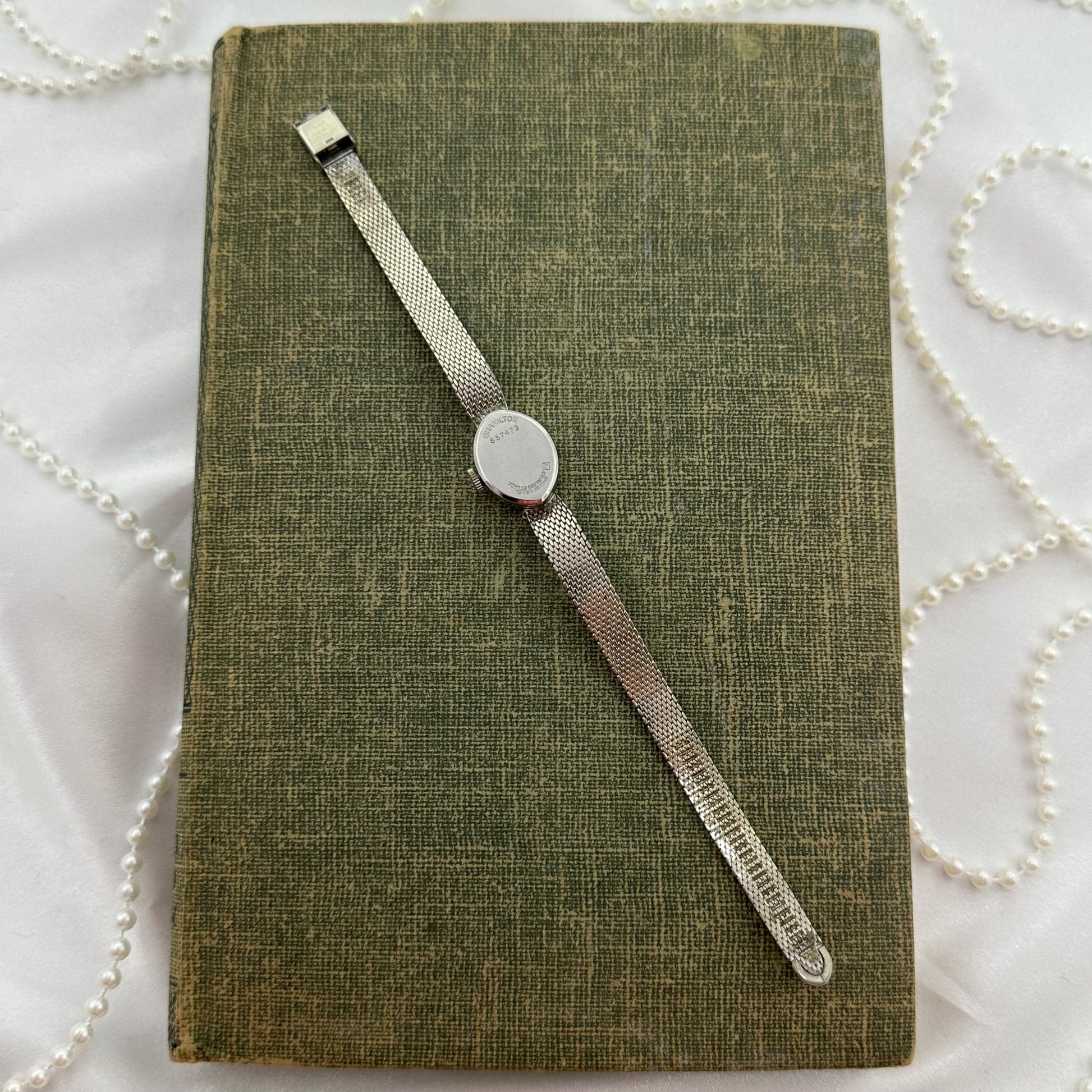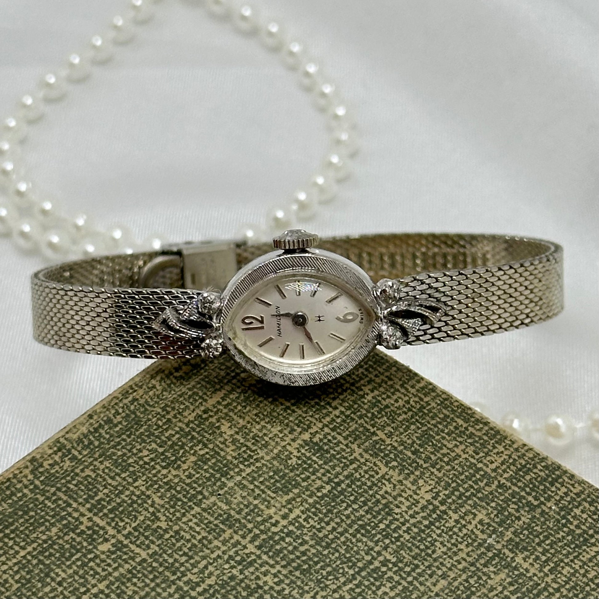 Vintage 10k rolled gold plated Hamilton 857473 watch with dainty oval 4 diamond dial and thin mesh band from the 1960's. Watch comes with original "H" crown.
