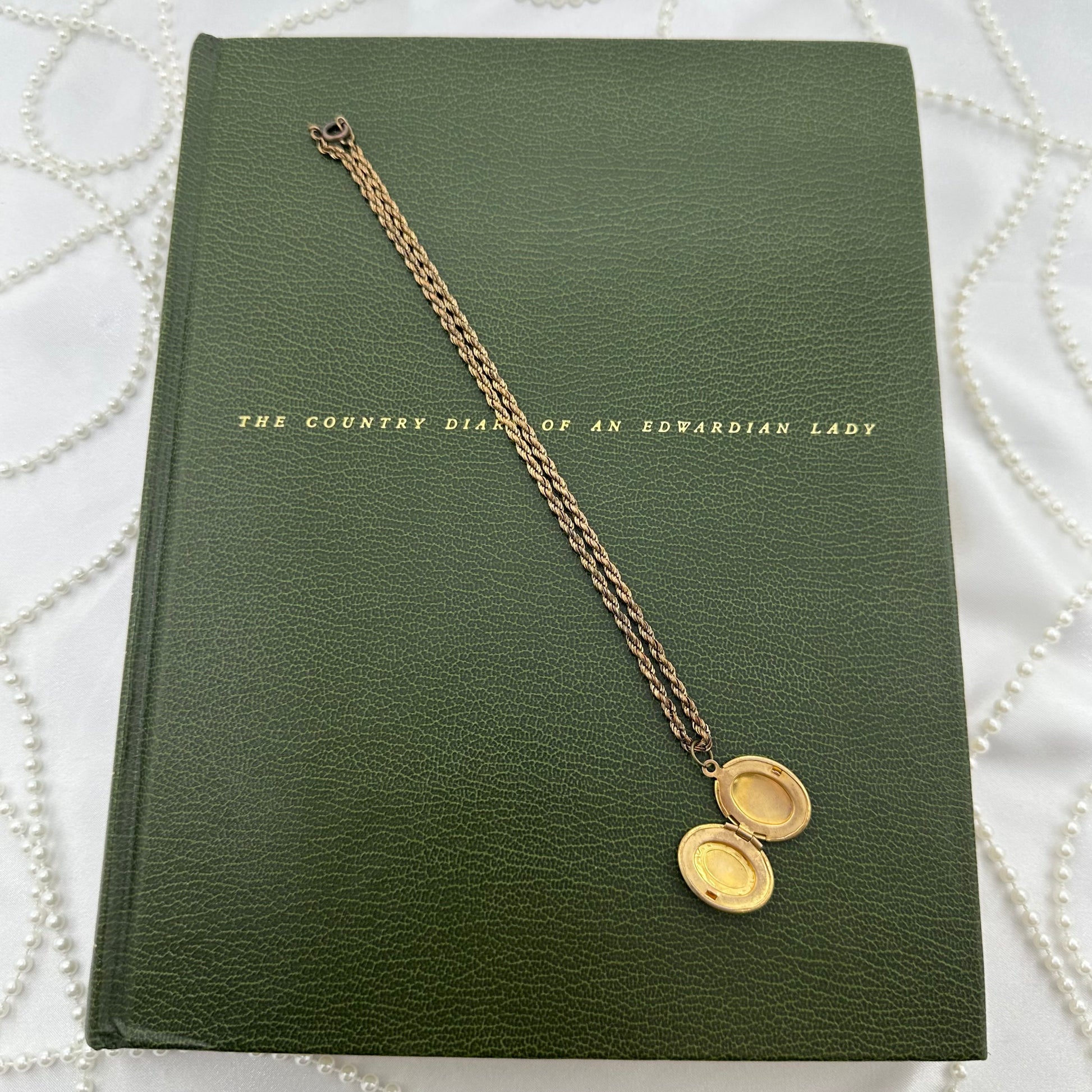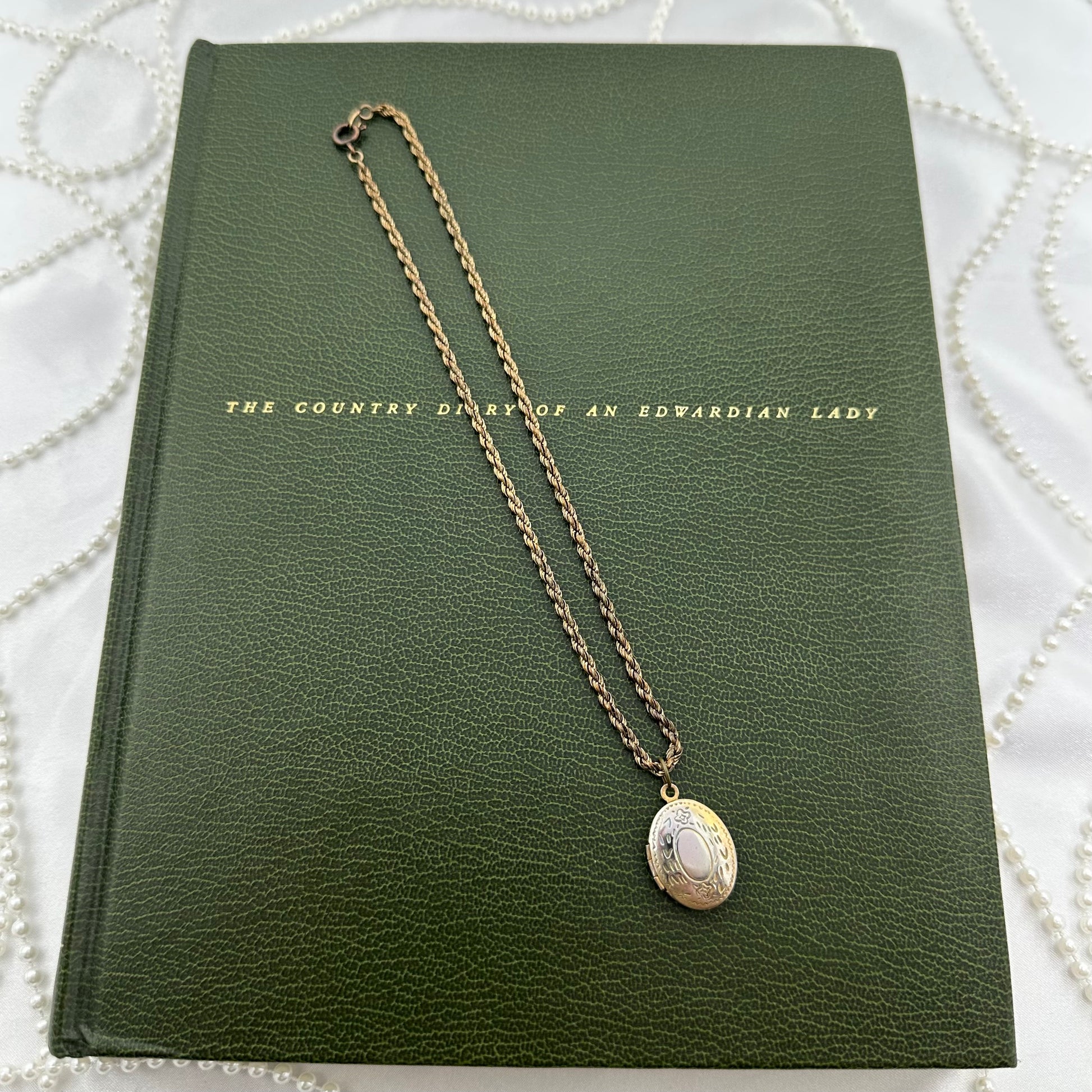Vintage dainty locket necklace with engraved floral design on vintage chain.