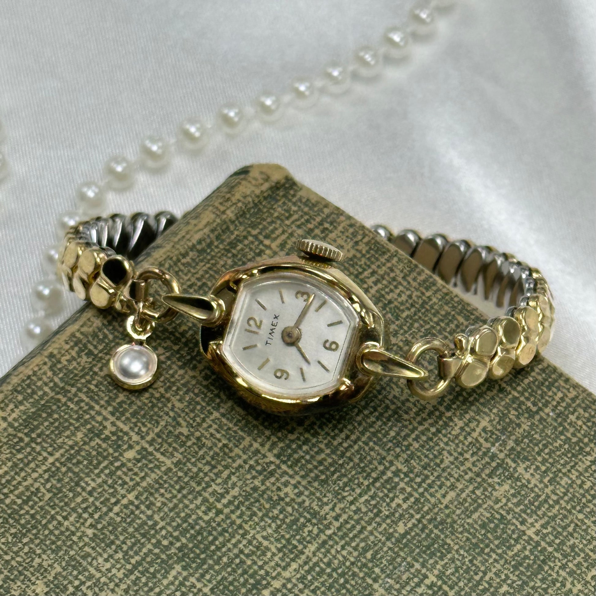 Dainty Vintage Gold Timex Wind-Up Watch with Pearl Charm
