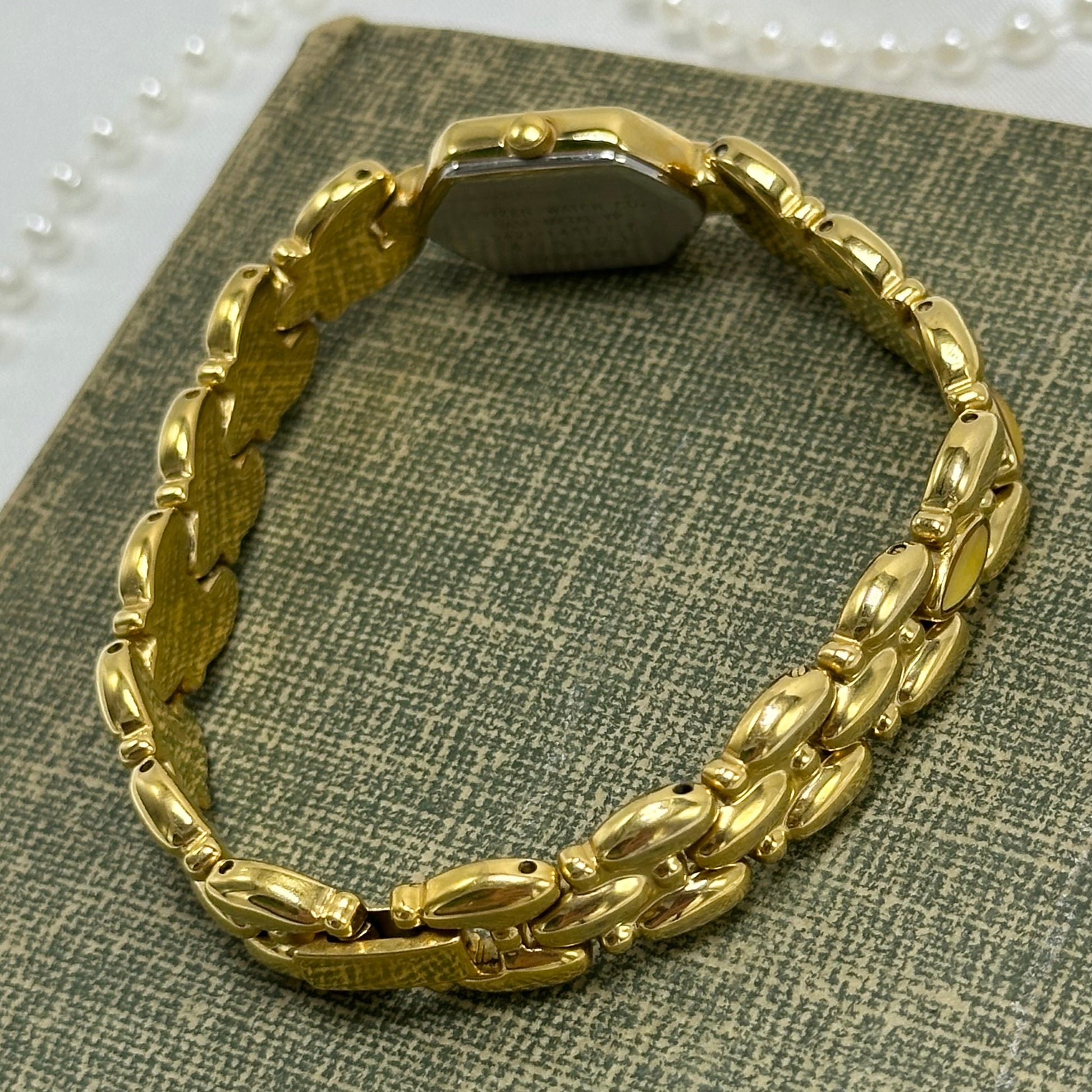 Vintage dainty gold tone Citizen watch with mother of pearl dial and yellow iridescent gemstone band.