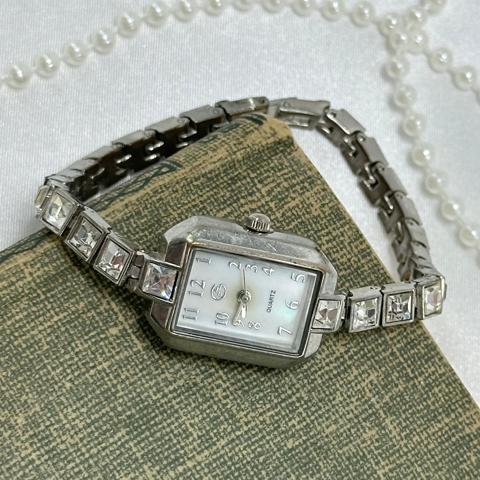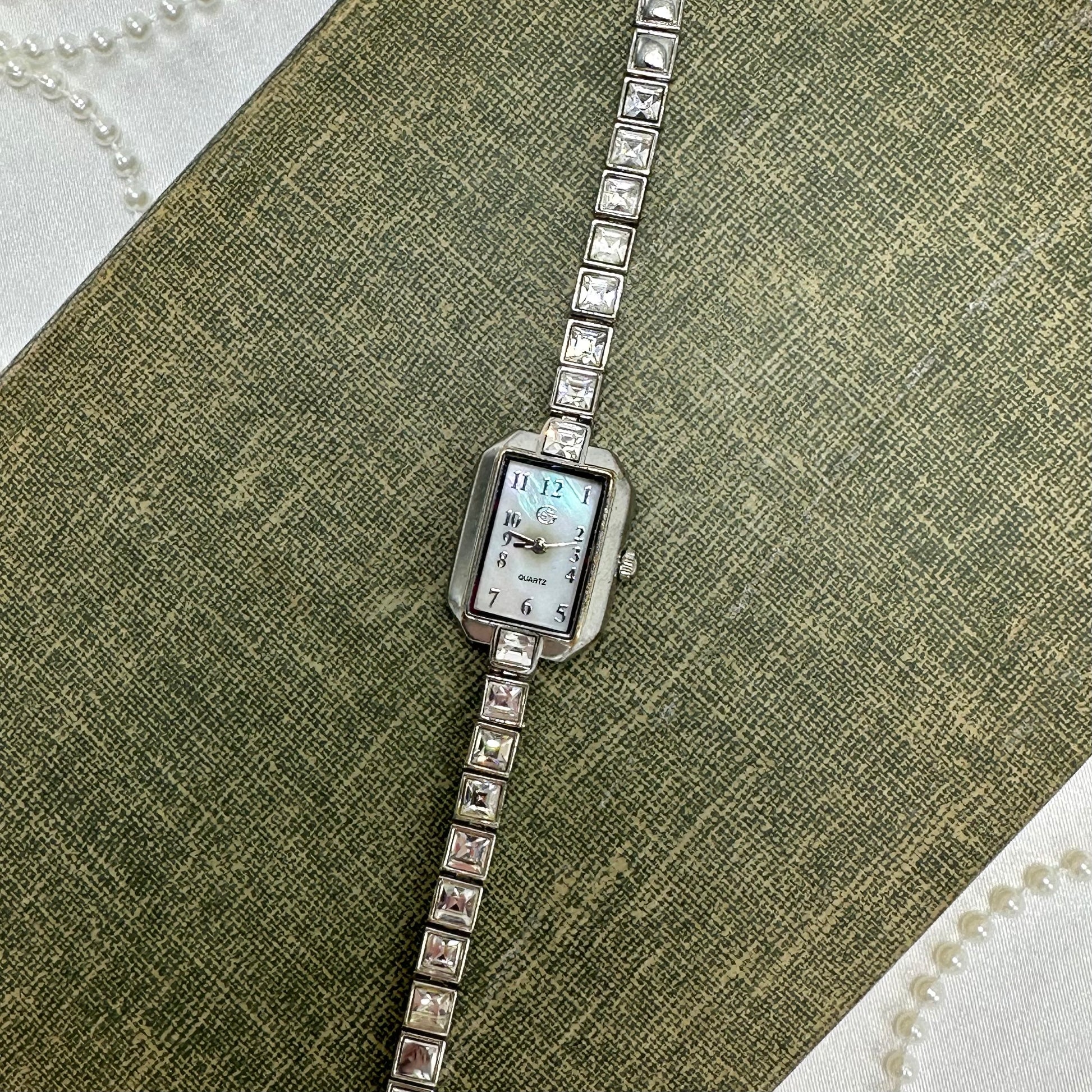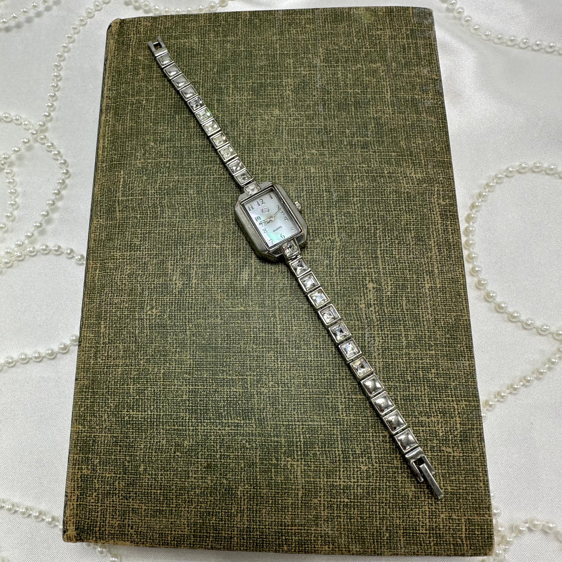 Silver tone GEORGE watch with rectangle mother of pearl dial and quartz movement.