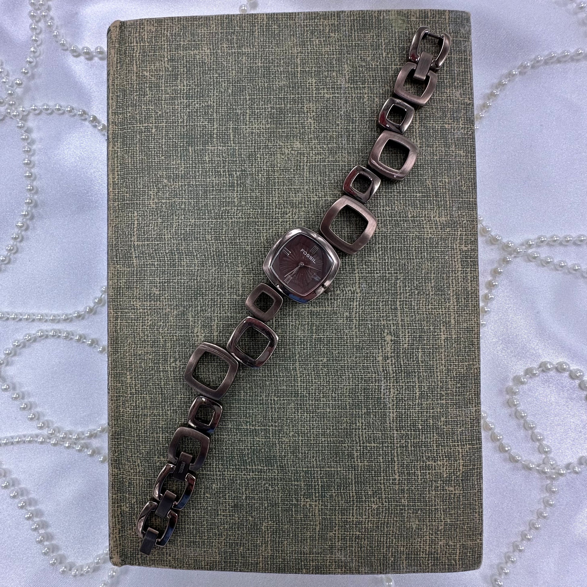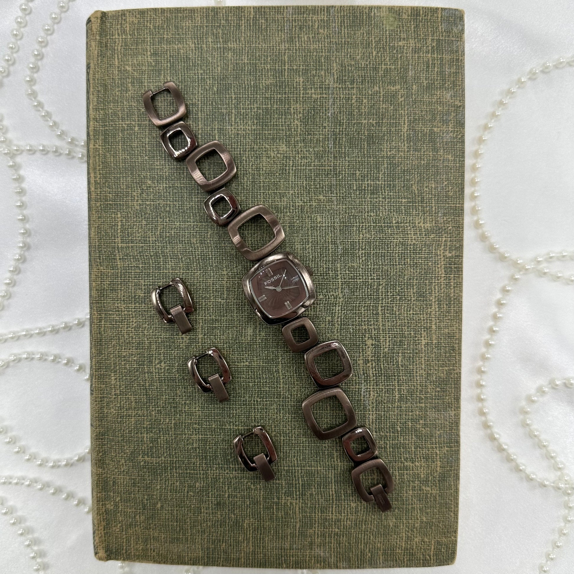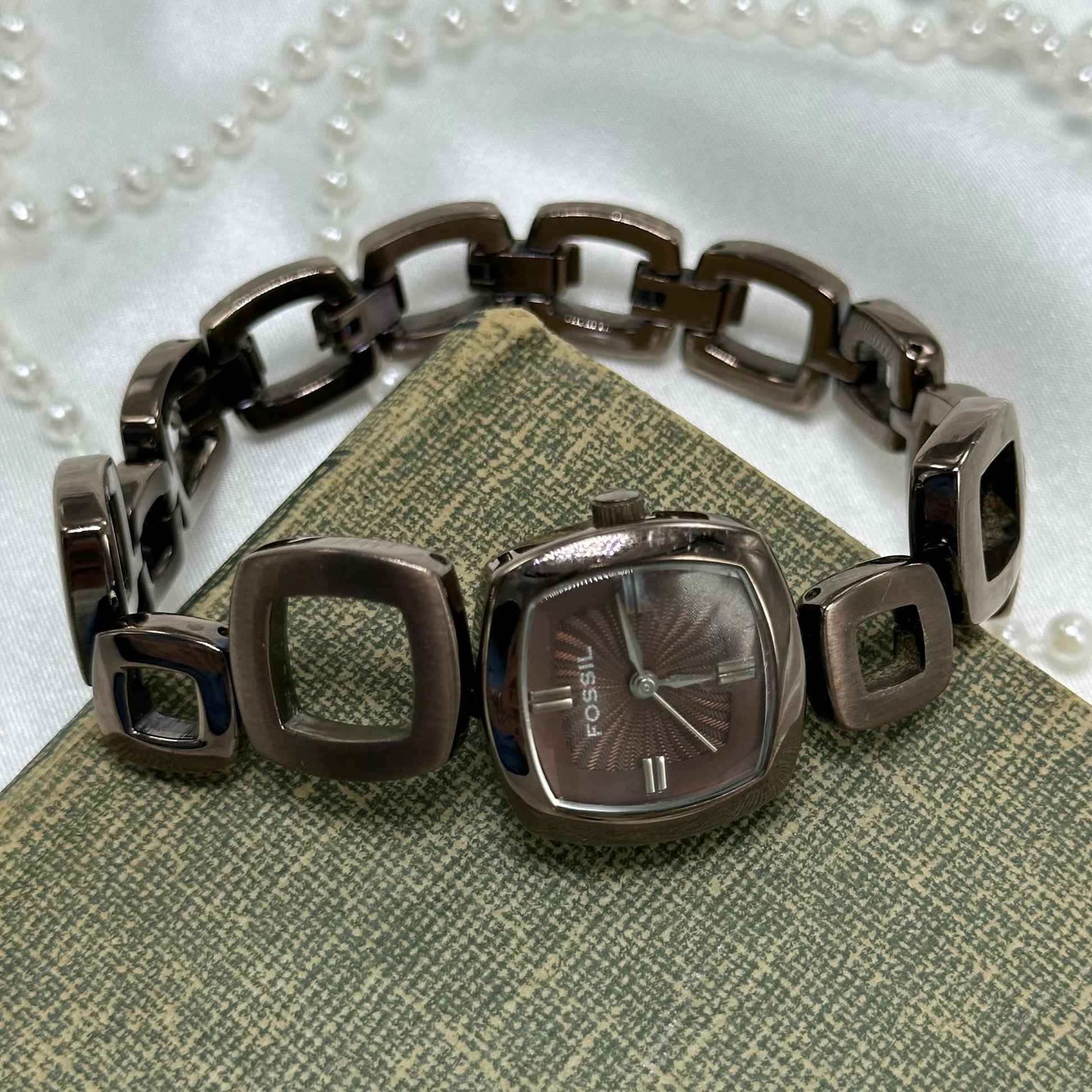 Vintage chocolate brown color Fossil watch with abstract funky clasp band and textured square dial.