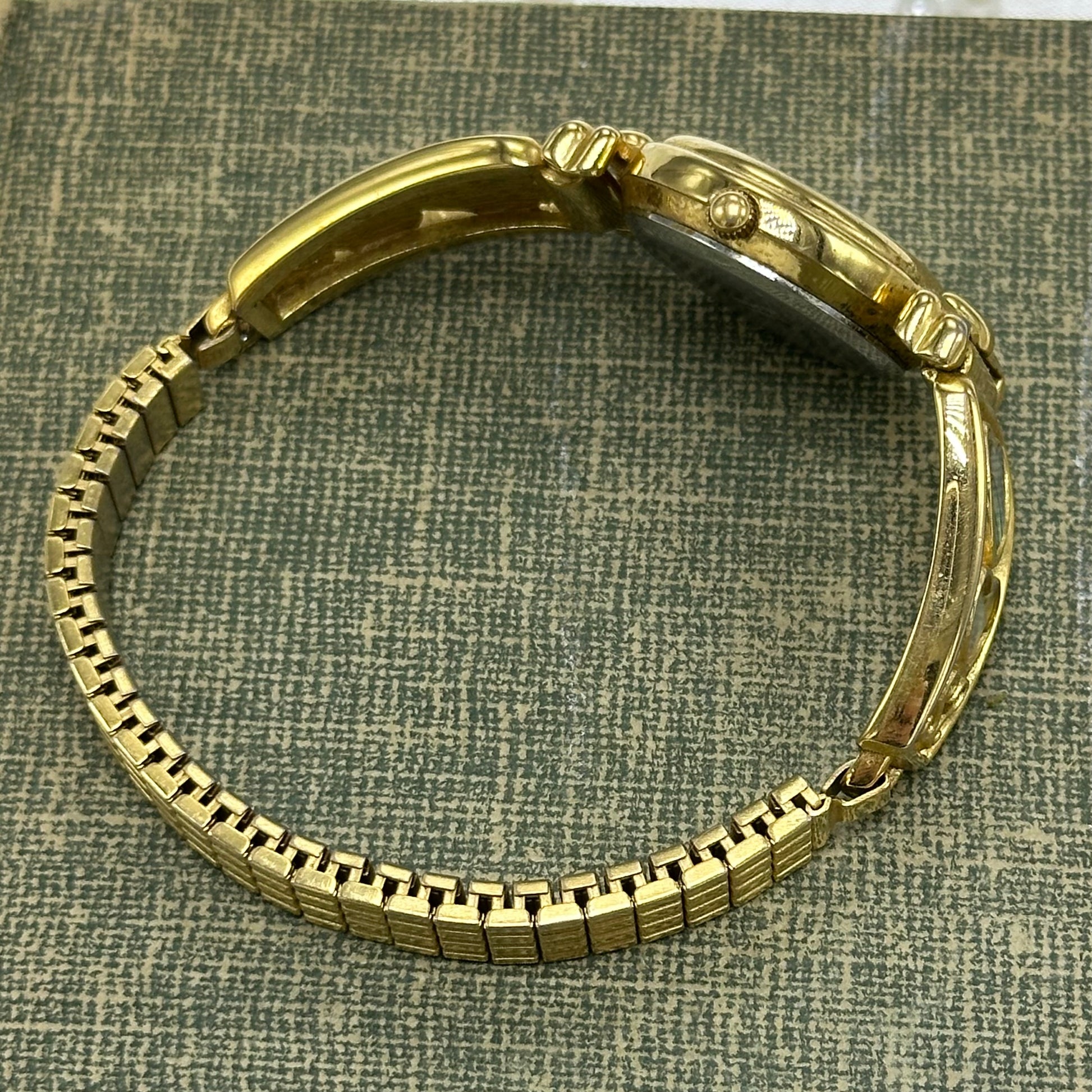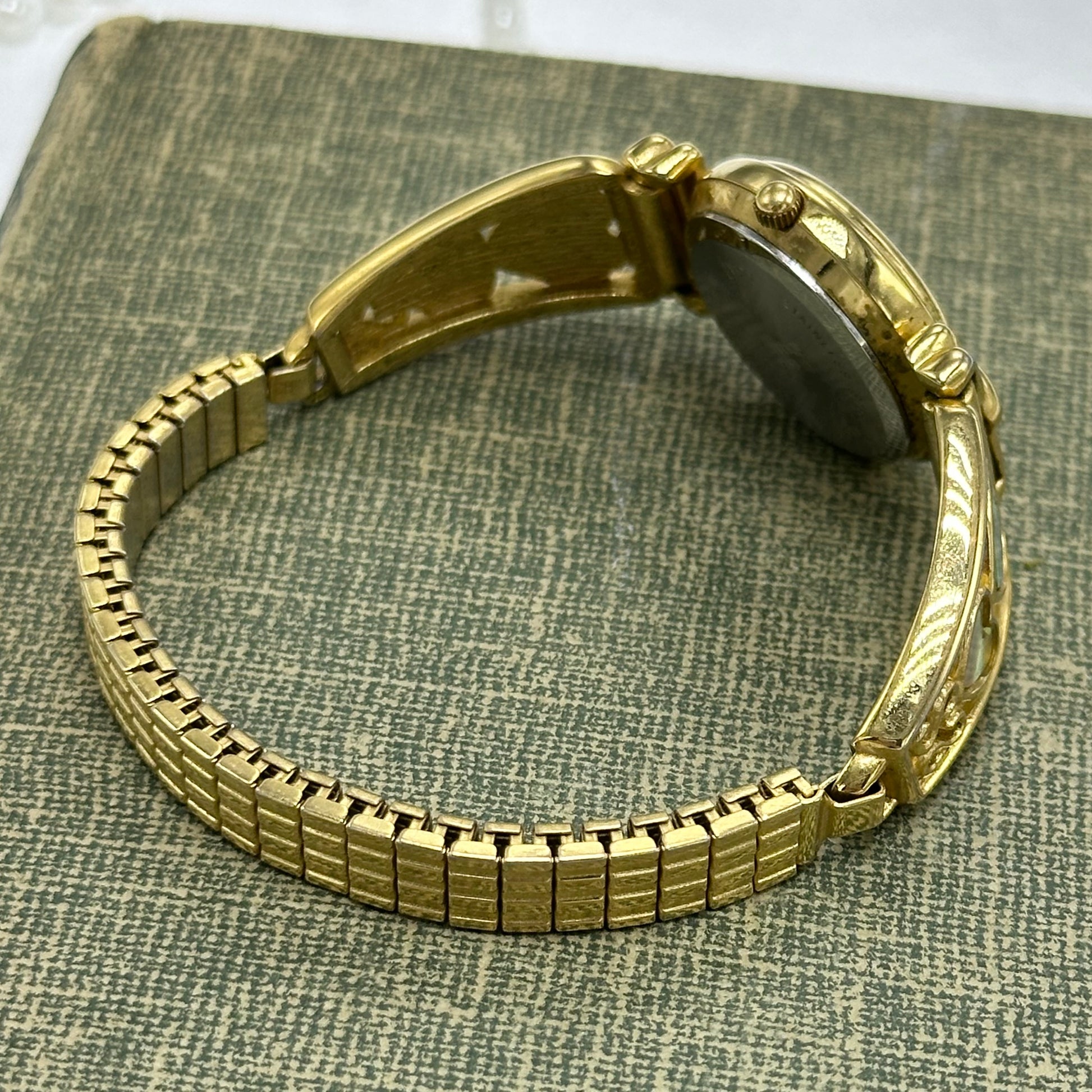 Vintage gold tone watch with round abalone dial and abalone heart stretchable band.