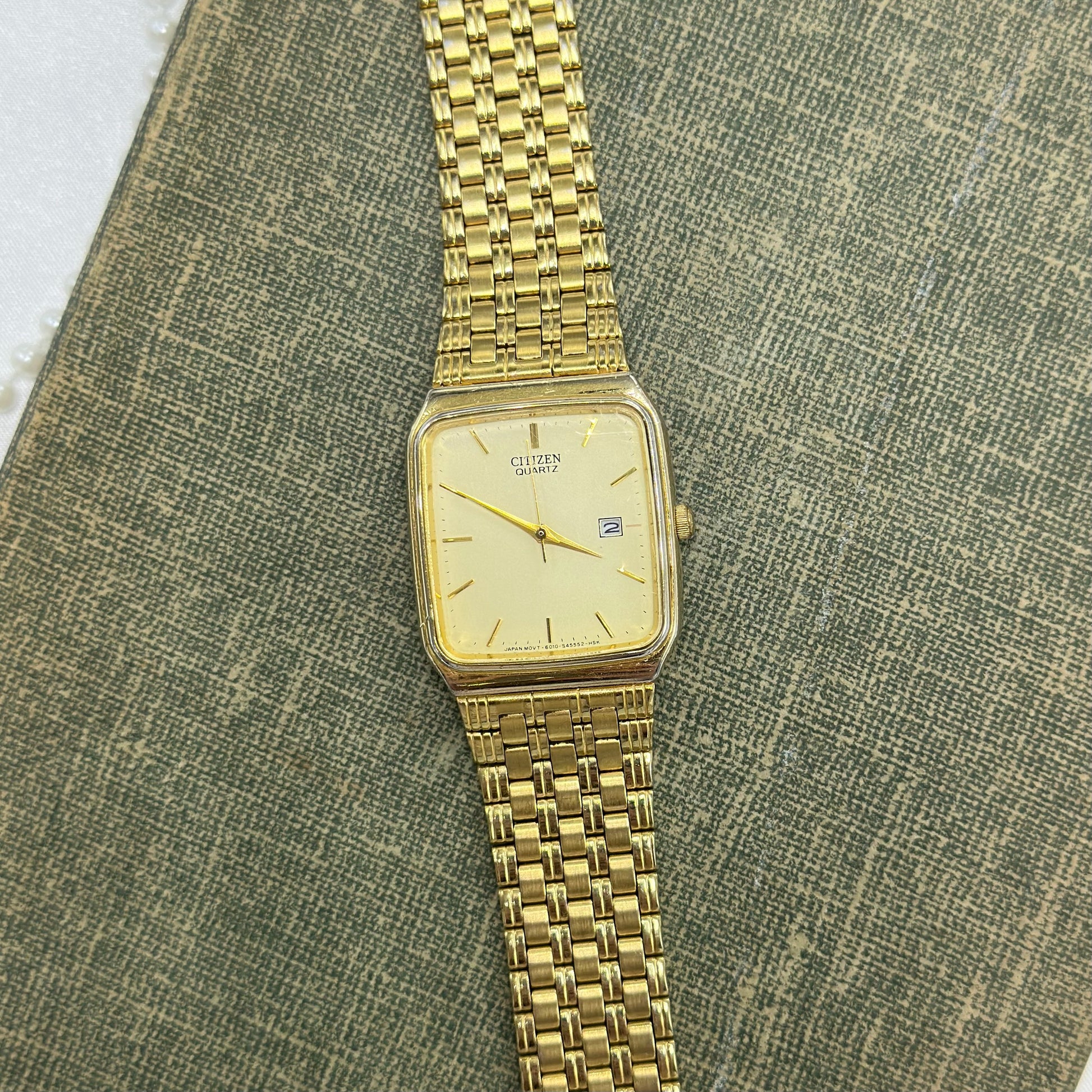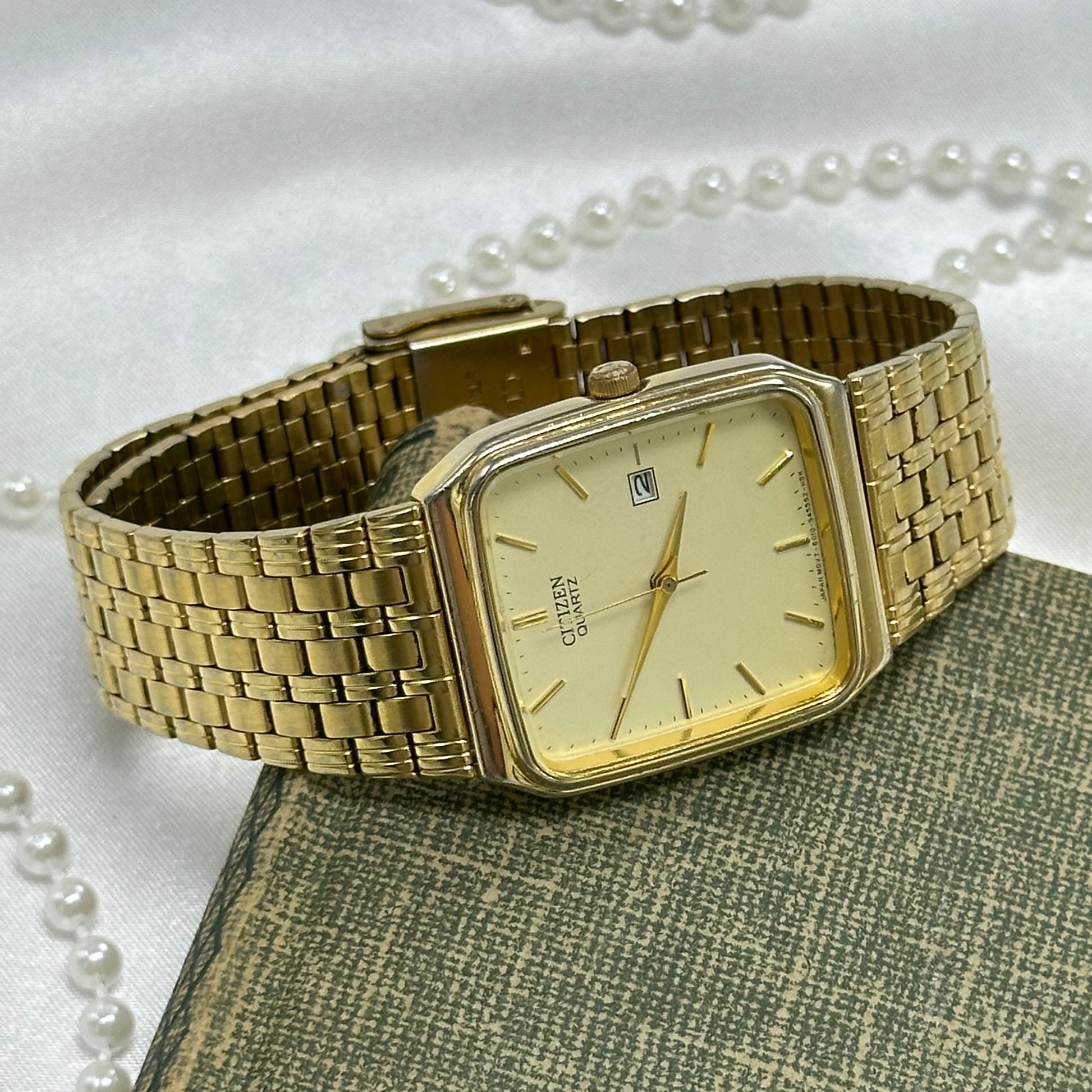 Gold tone Citizen square dial watch with date display and quartz movement.