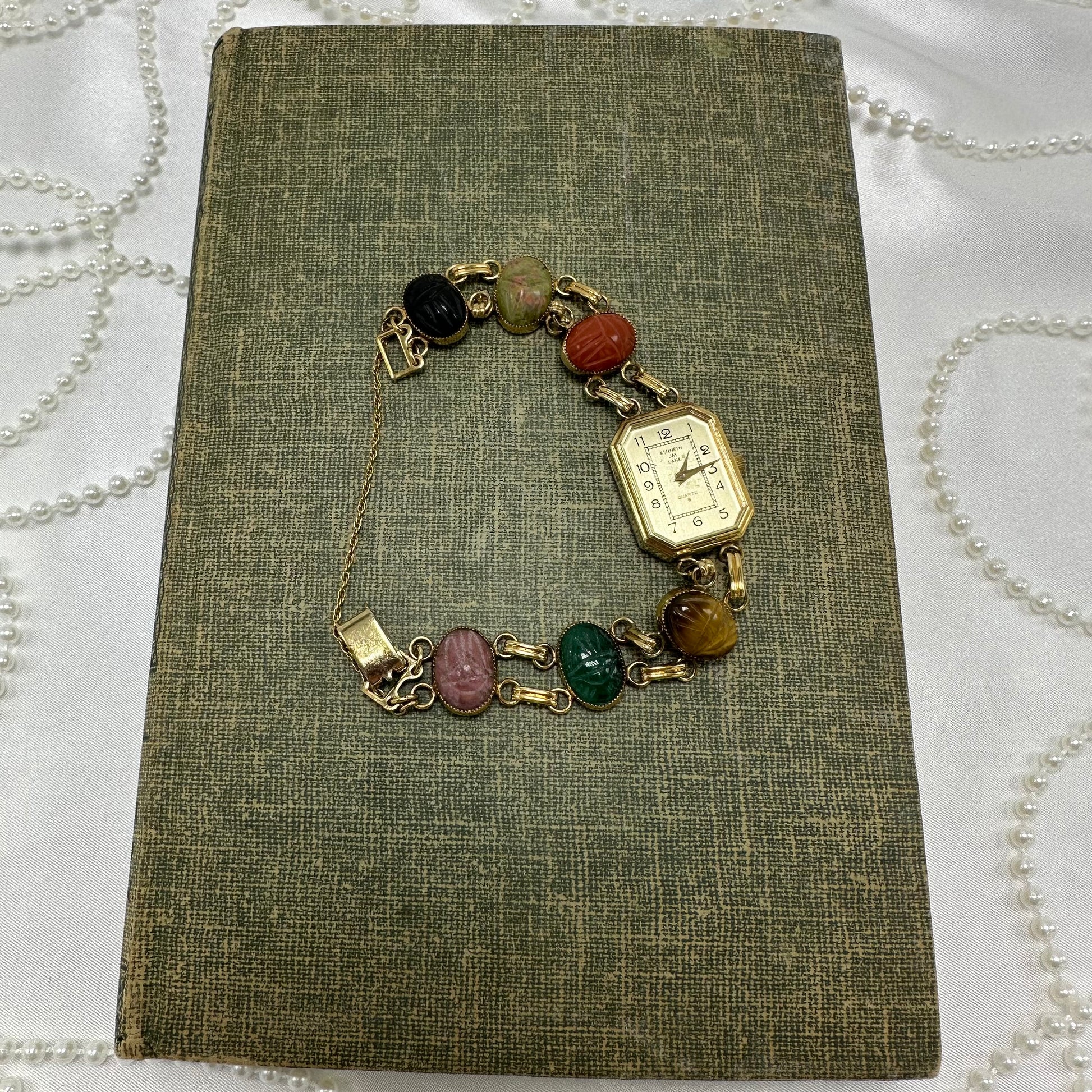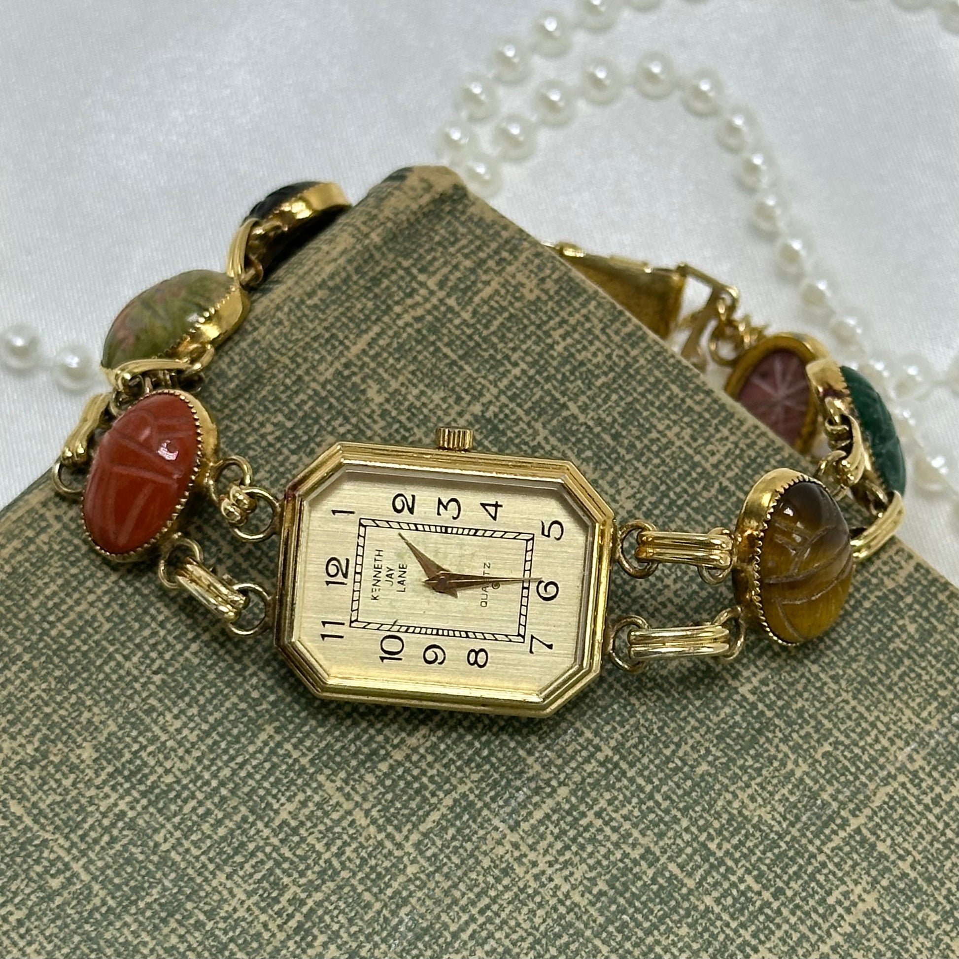 Vintage gold tone Kenneth Jay Lane watch with multicolor scarab band and safety chain.