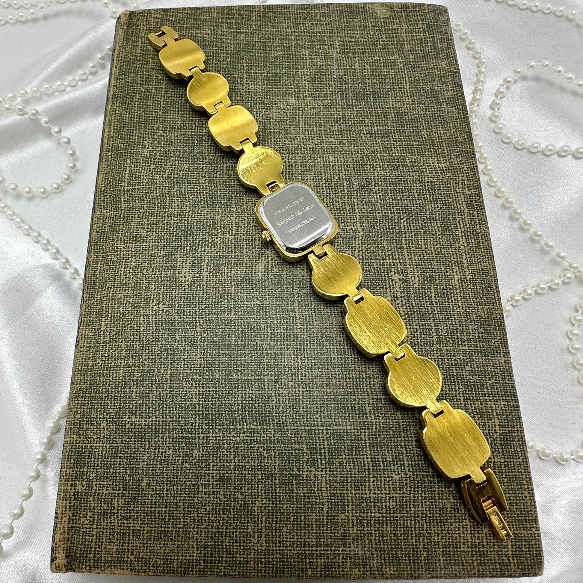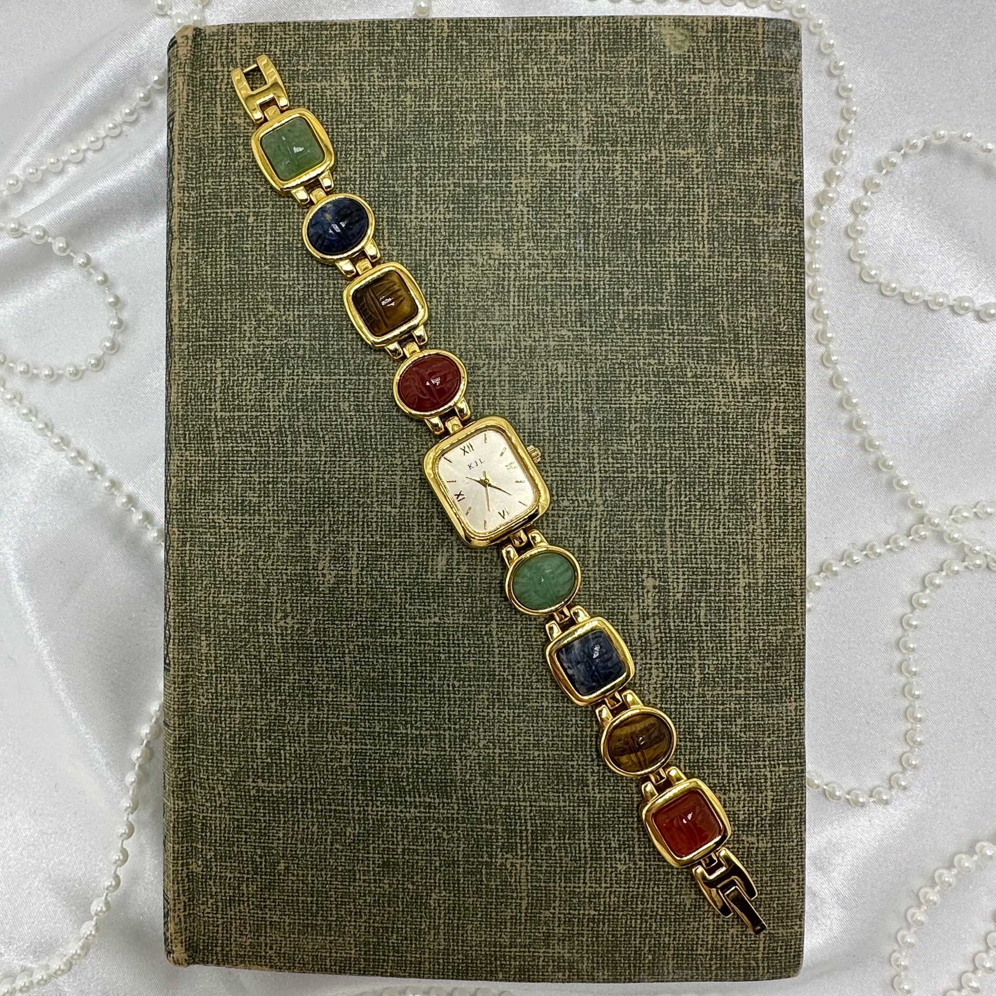 Vintage gold tone Kenneth Jay Lane watch with multicolor scarab band and quartz movement.