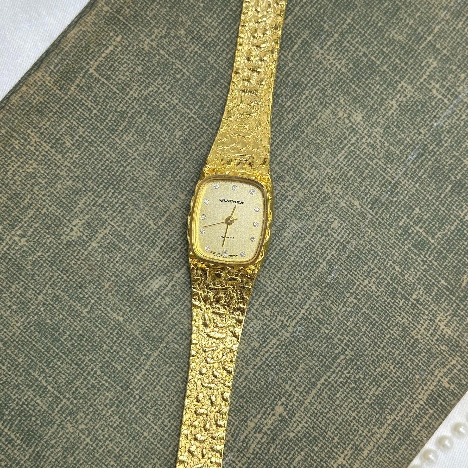 Gold tone nugget Quemex watch with diamanté stone markers and quartz movement. No crown.