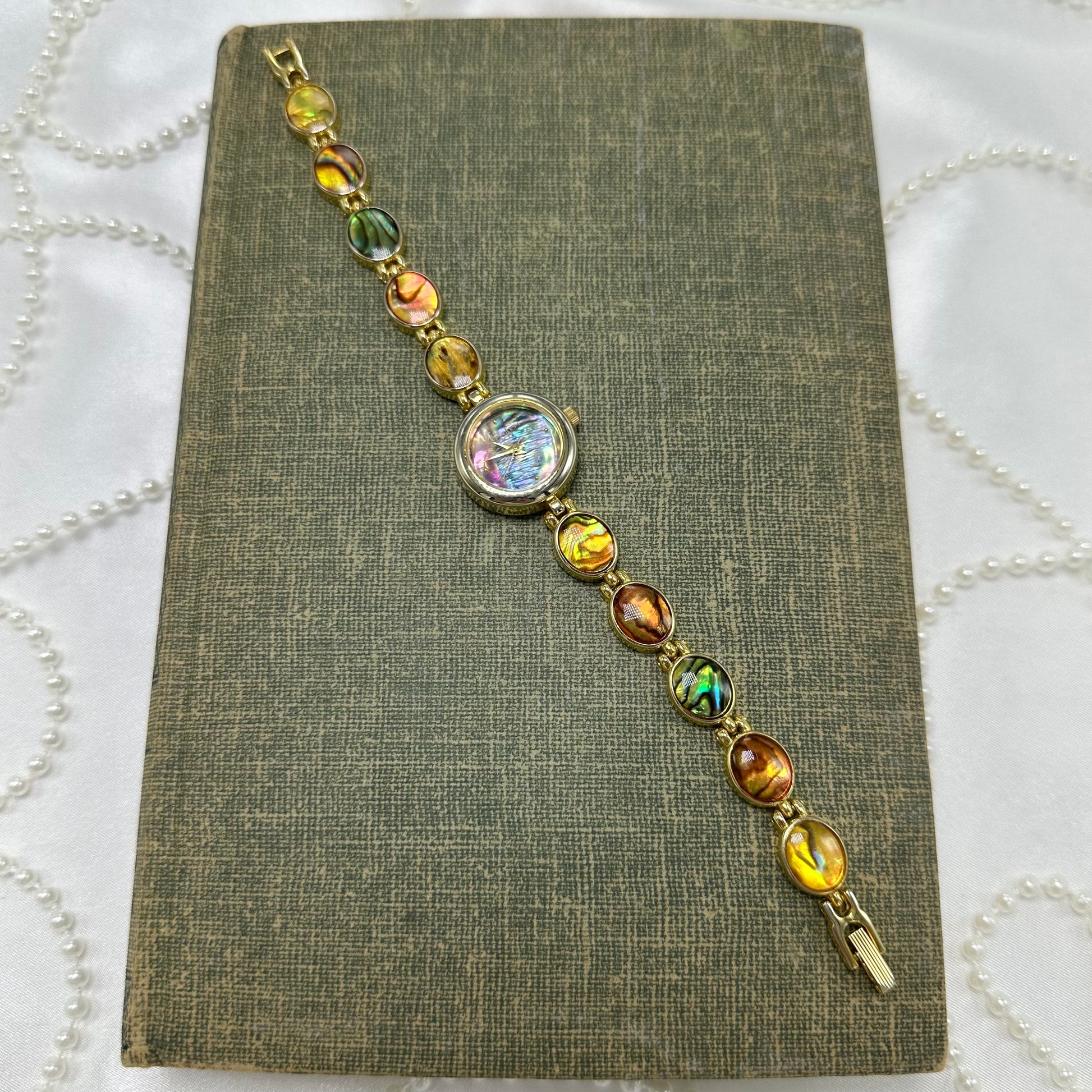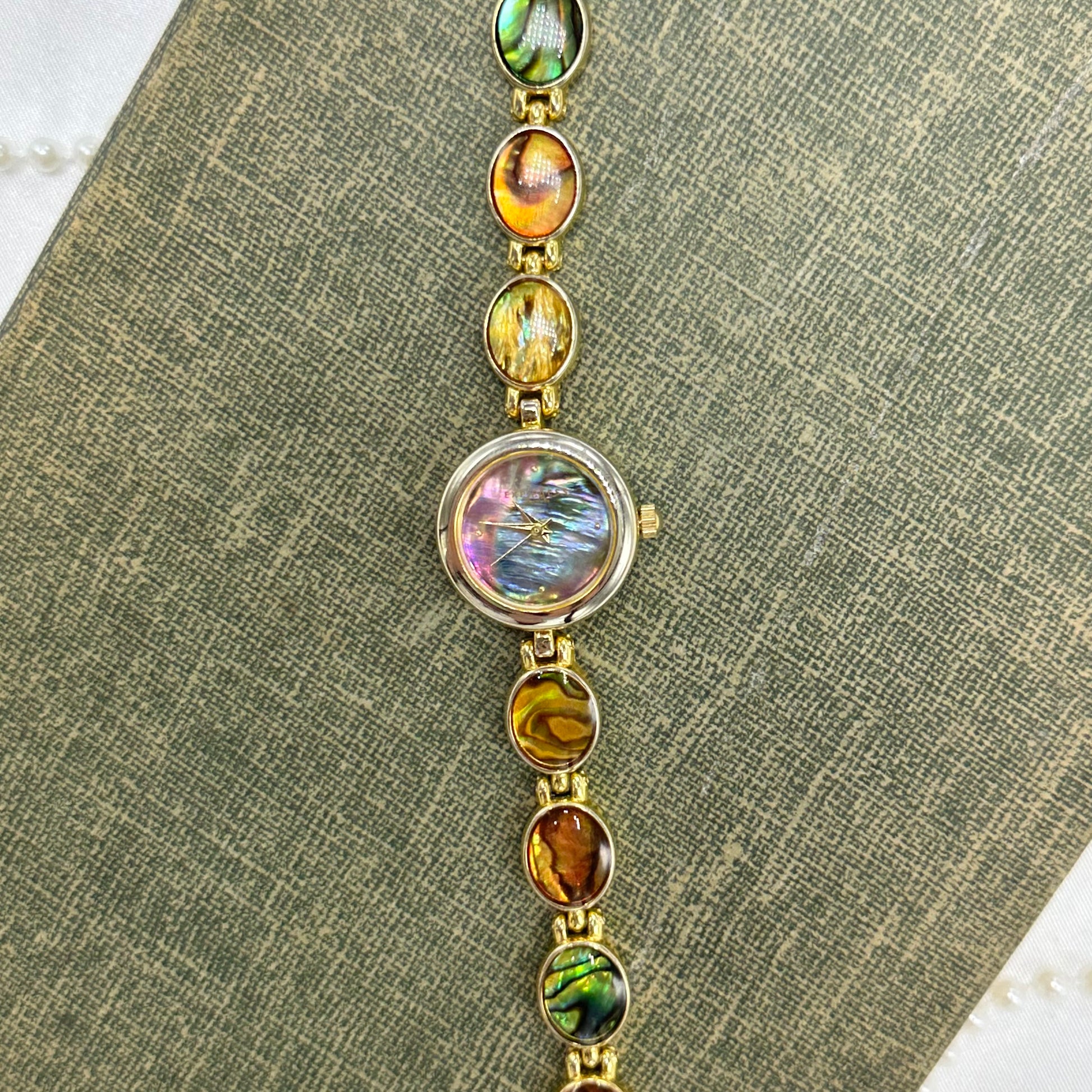 Vintage gold tone round abalone dial LA Express watch with abalone clasp band and quartz movement.