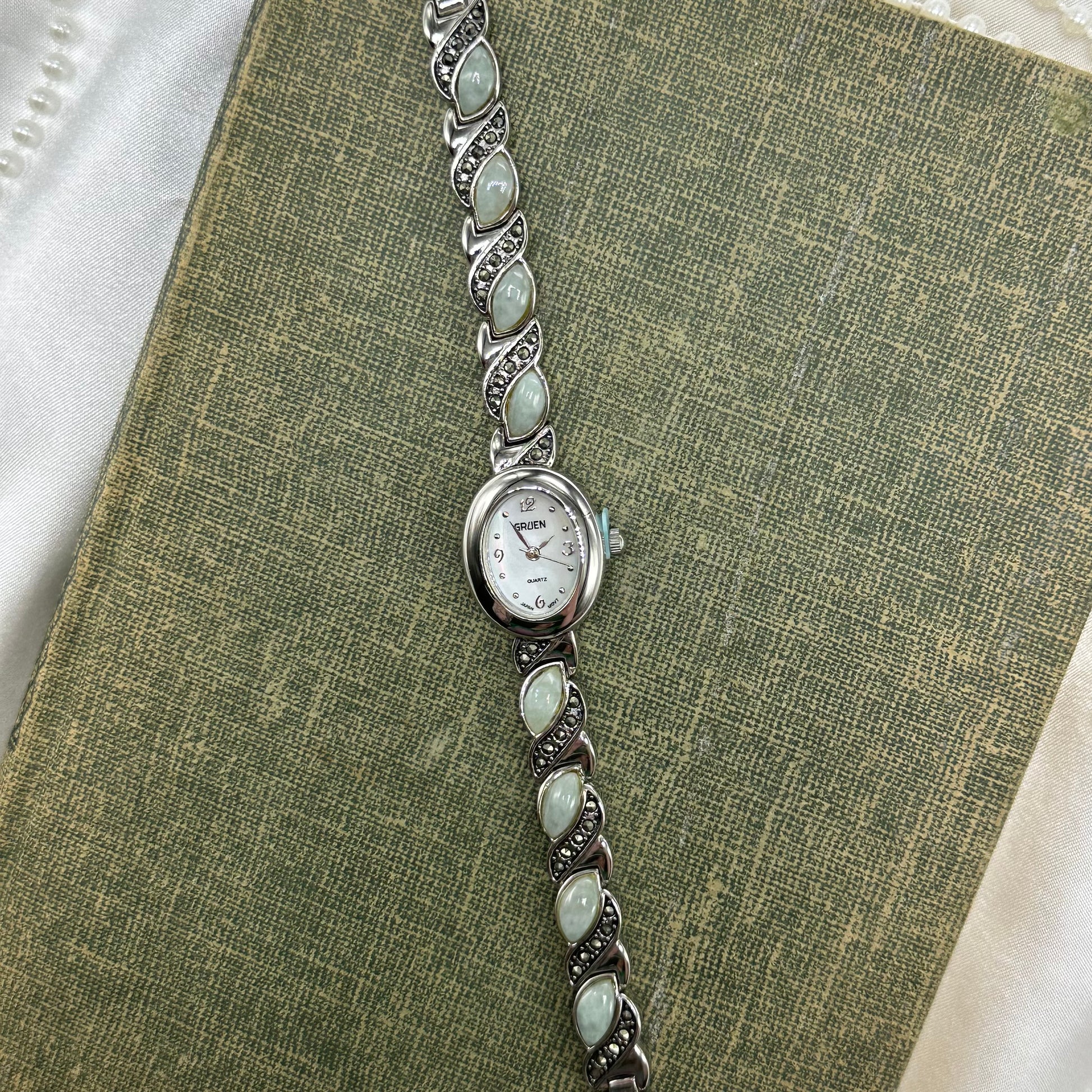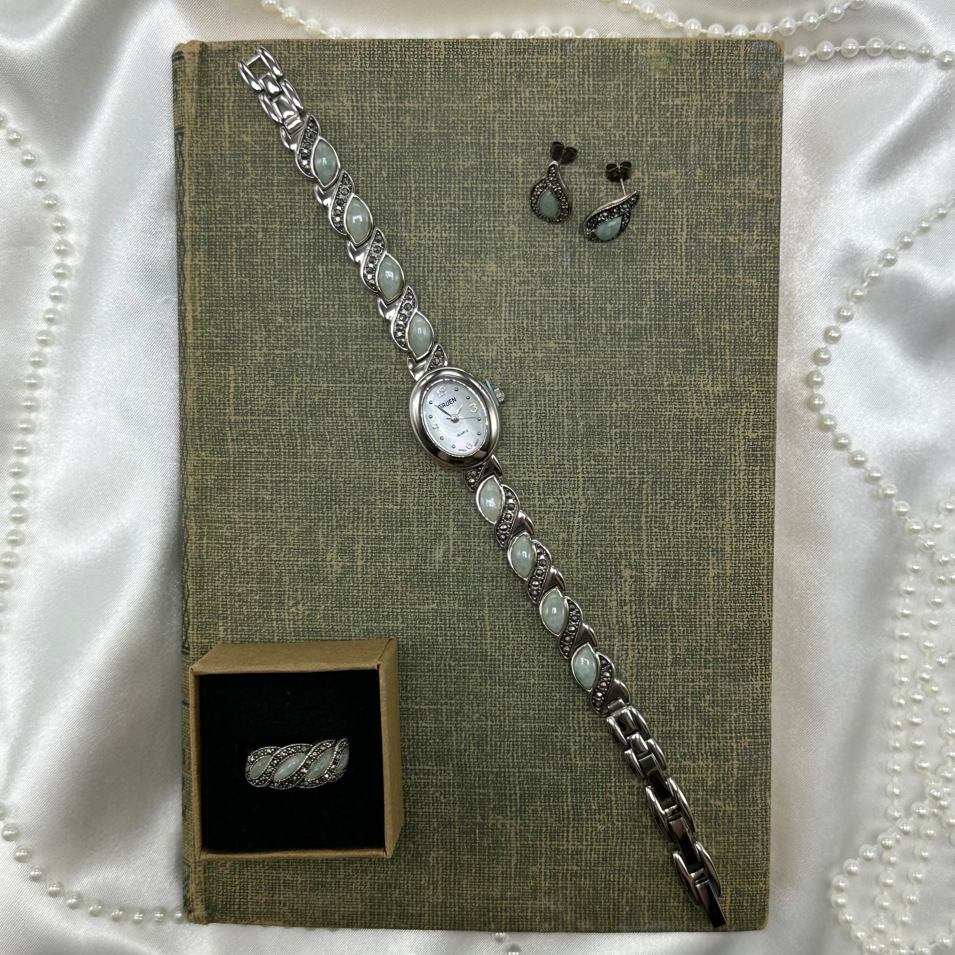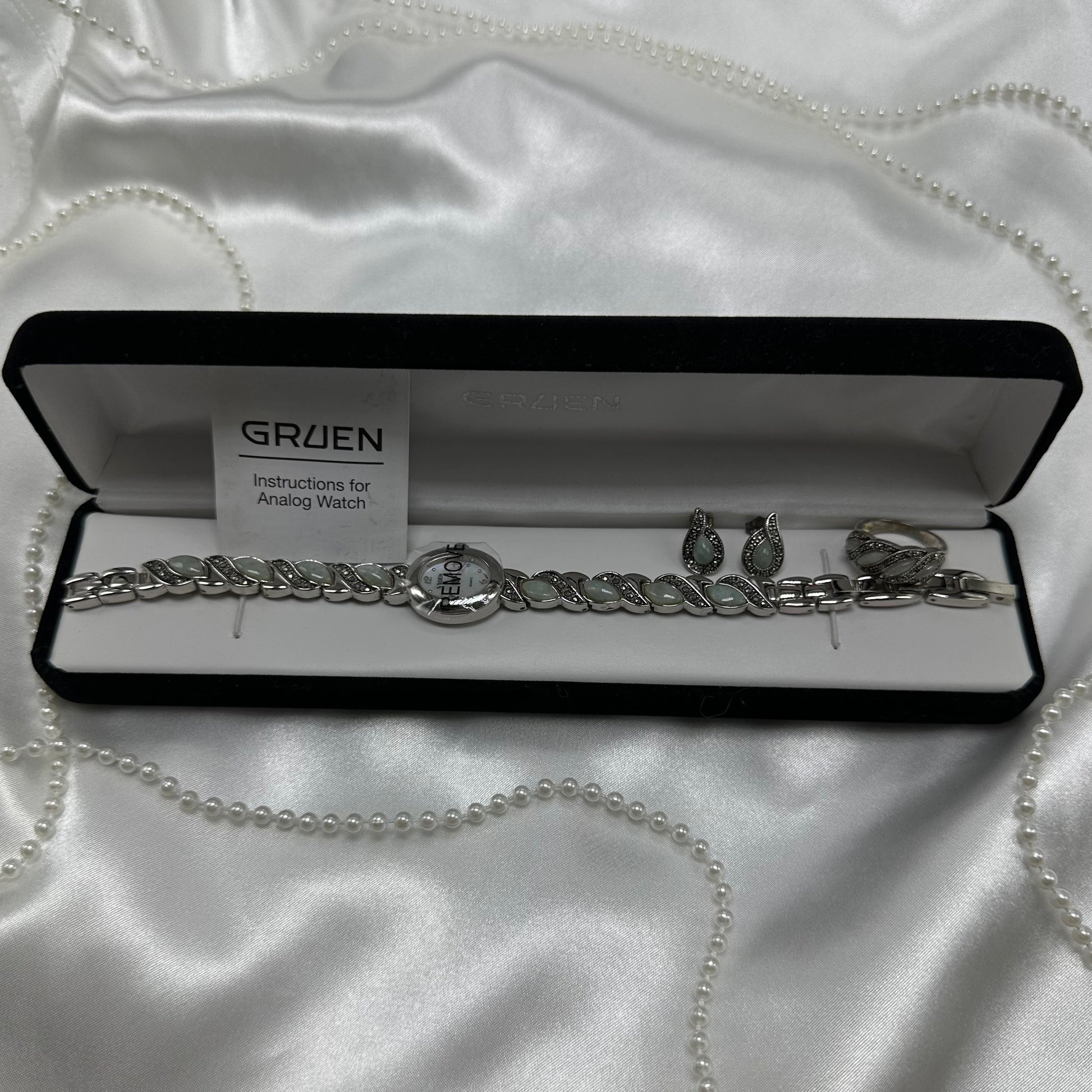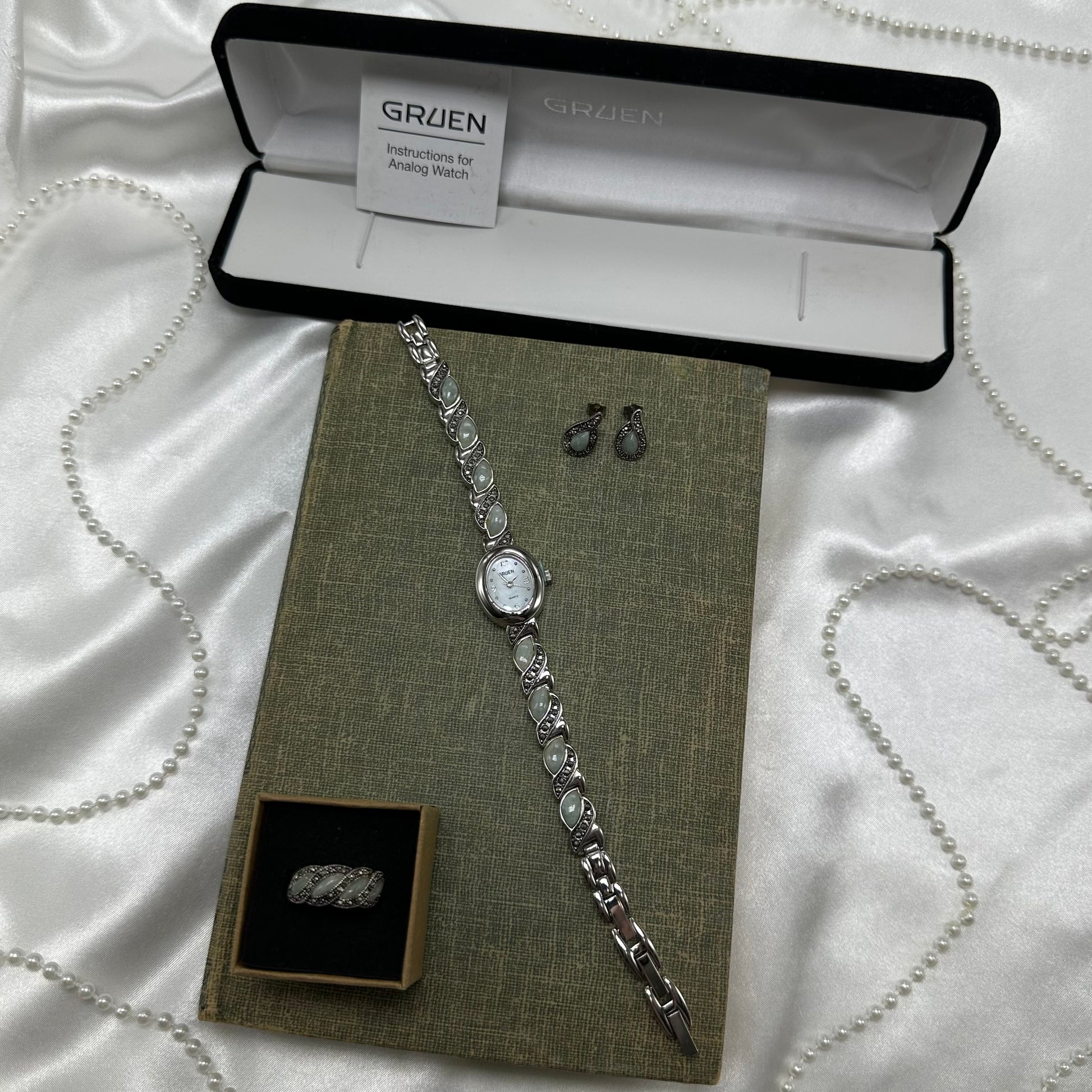 Sterling silver vintage marcasite Gruen jewelry set. Includes jade gemstone Gruen watch, stud earrings, and ring. Ring is size 6.5. Marked 925.