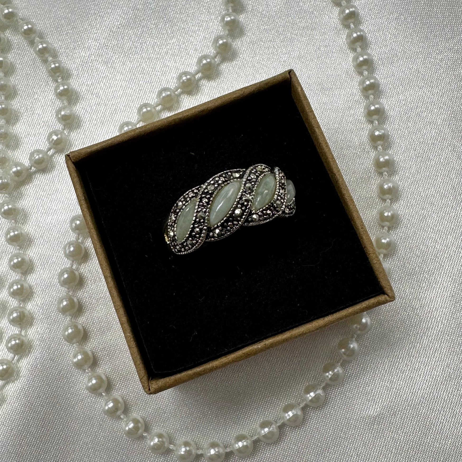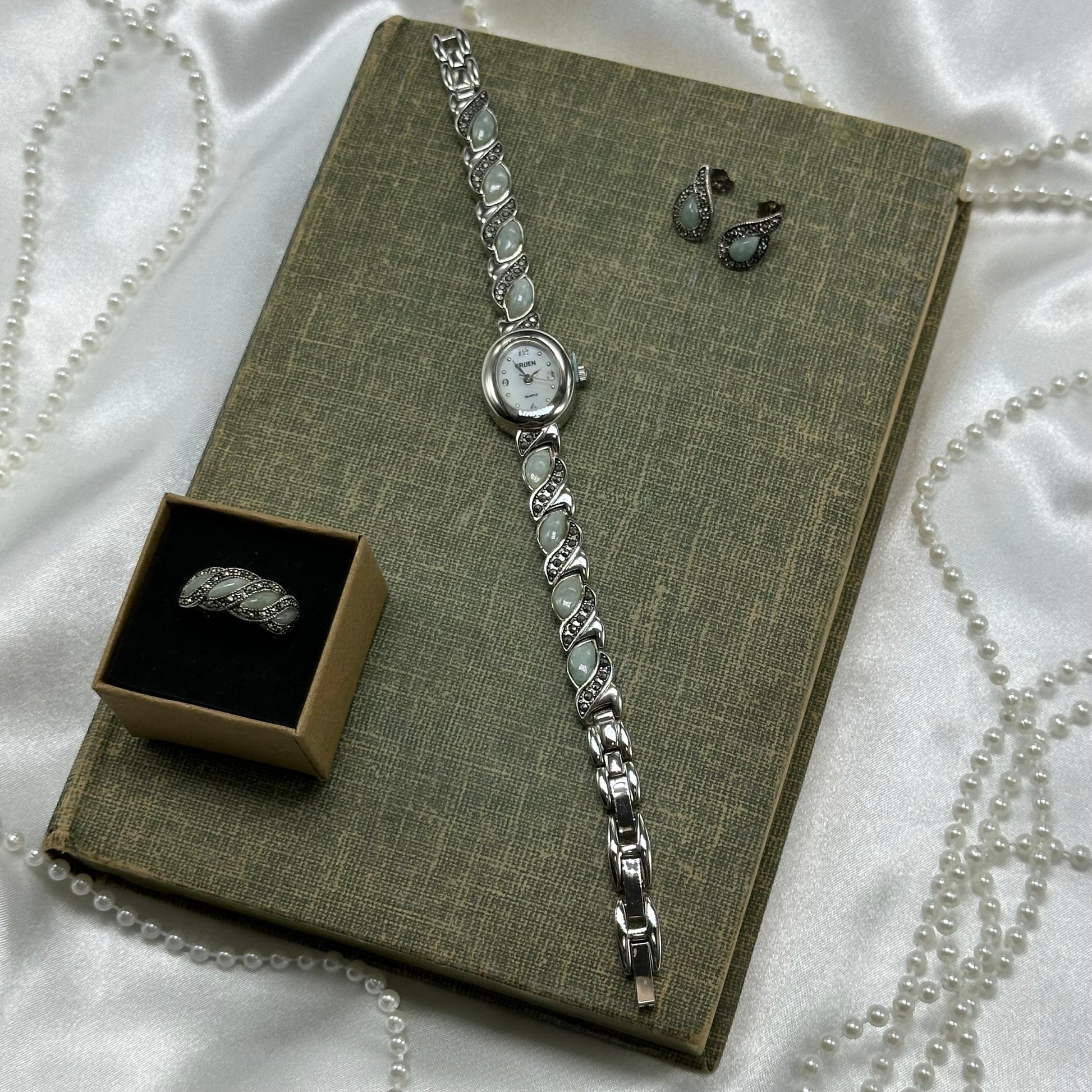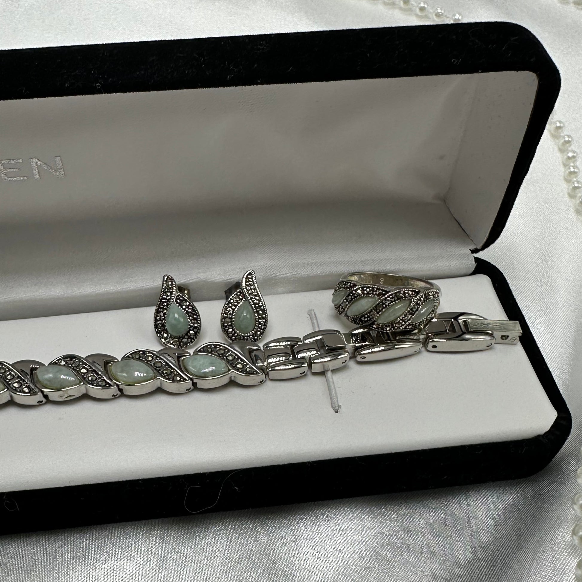Sterling silver vintage marcasite Gruen jewelry set. Includes jade gemstone Gruen watch, stud earrings, and ring. Ring is size 6.5. Marked 925.