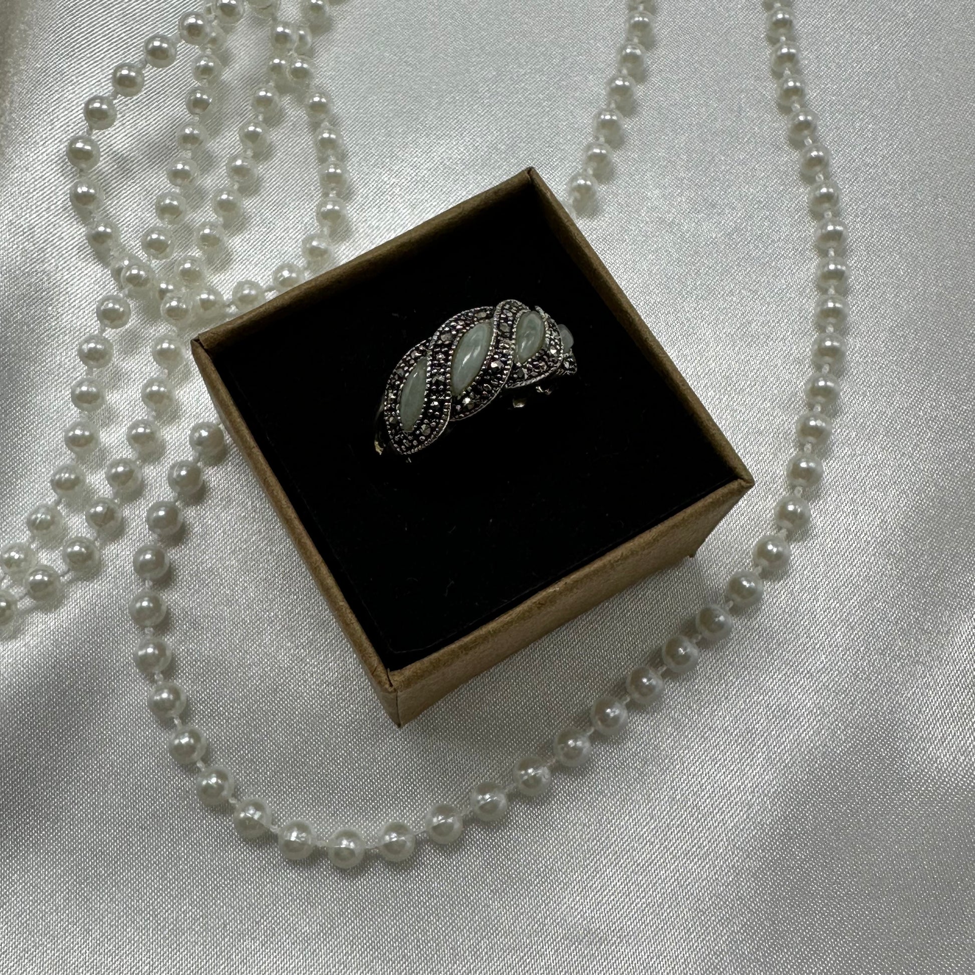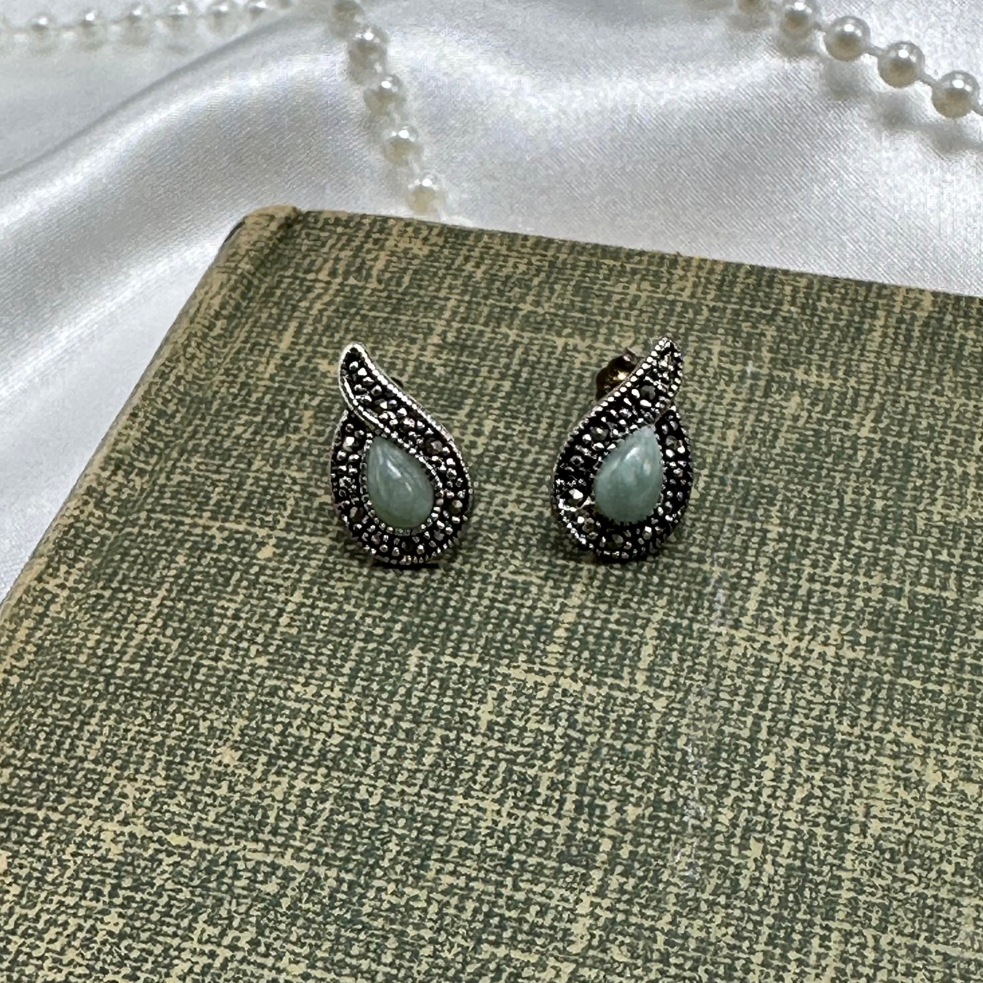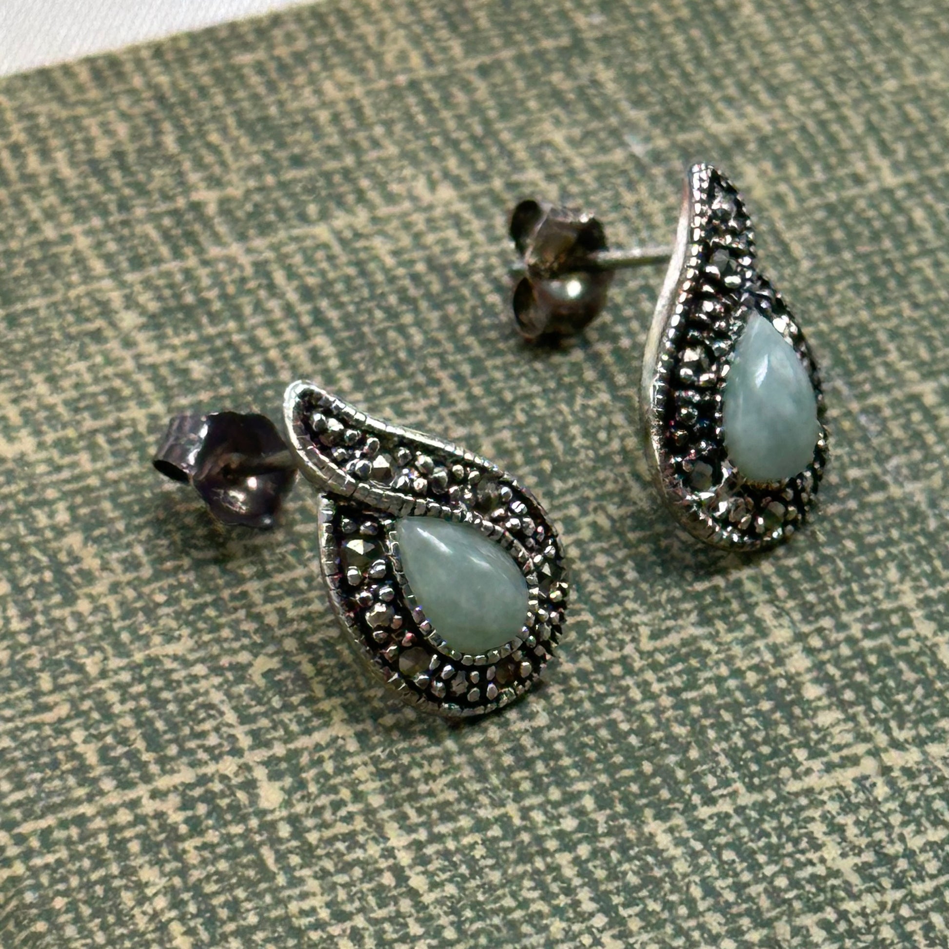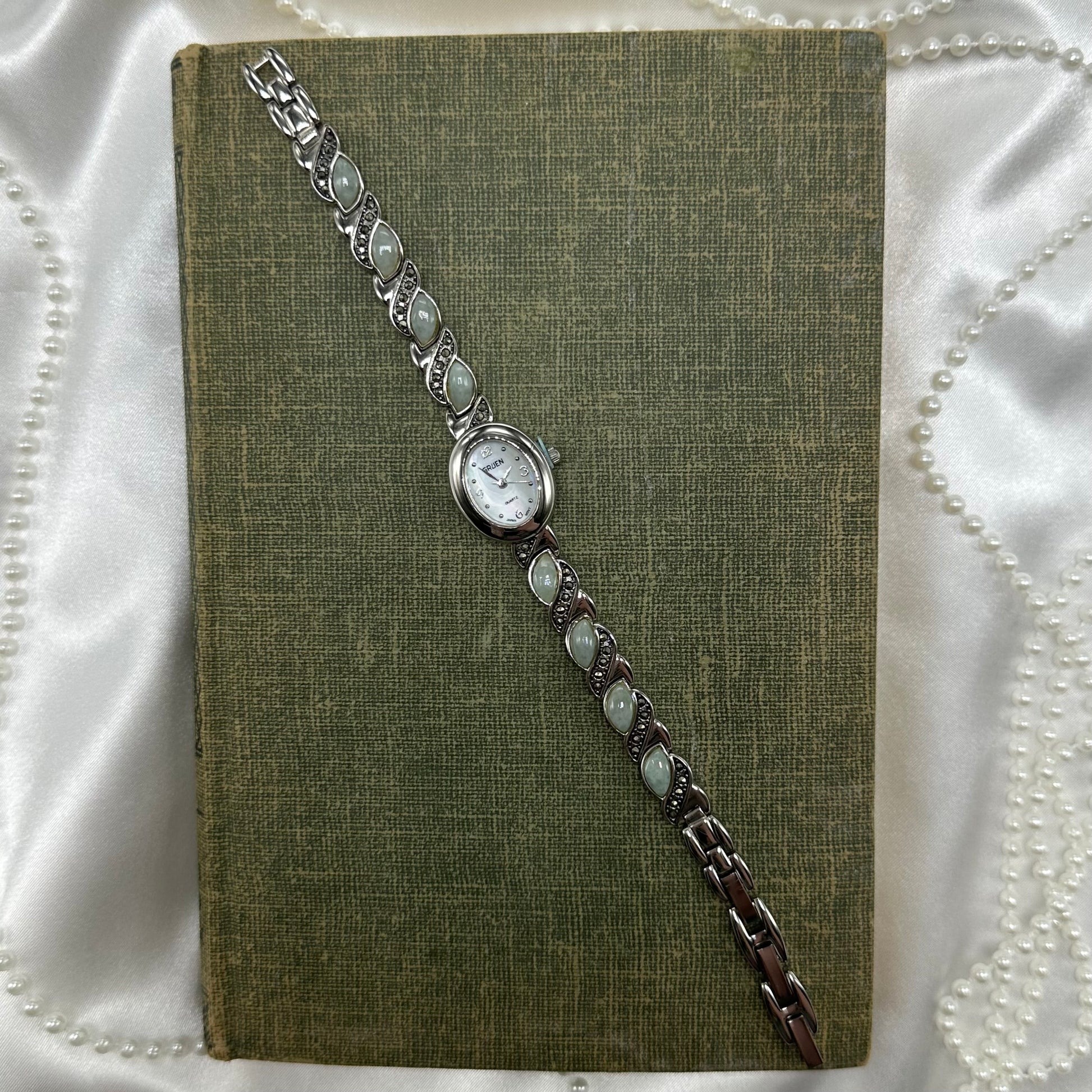 Sterling silver vintage marcasite Gruen jewelry set. Includes jade gemstone Gruen watch, stud earrings, and ring. Ring is size 6.5. Marked 925.