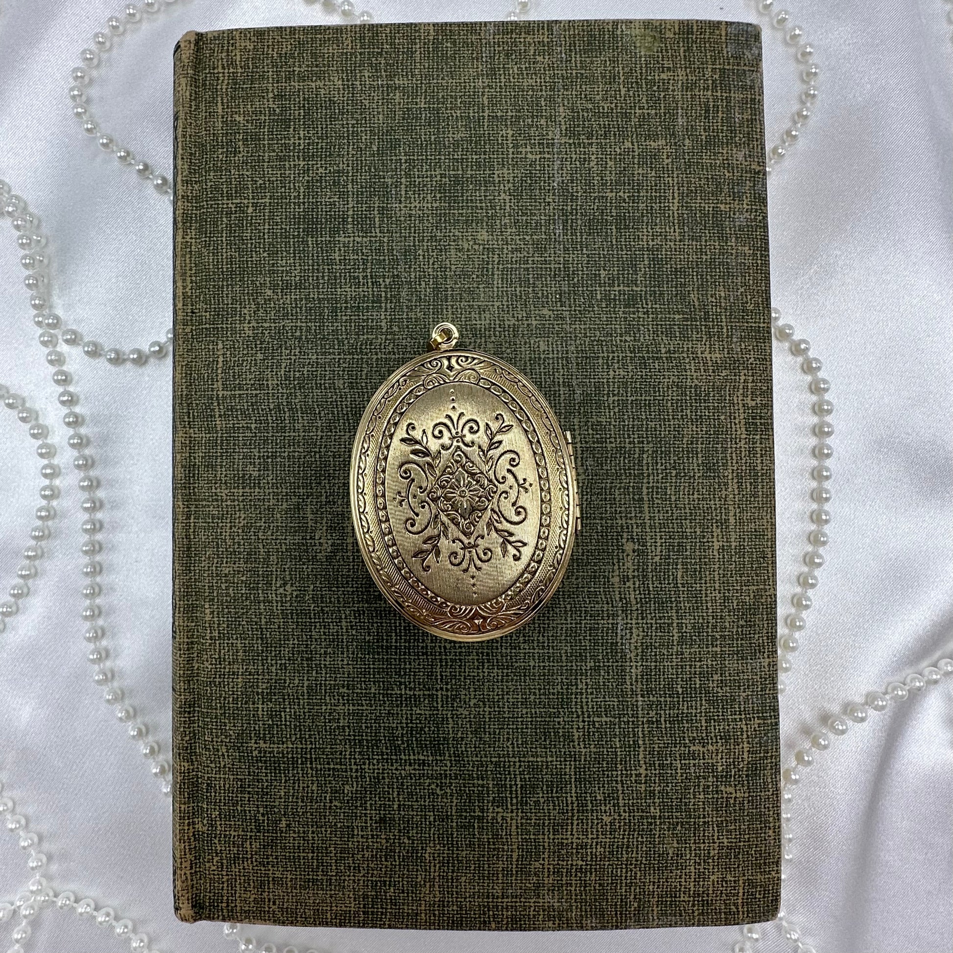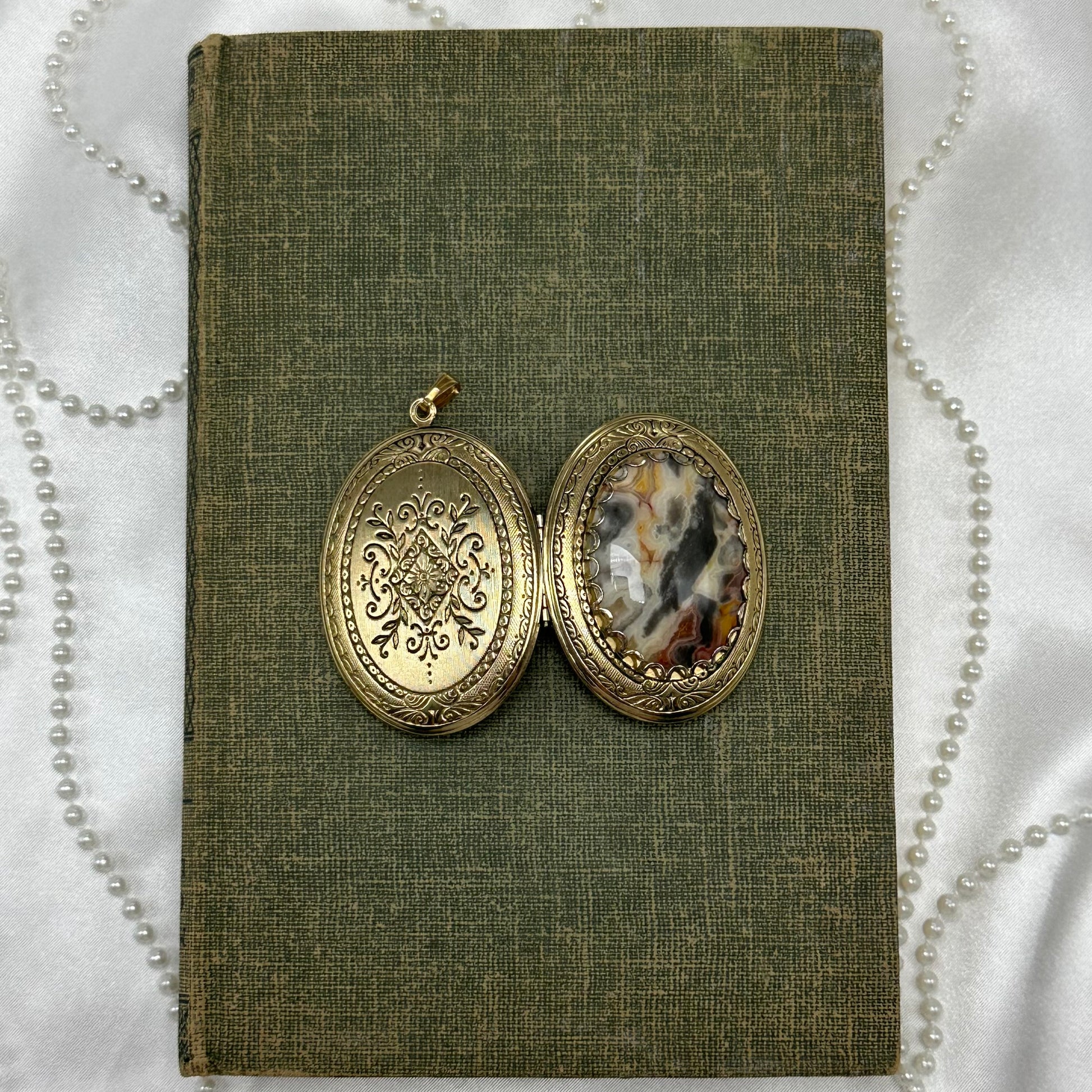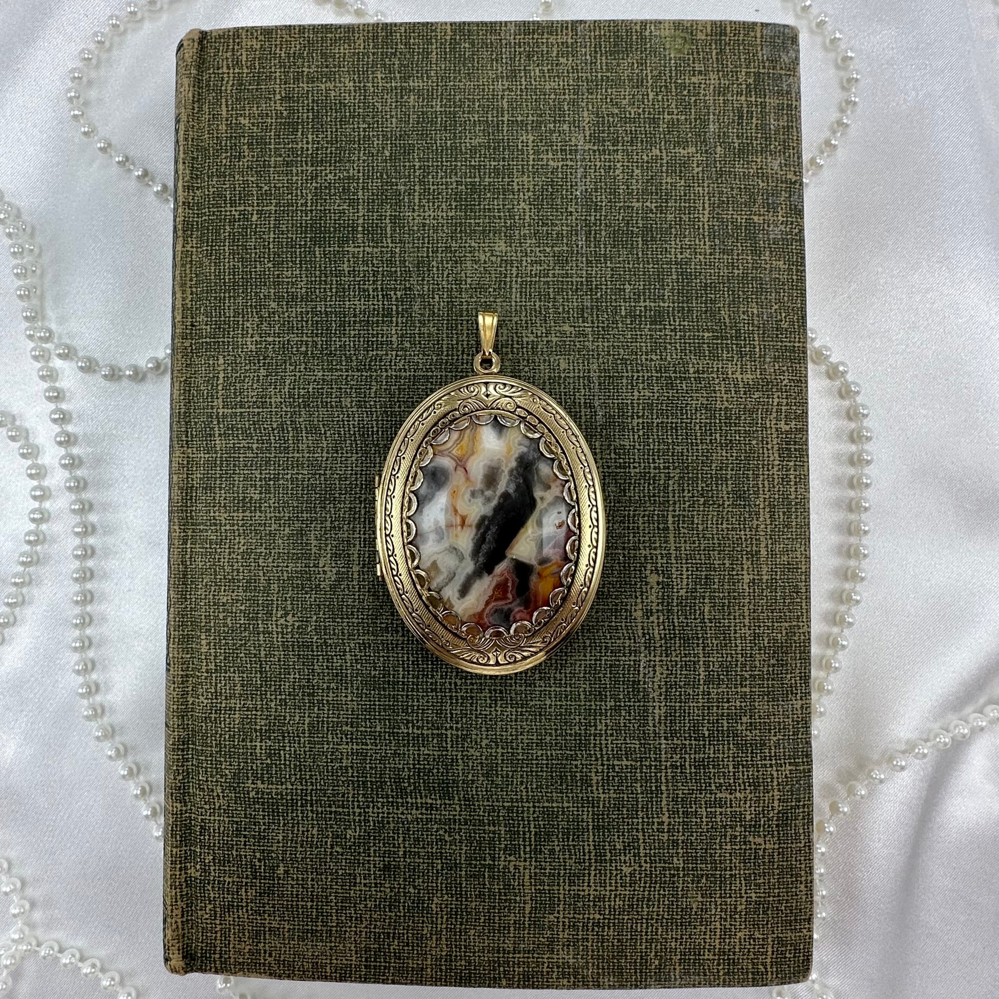Vintage filigree oval hanging photo locket with gorgeous multicolor stone.