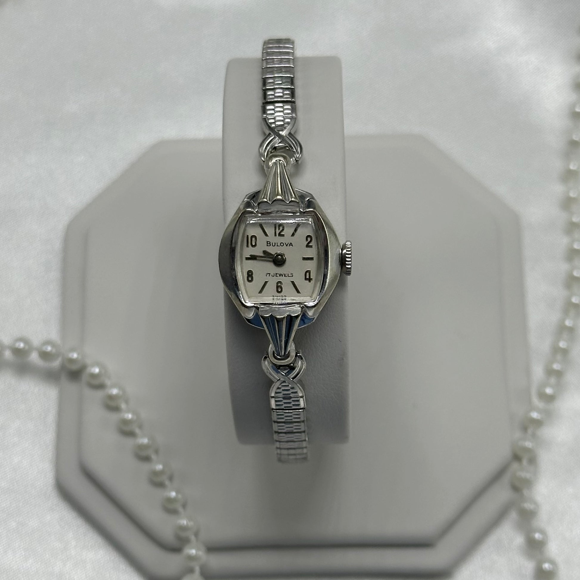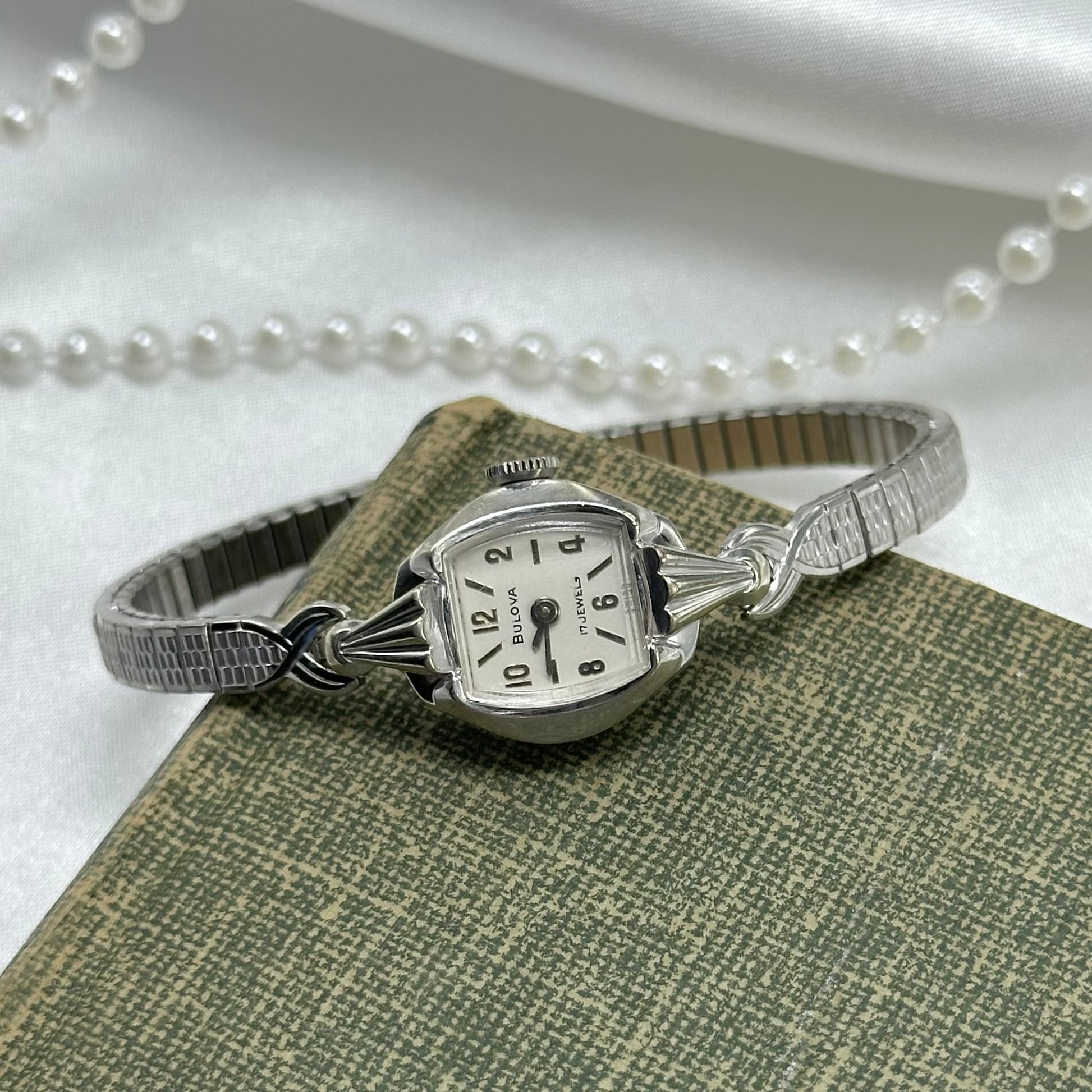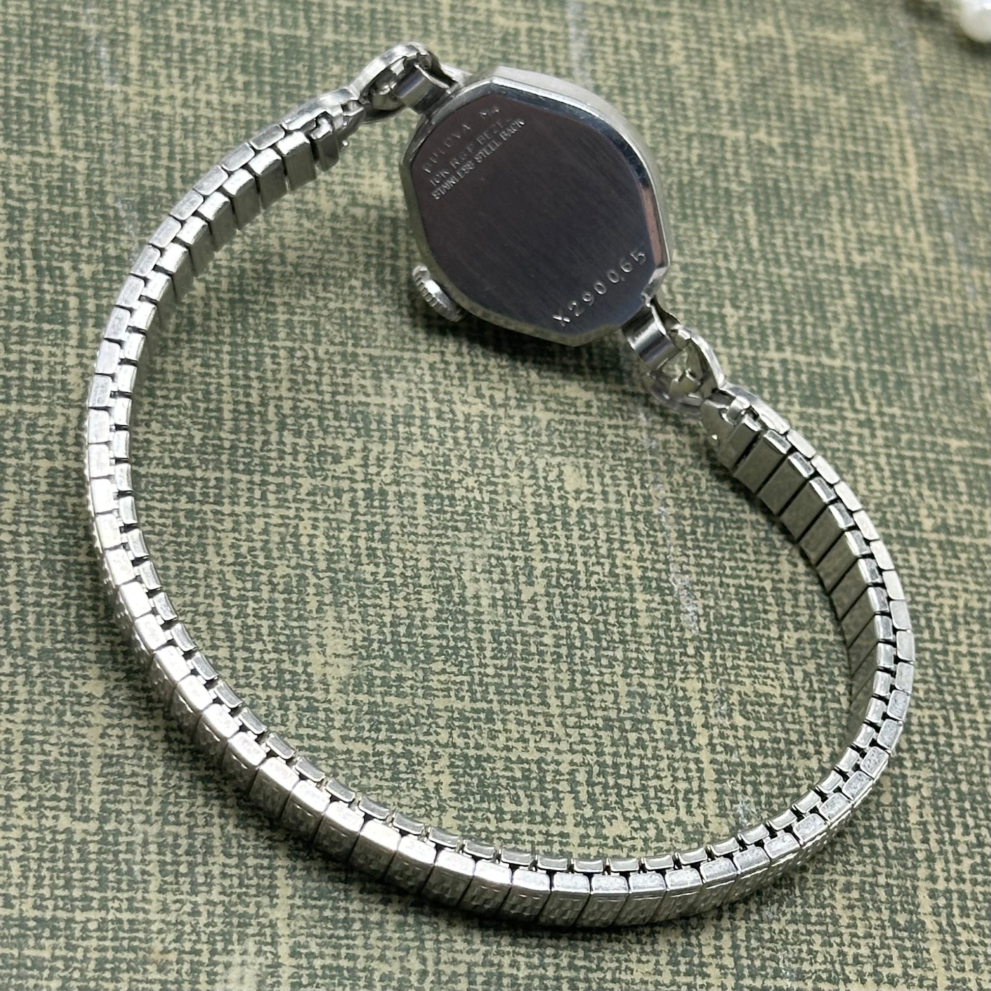Vintage Bulova 17 Jewels 10k rolled gold-plated manual winding cocktail watch with stretchable band from the 1960s. Watch comes with original BULOVA crown.