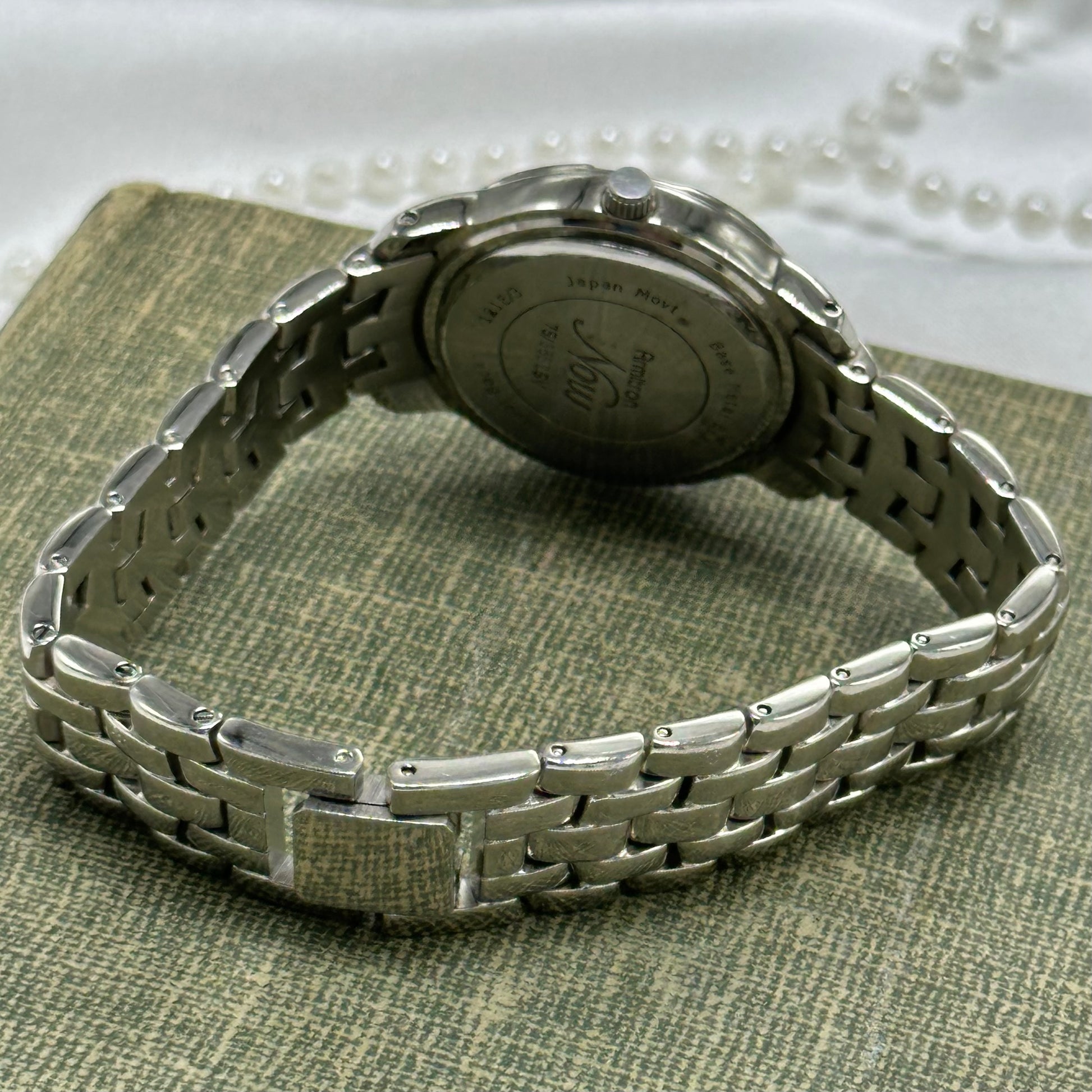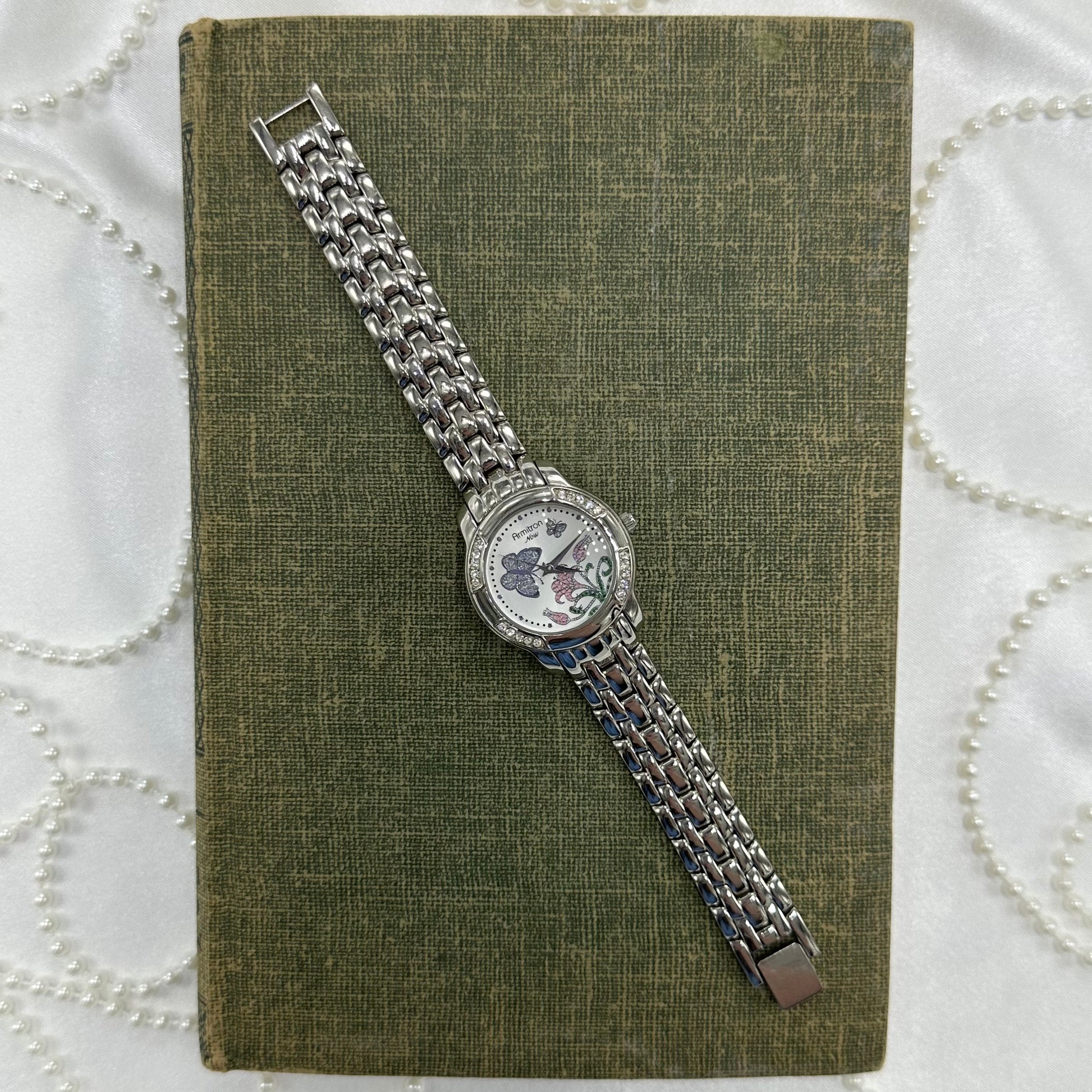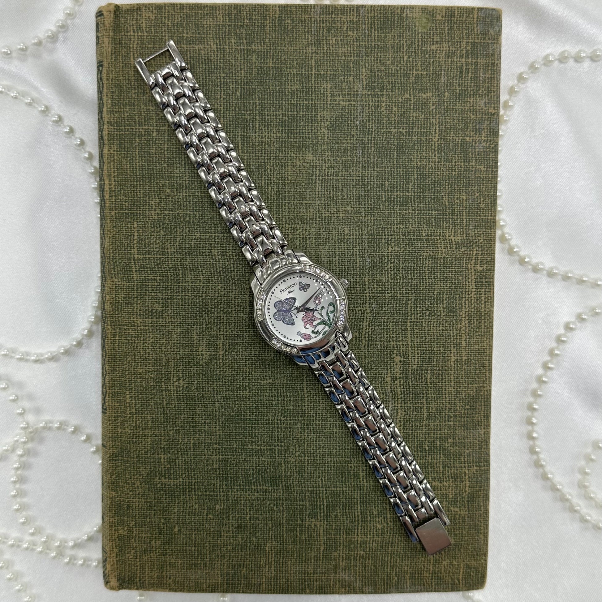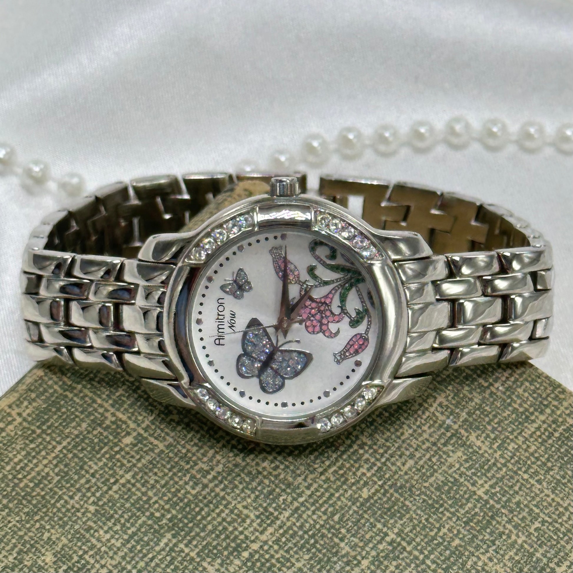 Vintage silver tone diamanté Armitron Now watch with purples butterflies and pink flower dial.