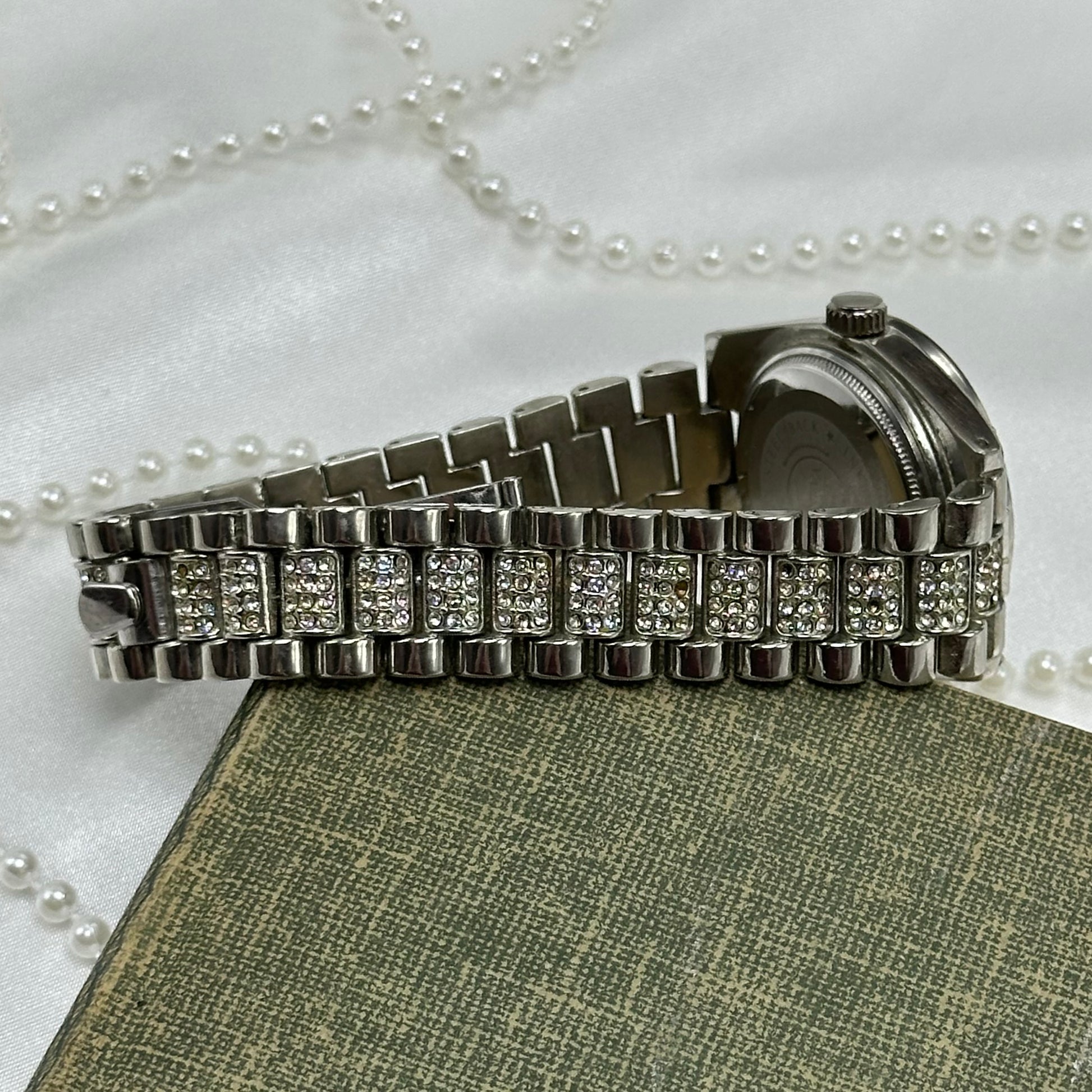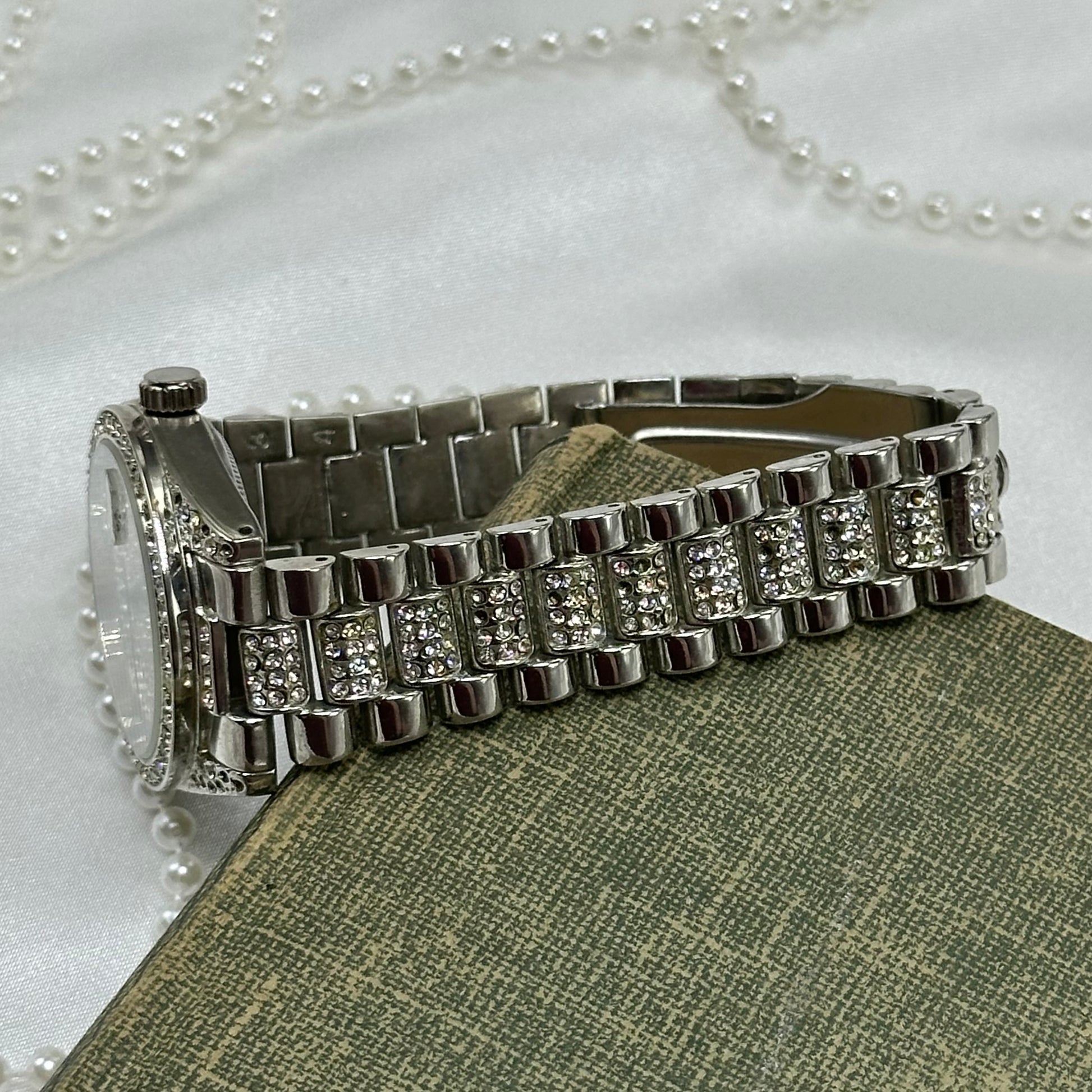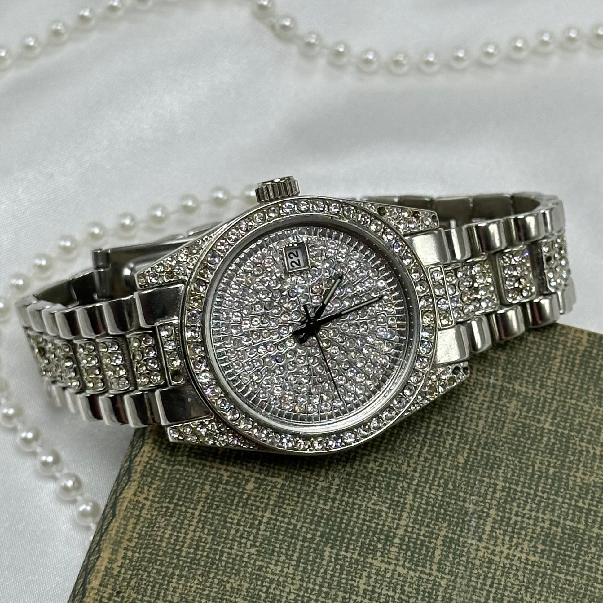 Silver tone diamanté Geneva watch with date display and quartz movement. Watch is water resistant. Several stones are missing.