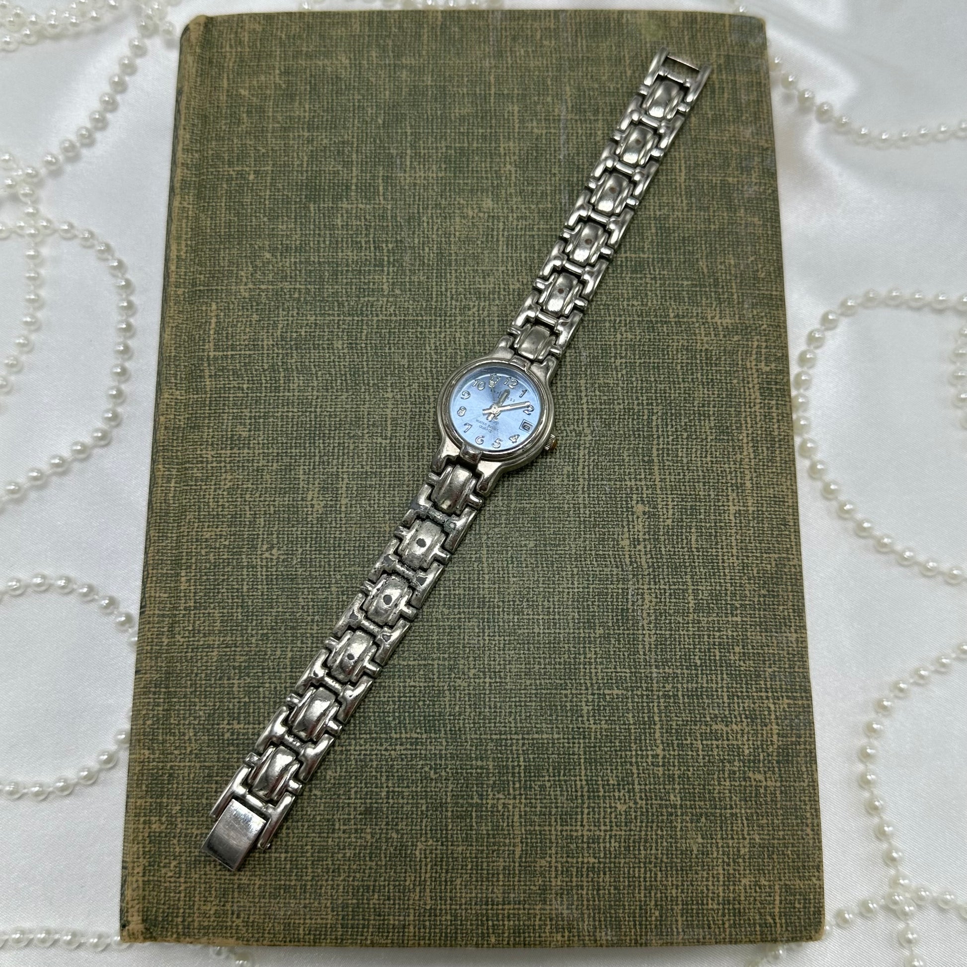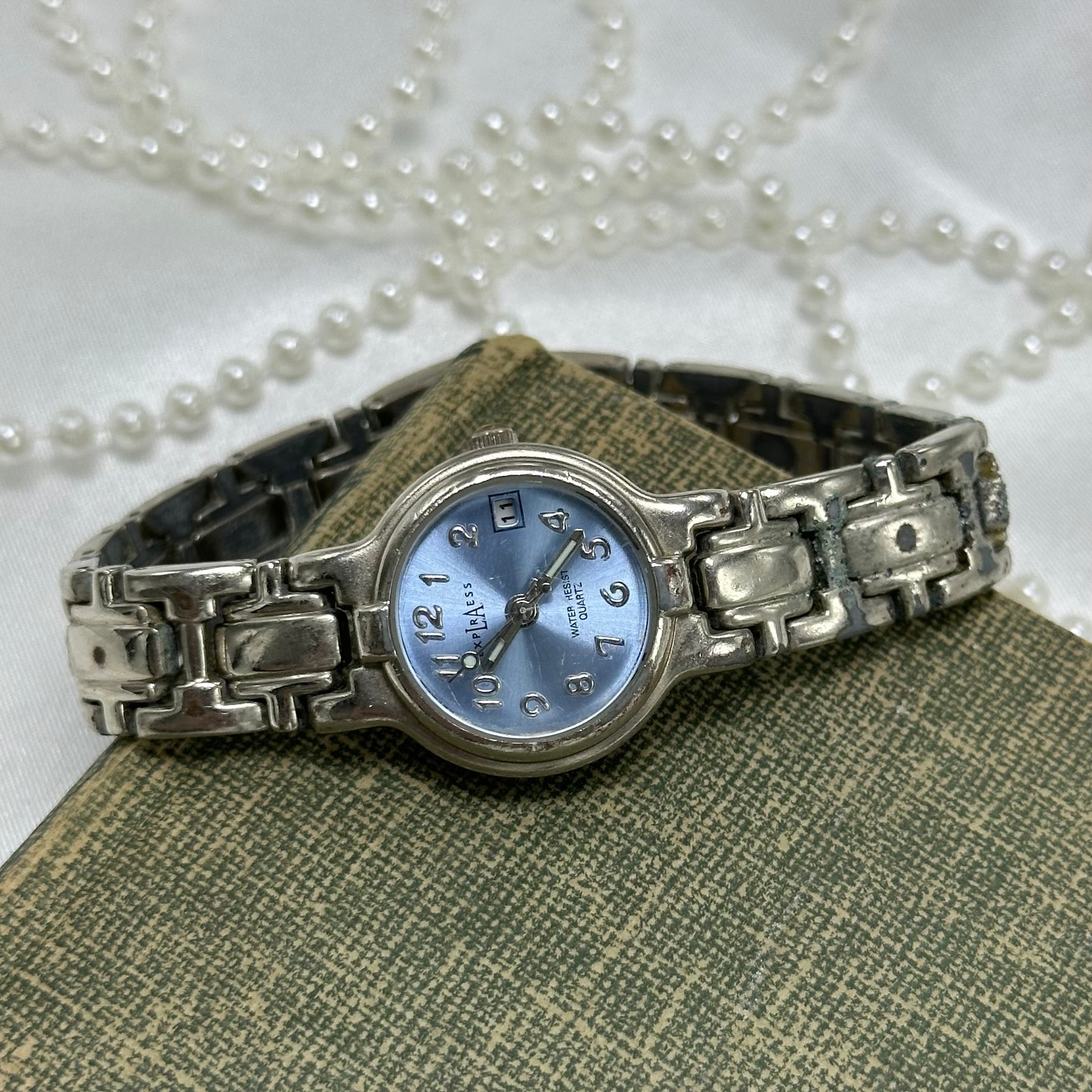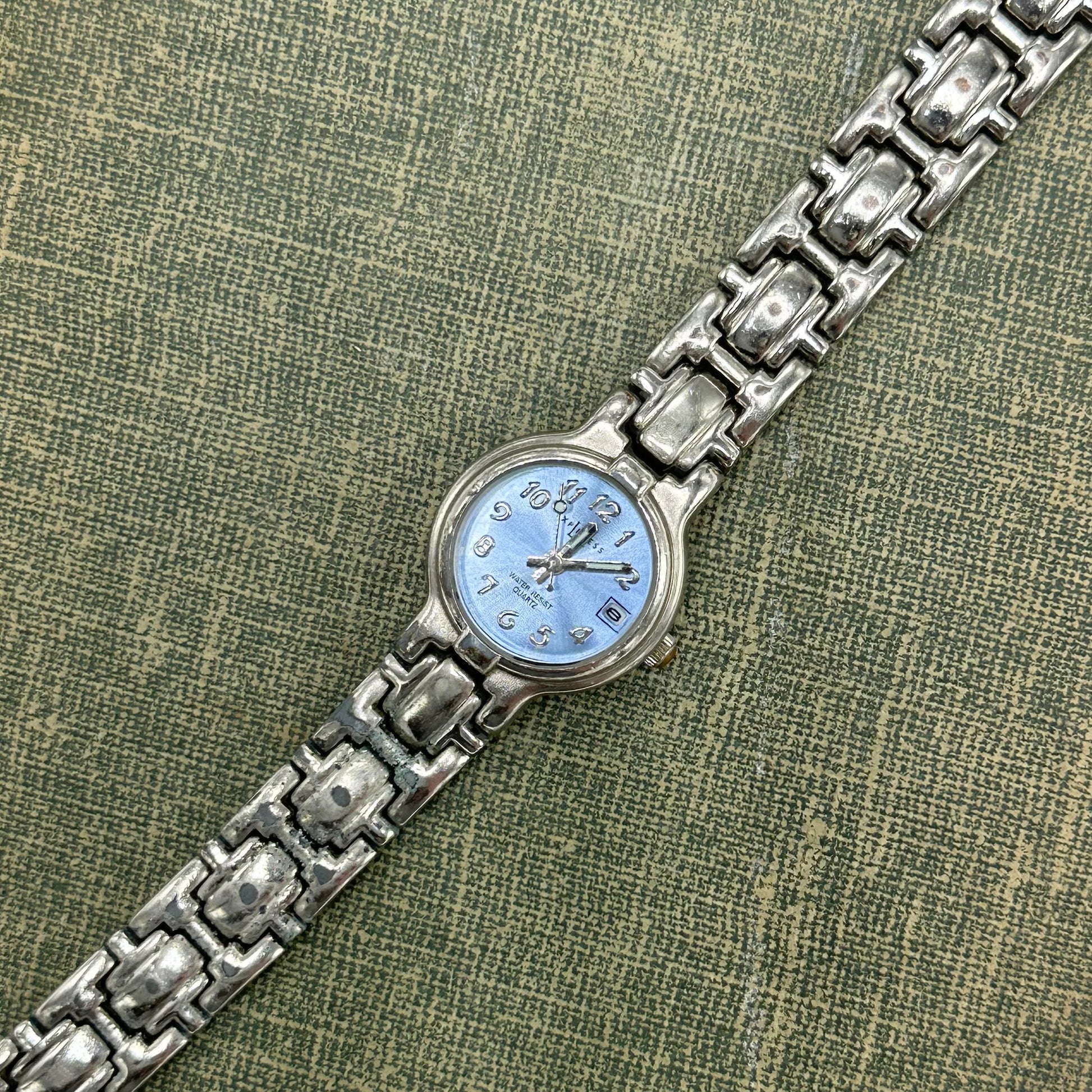 Silver tone light blue dial LA Express watch with date display and clasp band.