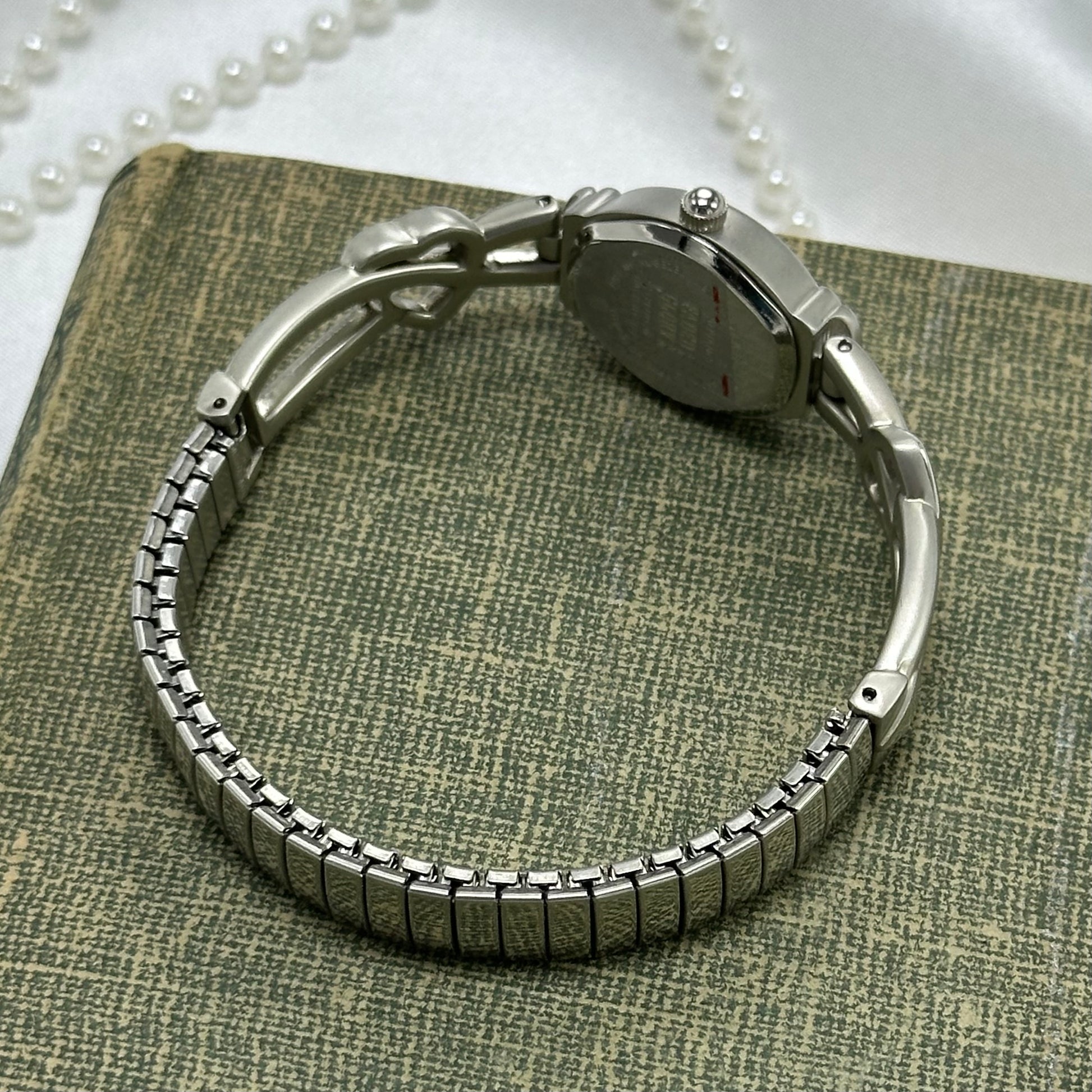 Dainty silver tone watch with heart band and quartz movement. Dial is a teal blue.