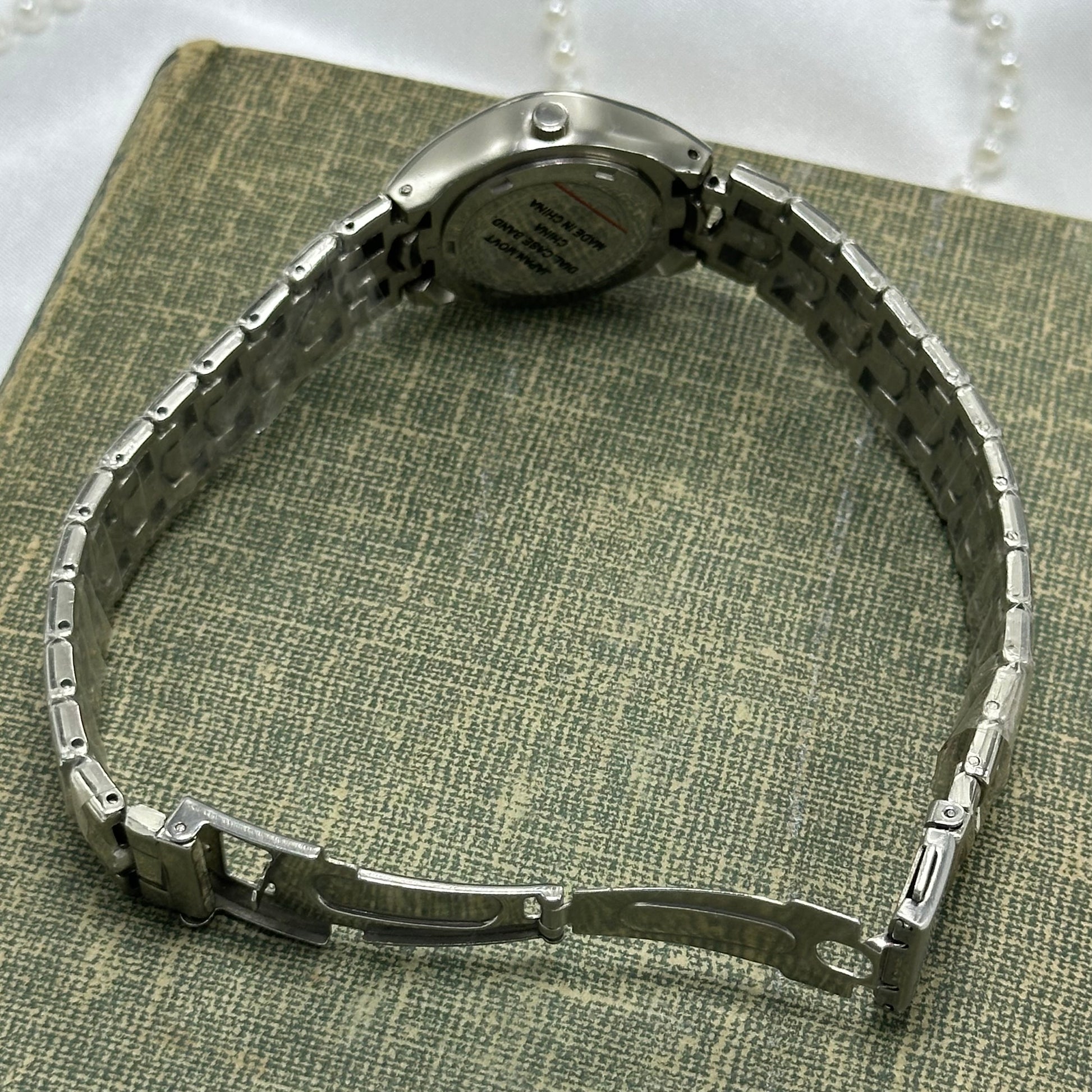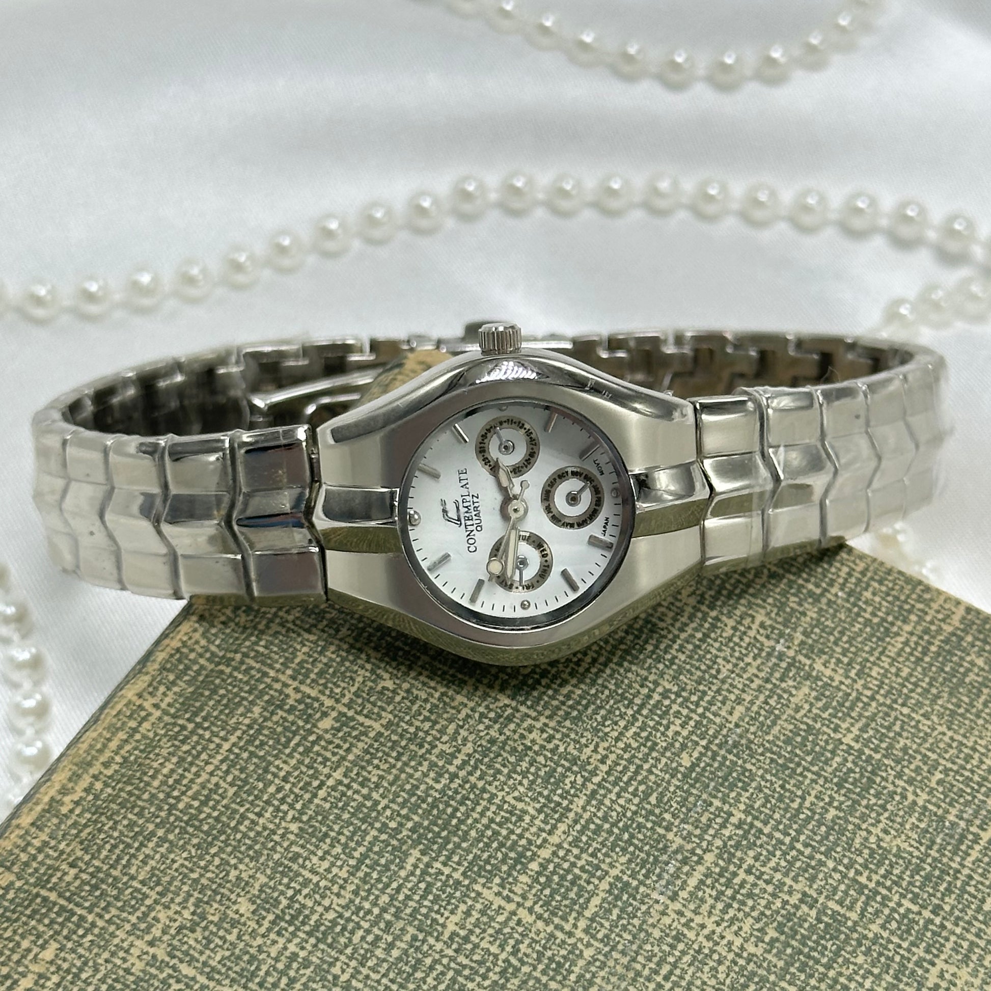 Silver tone Contemplate watch with unique calendar display dial and double locking fold over clasp. Band still has protective plastic cover.