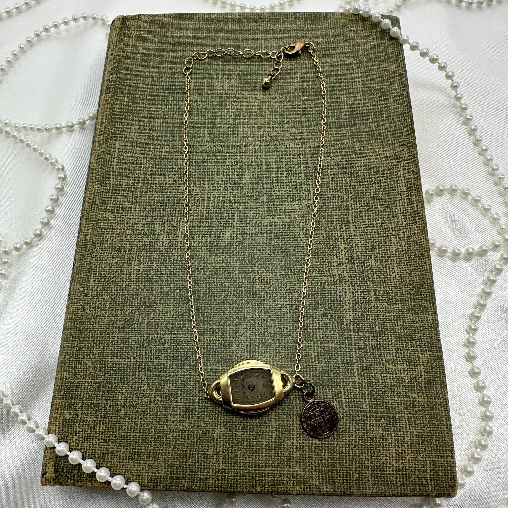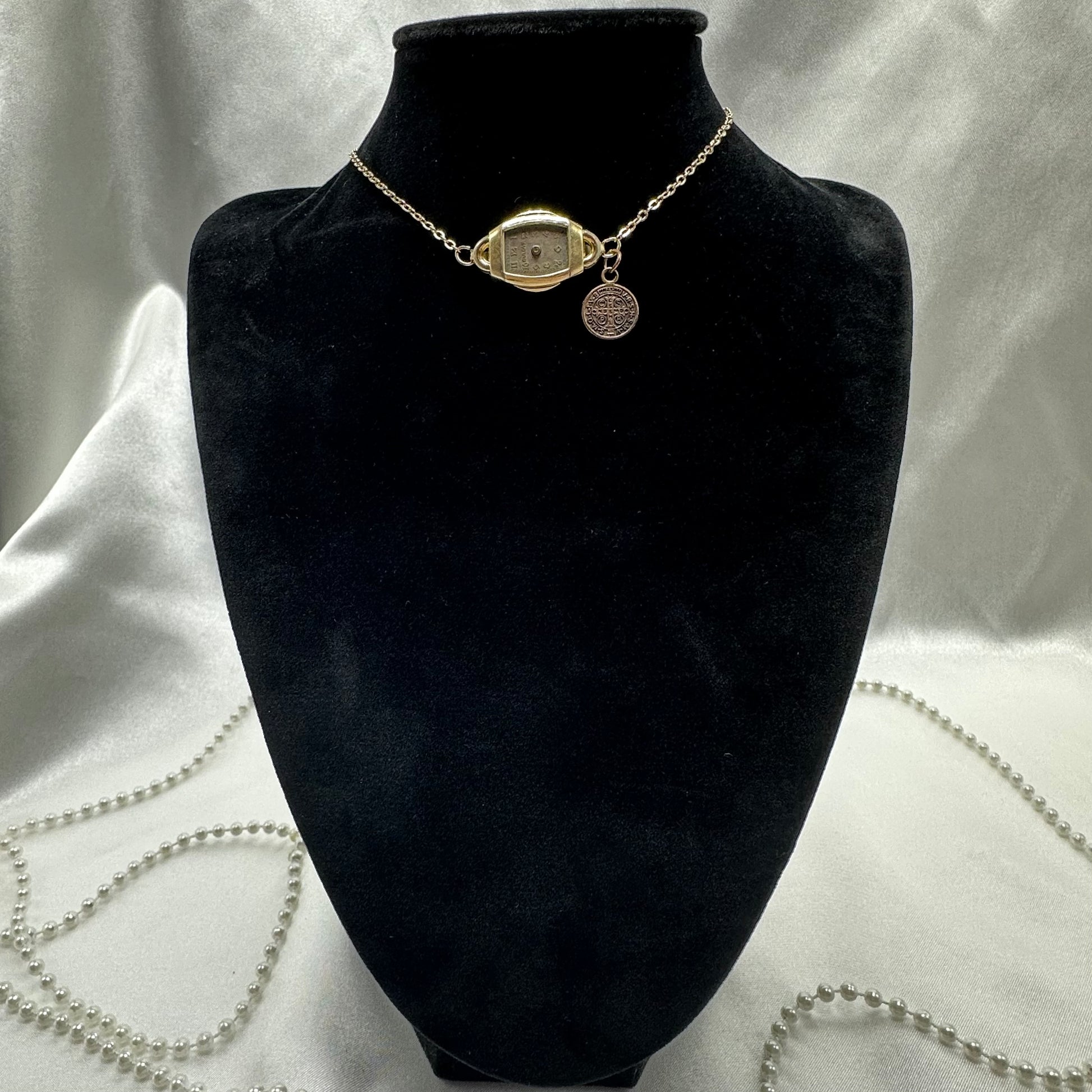 Gold tone choker necklace with vintage watch and Saint Benedict medal.