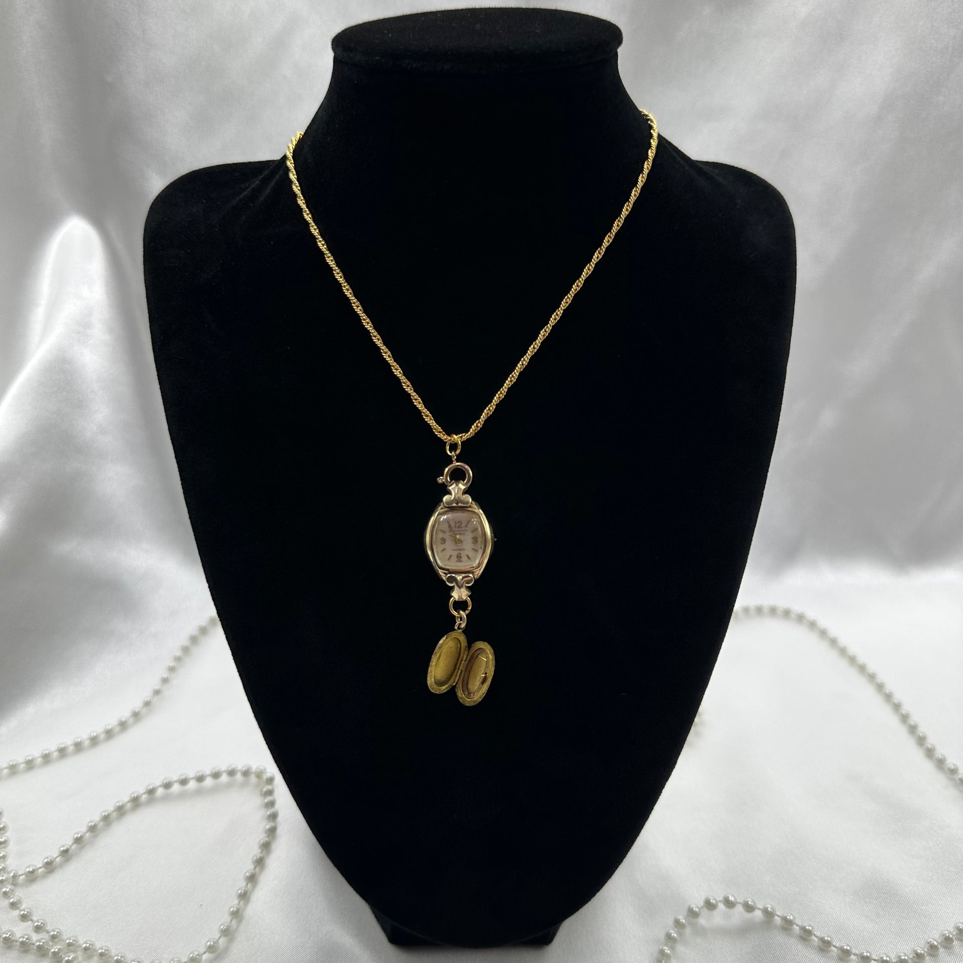 Gold tone necklace with vintage 10k RGP watch and oval locket pendant. Matching bracelet.