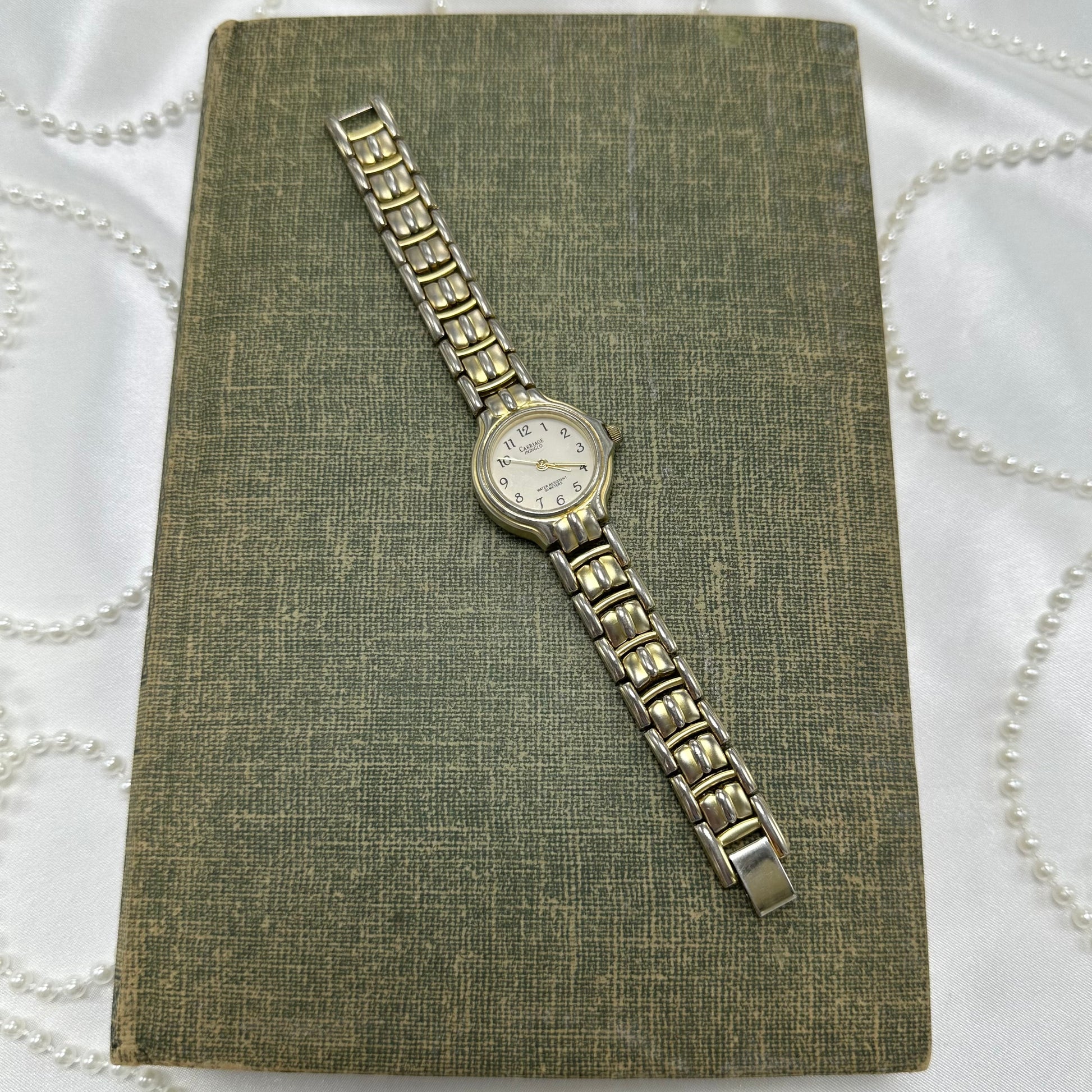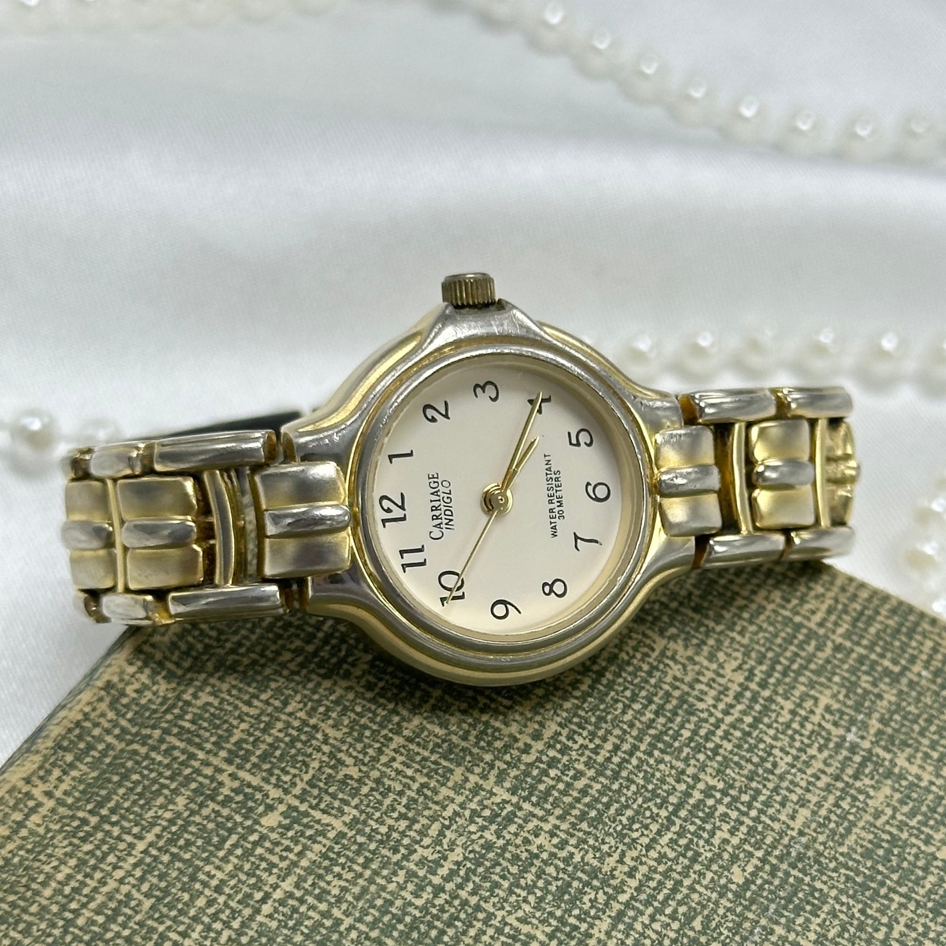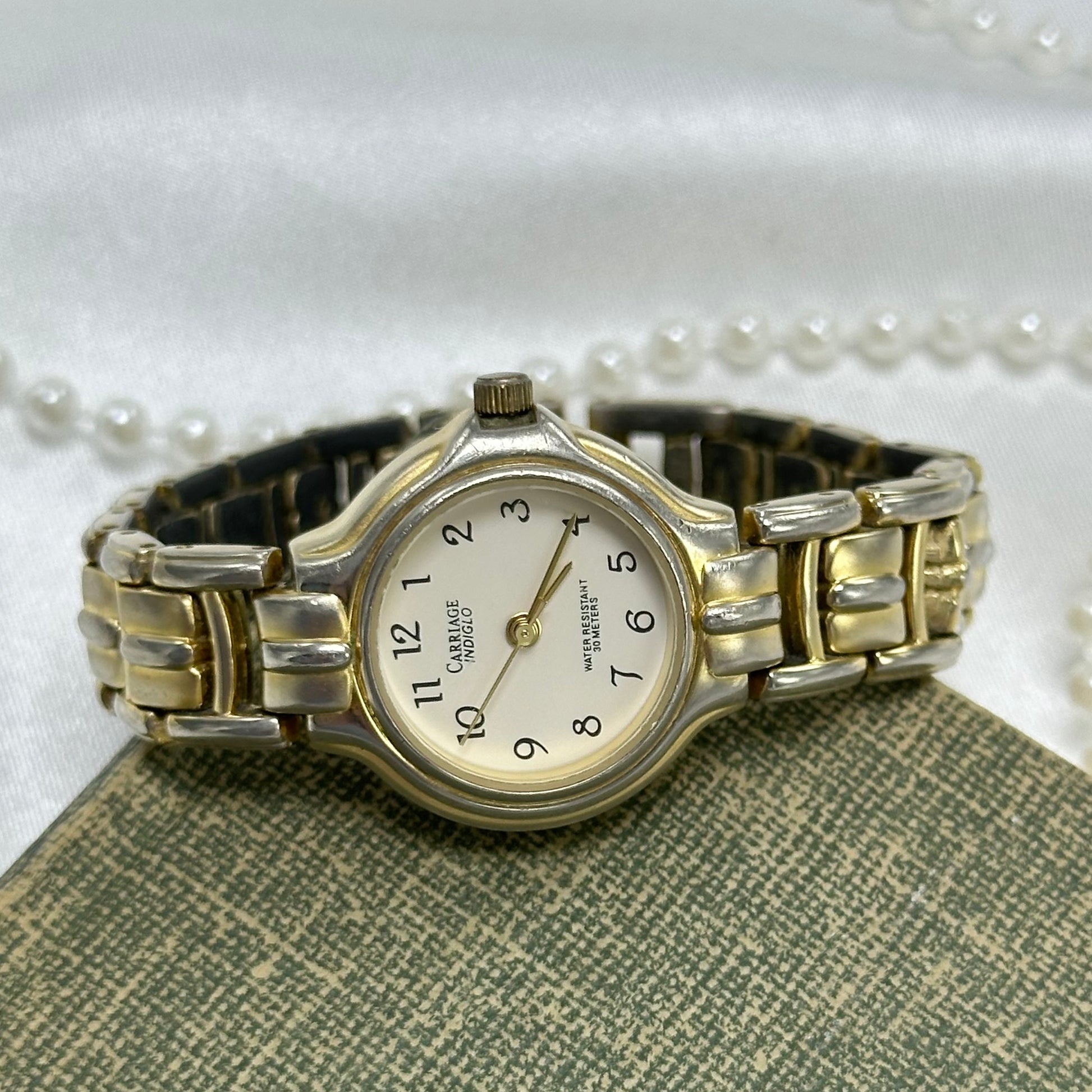 Gold and silver tone Carriage Indiglo watch with quartz movement. Water resistant (30M). Dial glows when crown is pushed in.
