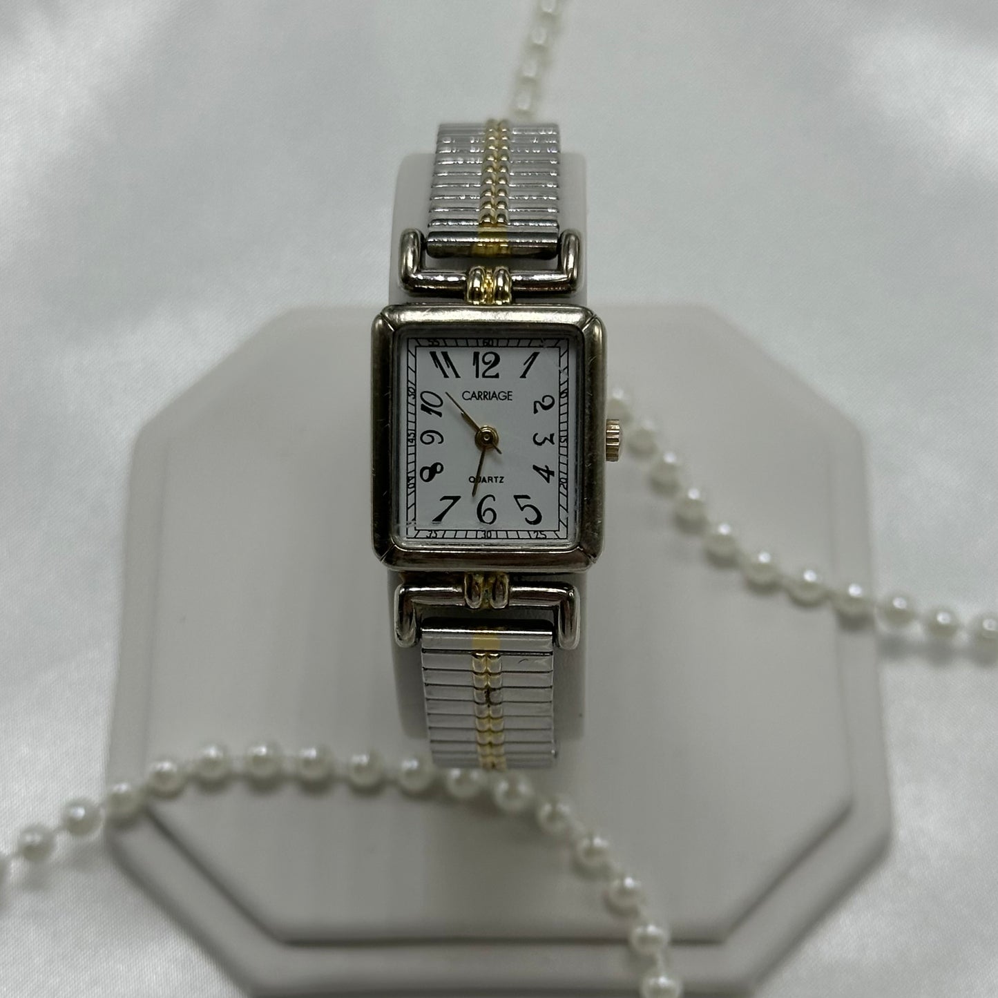 Vintage silver and gold tone Carriage watch with quartz movement and stretchable band.