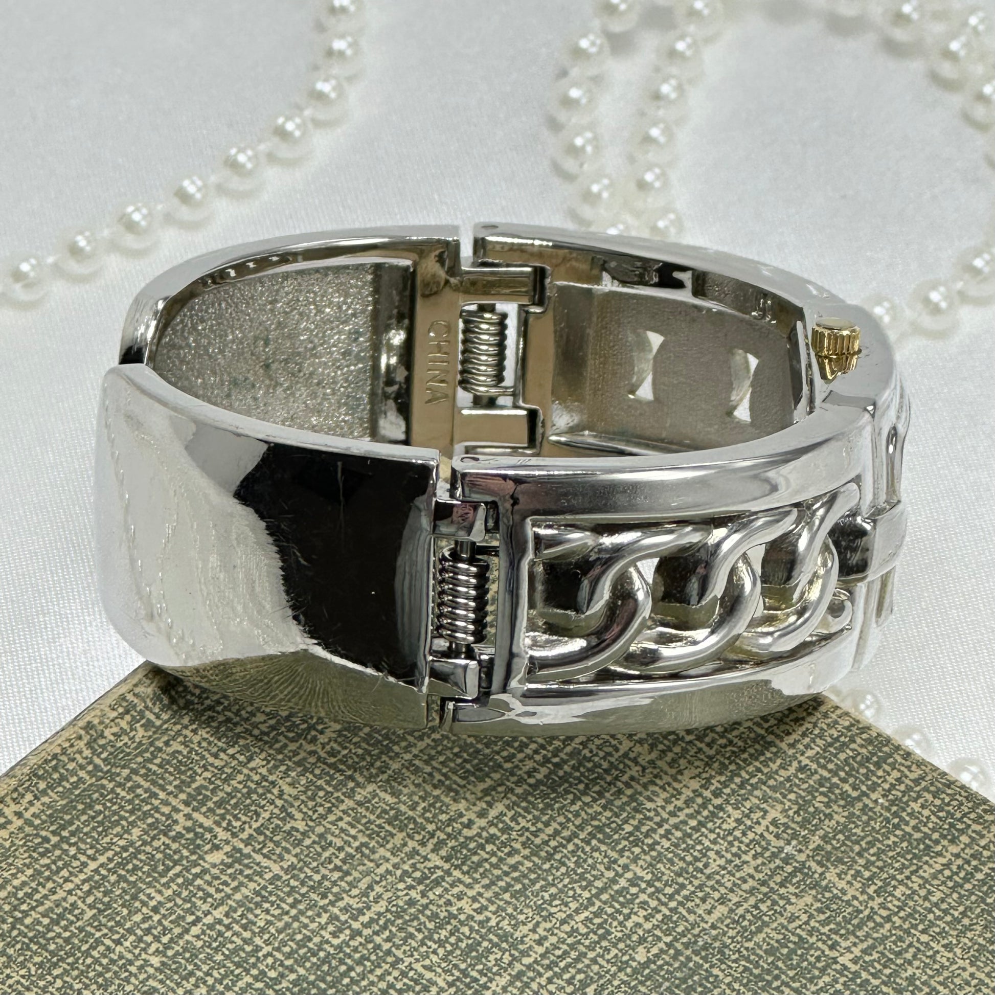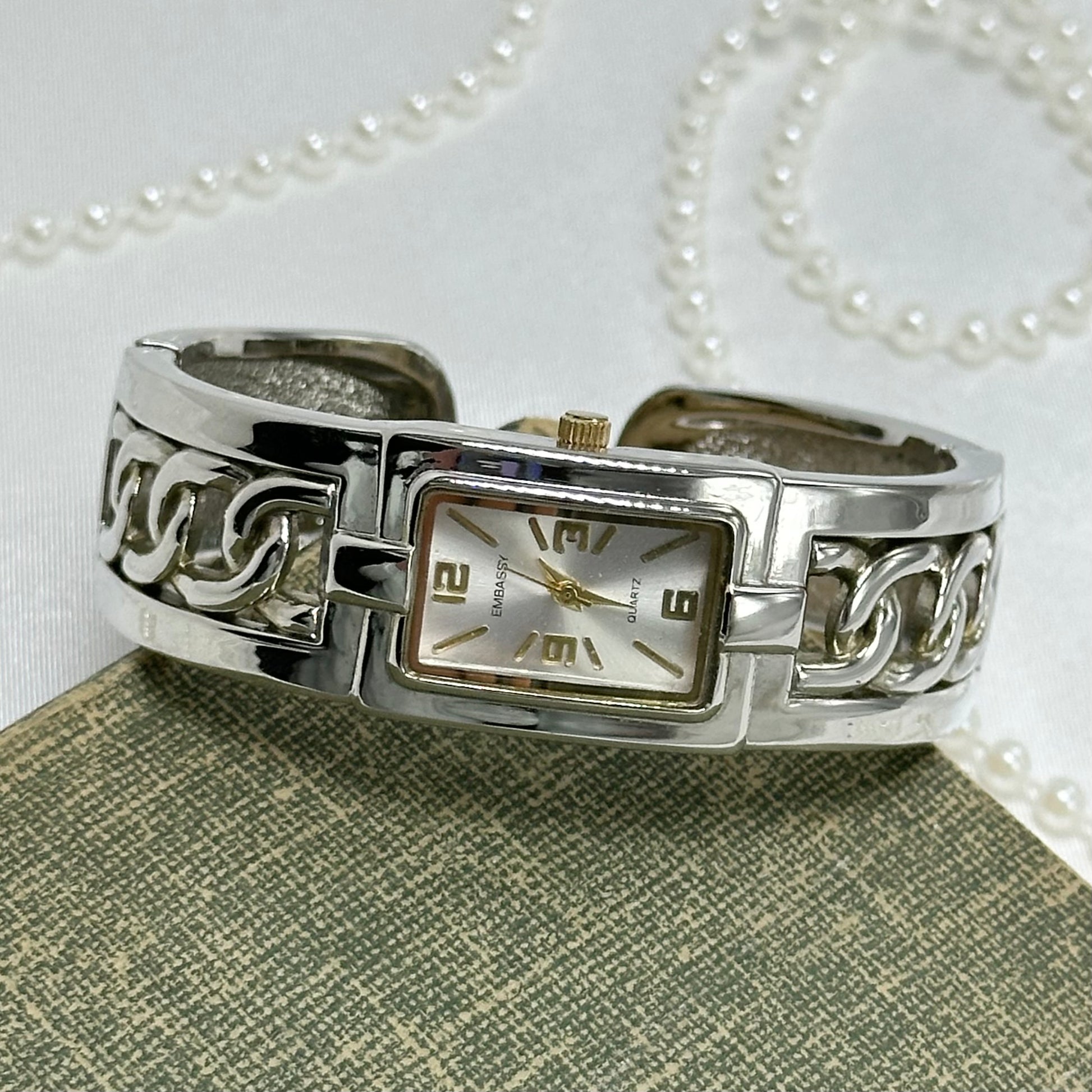 Vintage silver tone Embassy cuff watch with gold markers and crown.