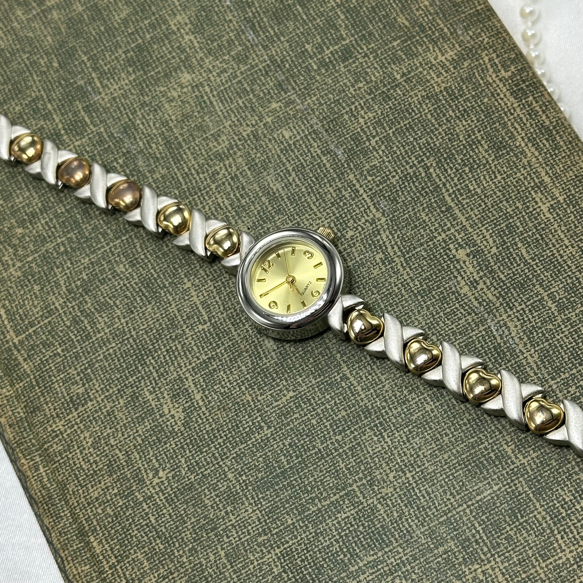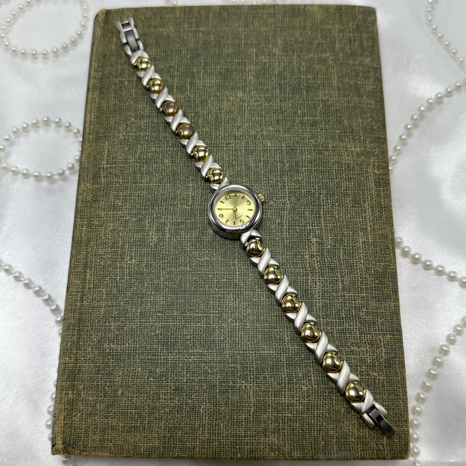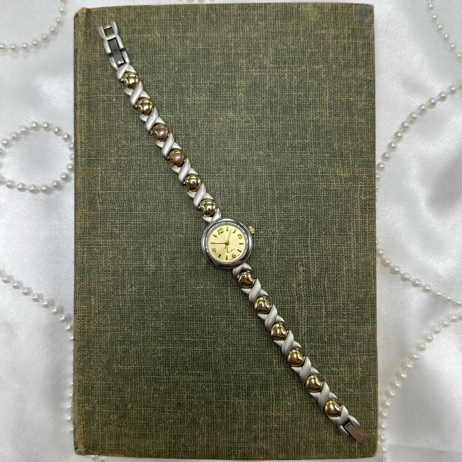 Silver and gold tone Faded Glory watch with unique heart bracelet band and quartz movement.