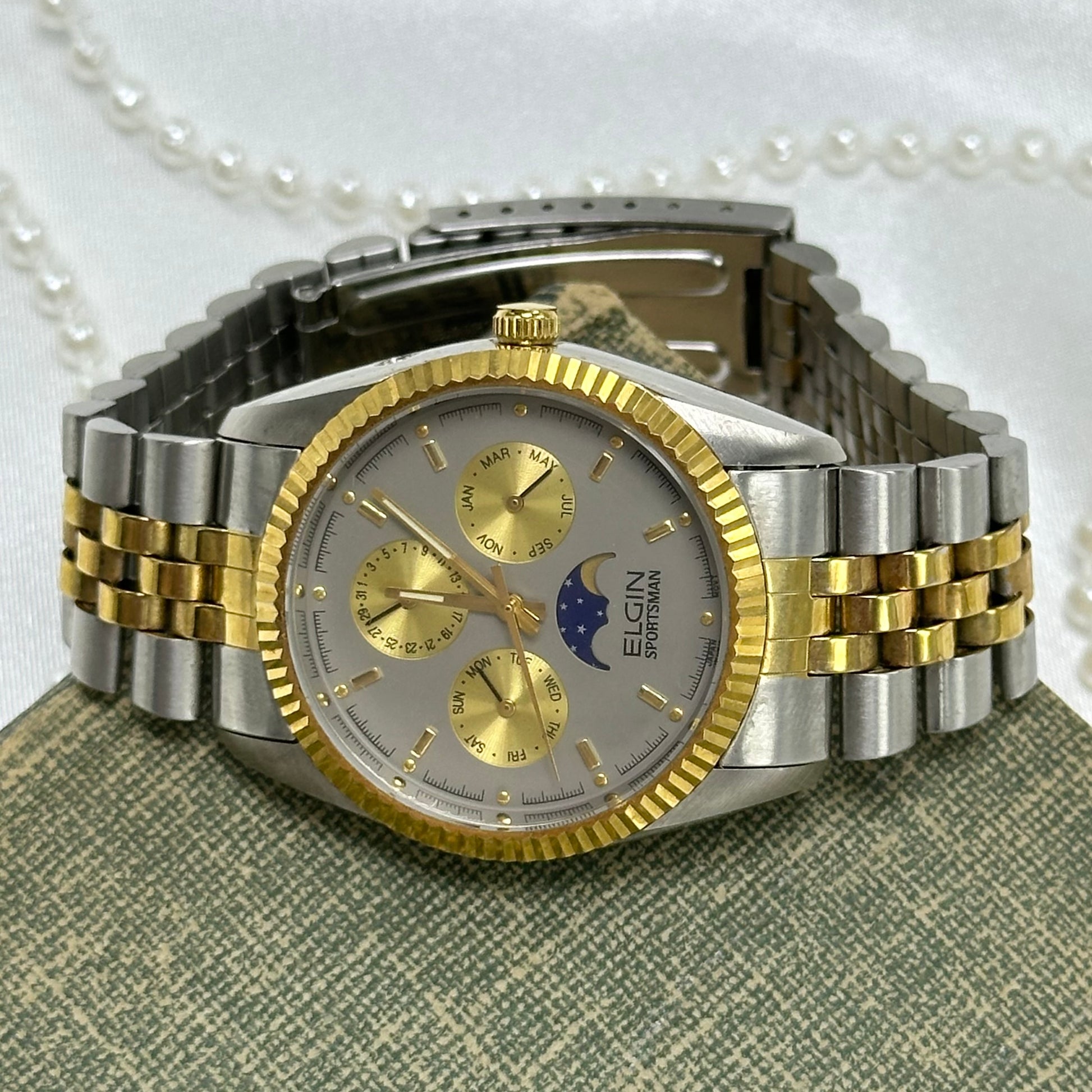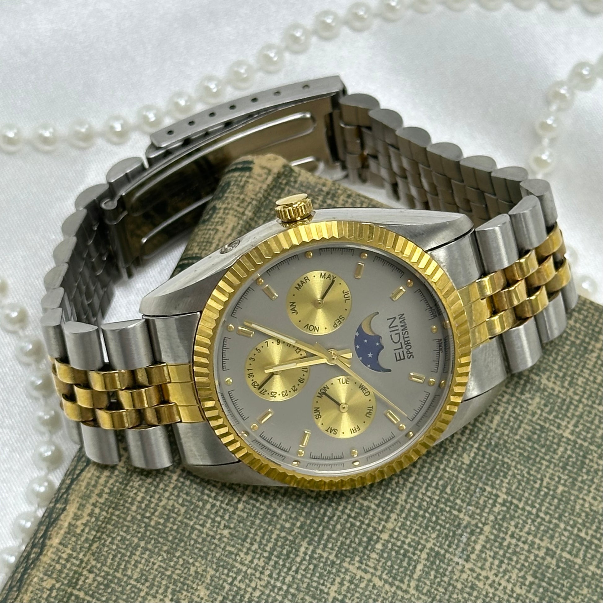 Silver and gold tone Elgin Sportsman moon phase watch with day, date, and month dial.