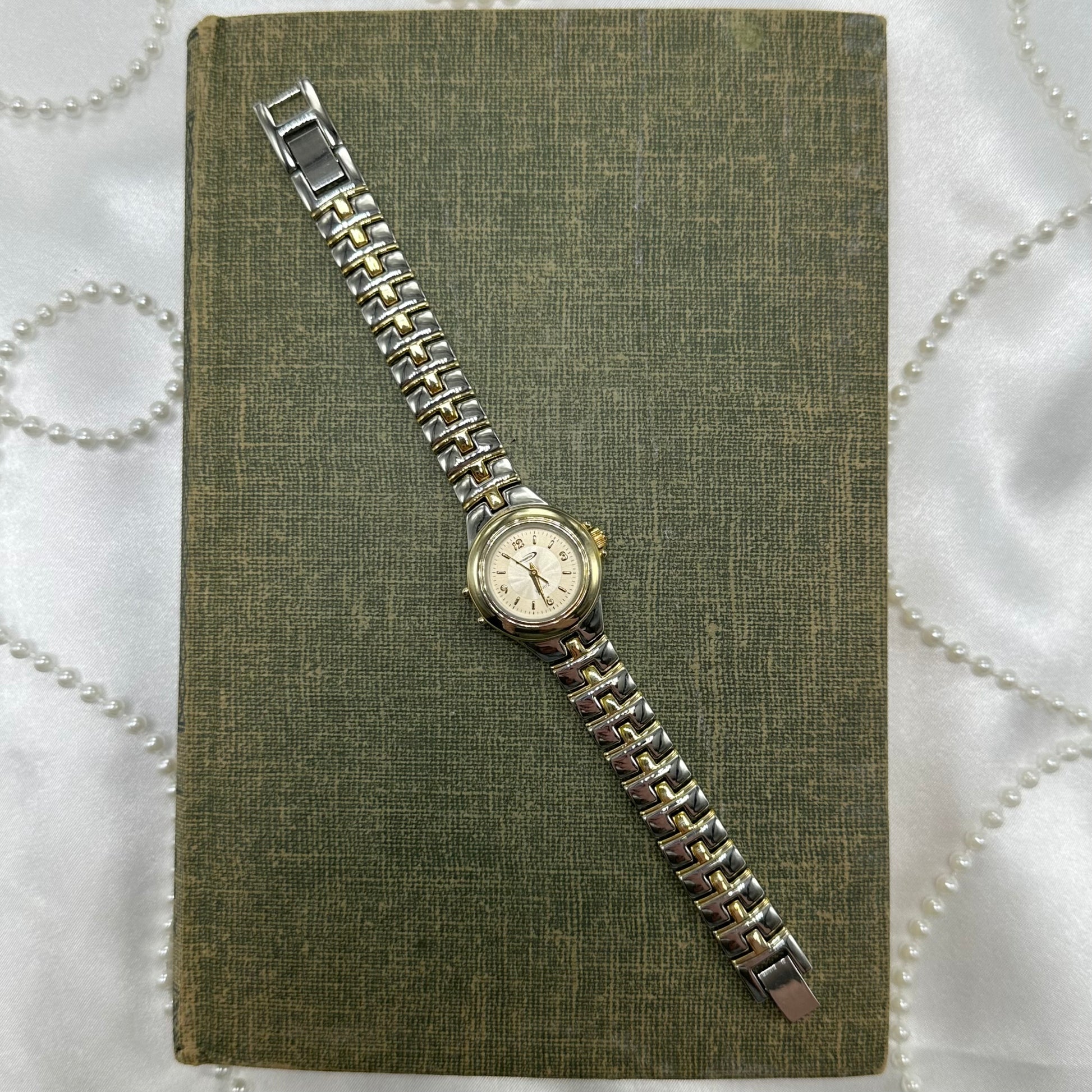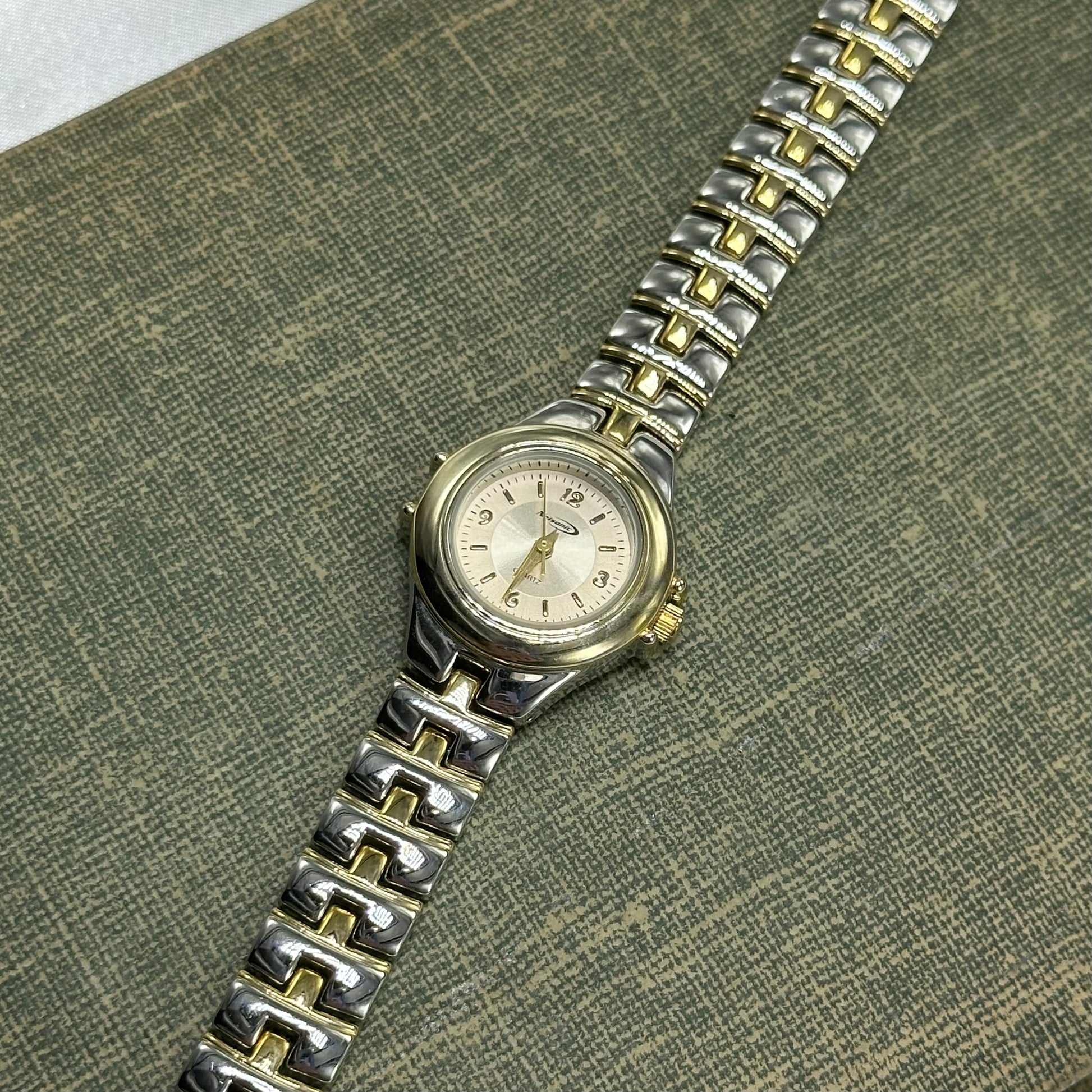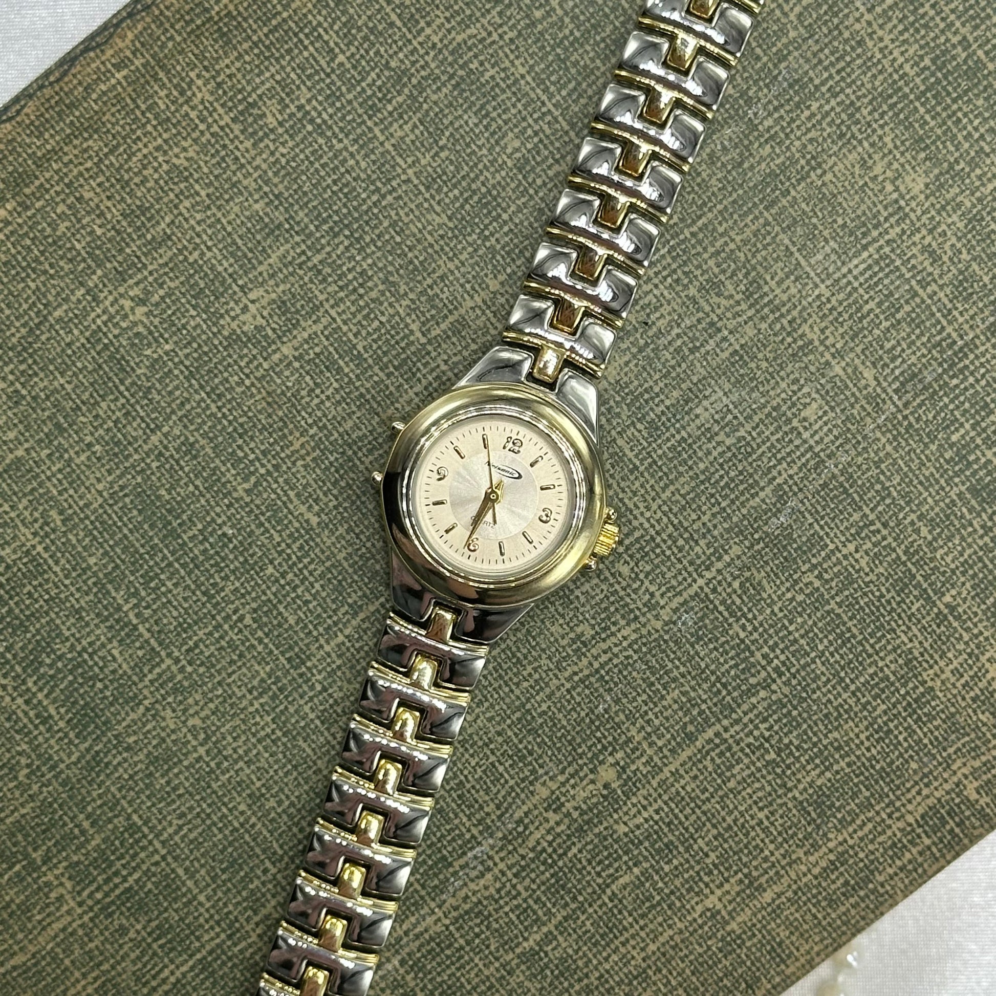 Silver and gold tone Nelsonic watch with two-tone clasp band and quartz movement.