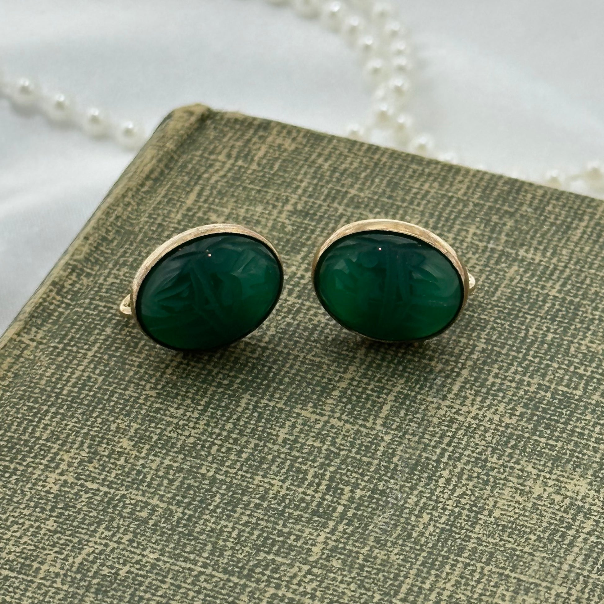 Vintage clip on screw back earrings with green scarabs. 1/20 - 12 kt. gold filled. Medium size.