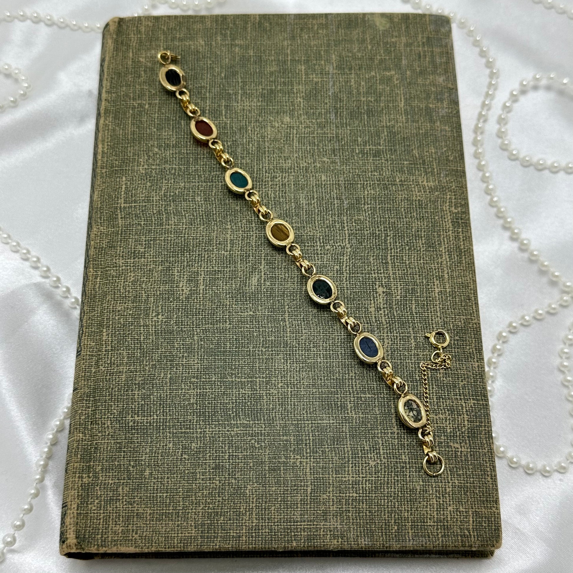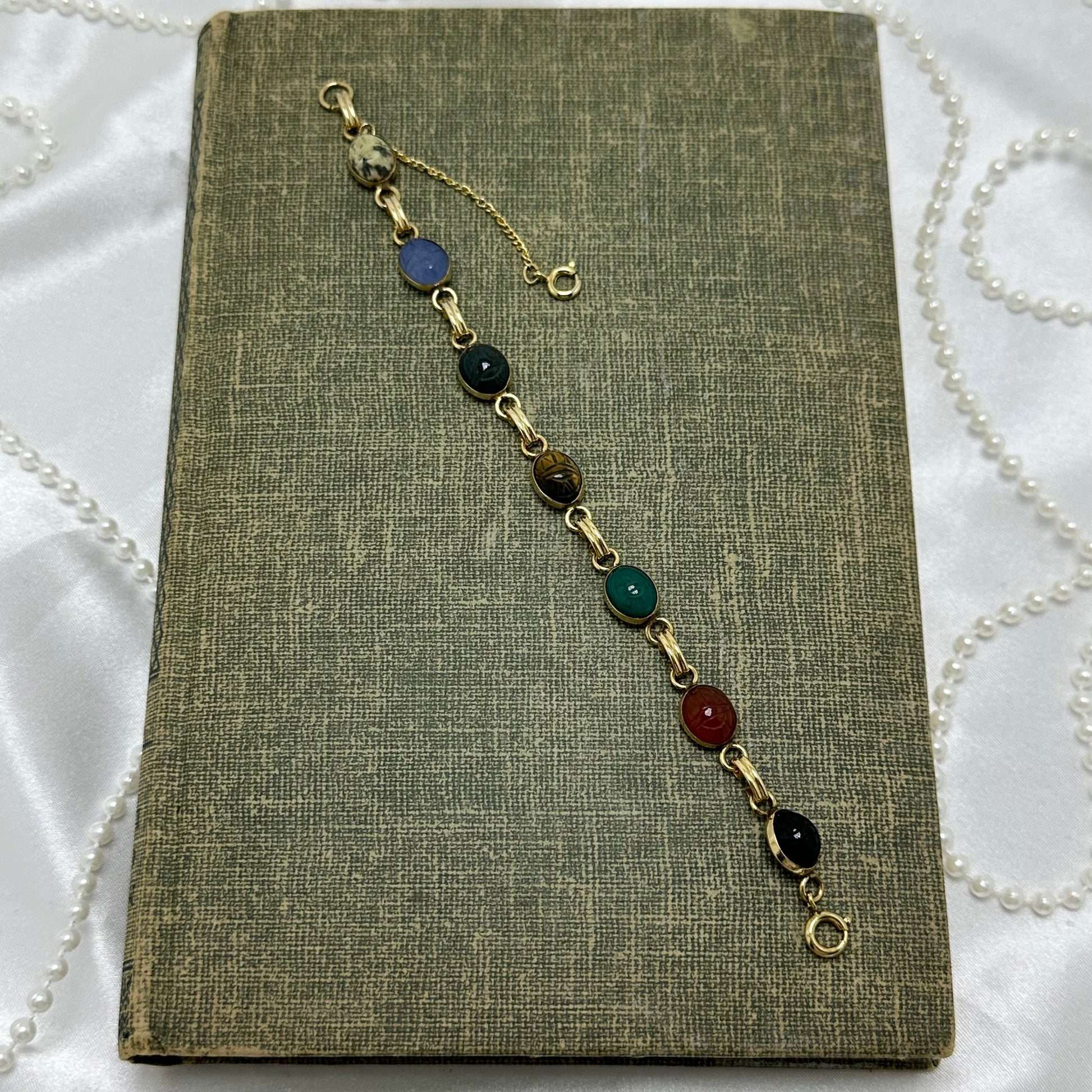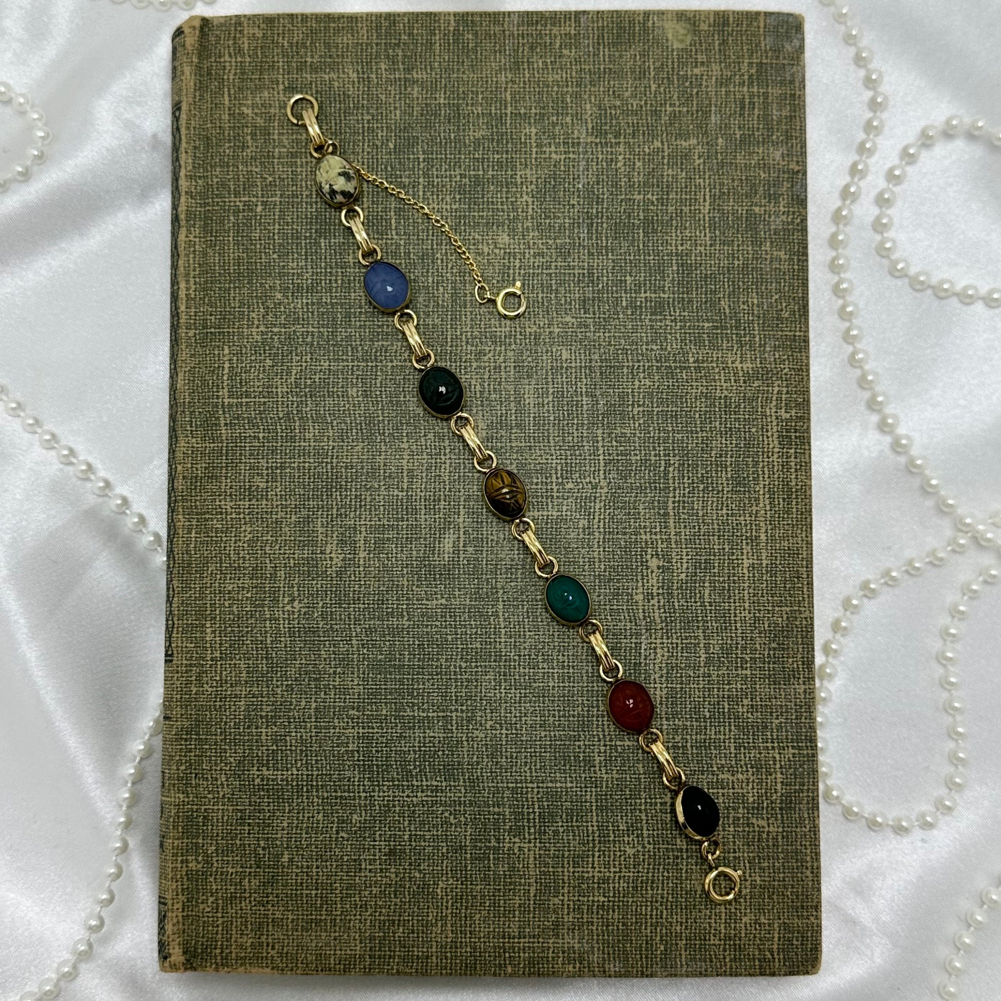Dainty vintage gold filled bracelet with multicolor scarabs and safety chain.